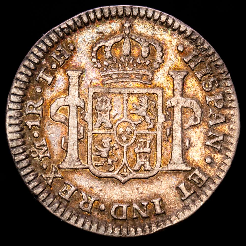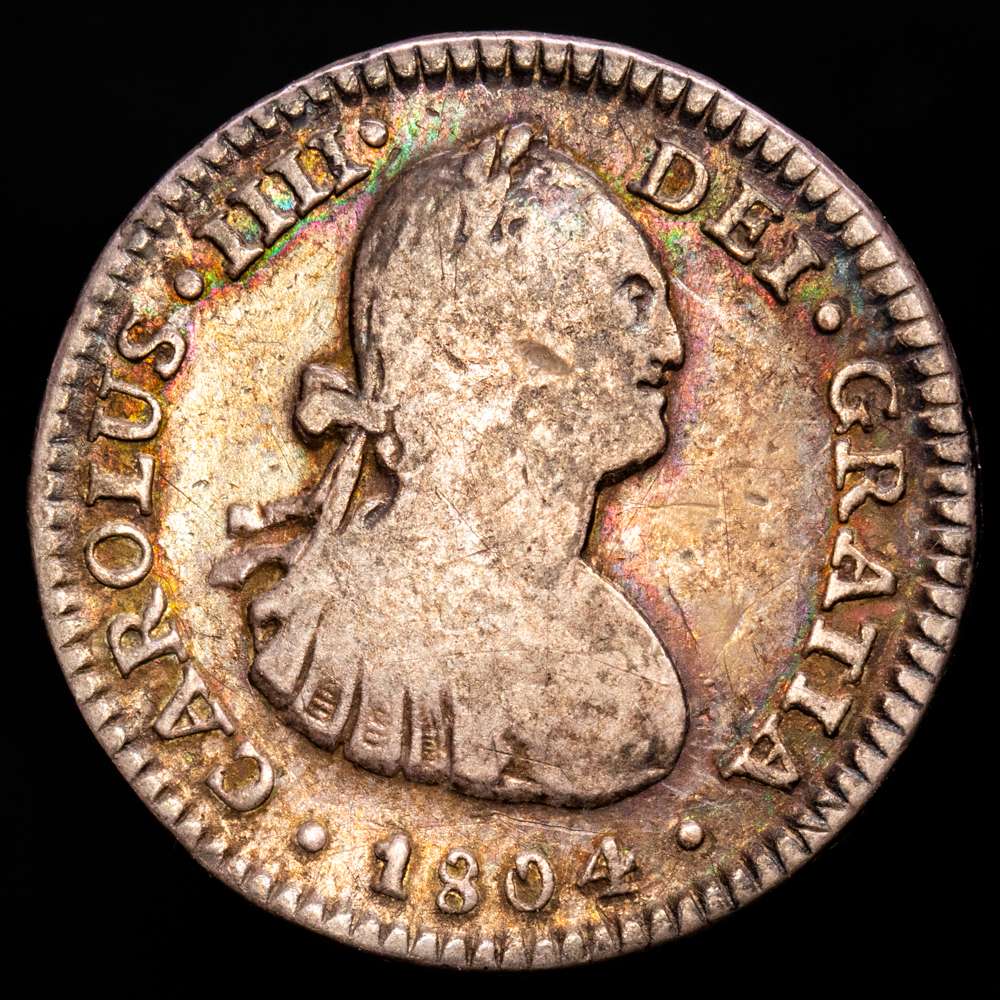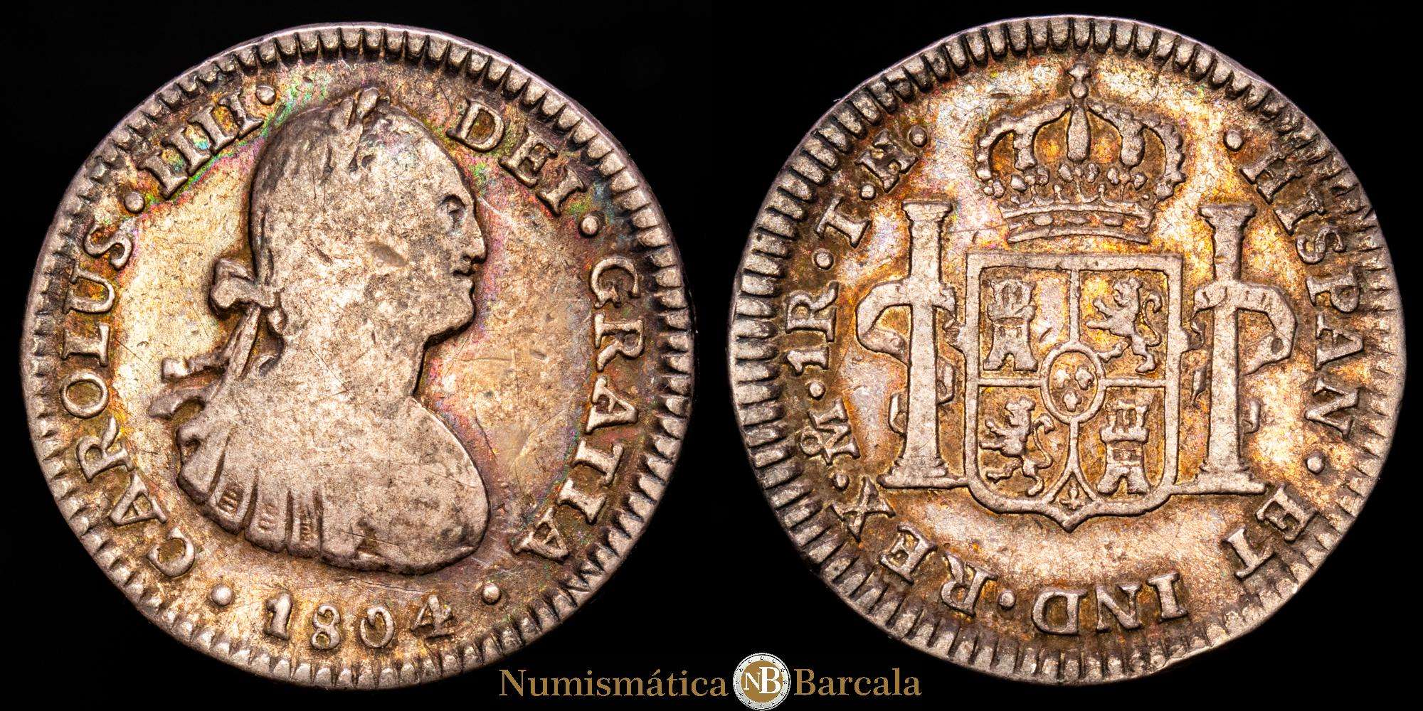 Numismática Barcala > Productos > Carlos IV (1788-1808). 1 real. 1804. México. TH. (Cal-451). Ag. 3,16 g. Bella pátina irisada. MBC-.