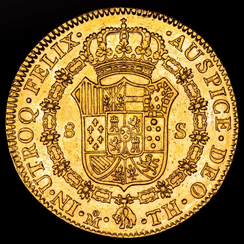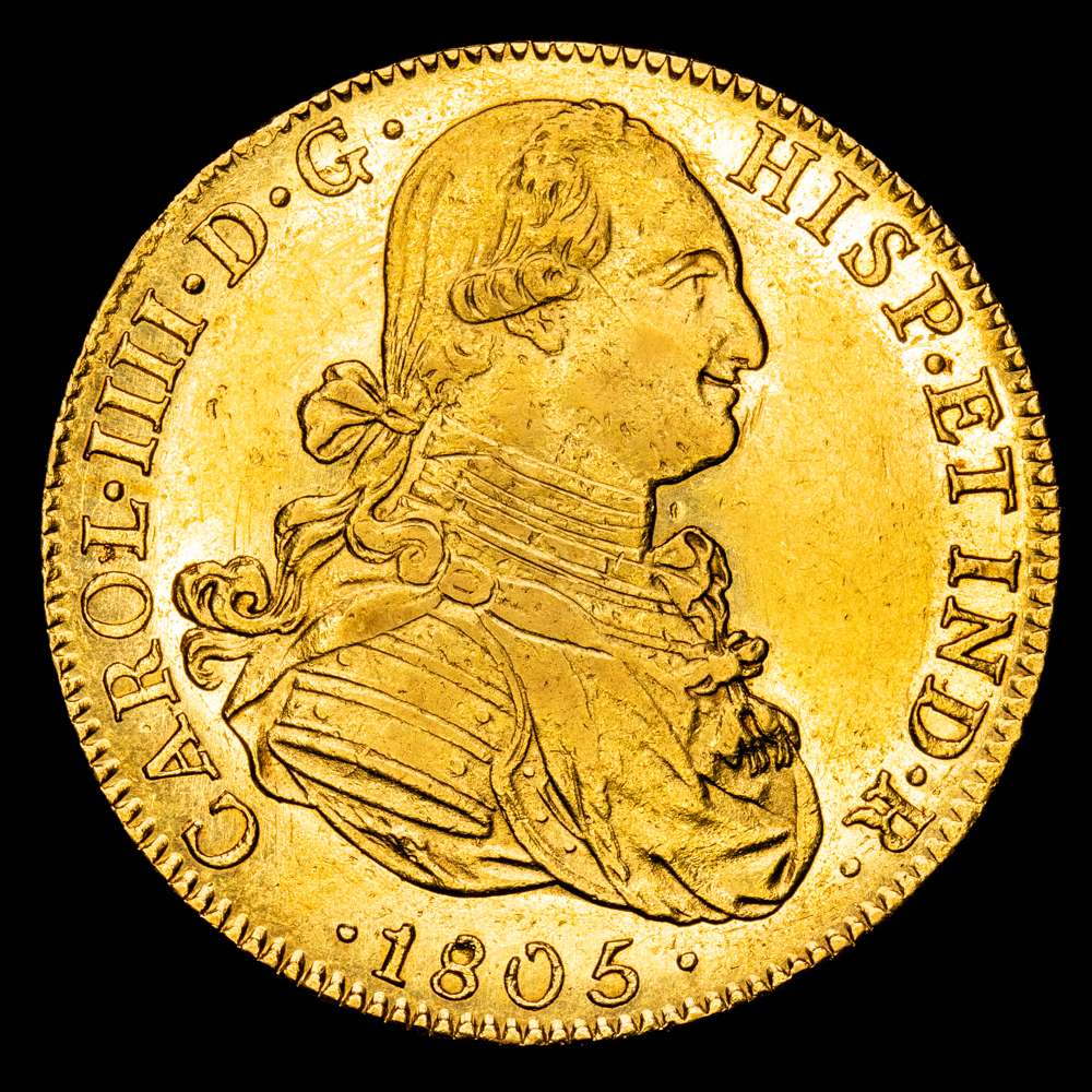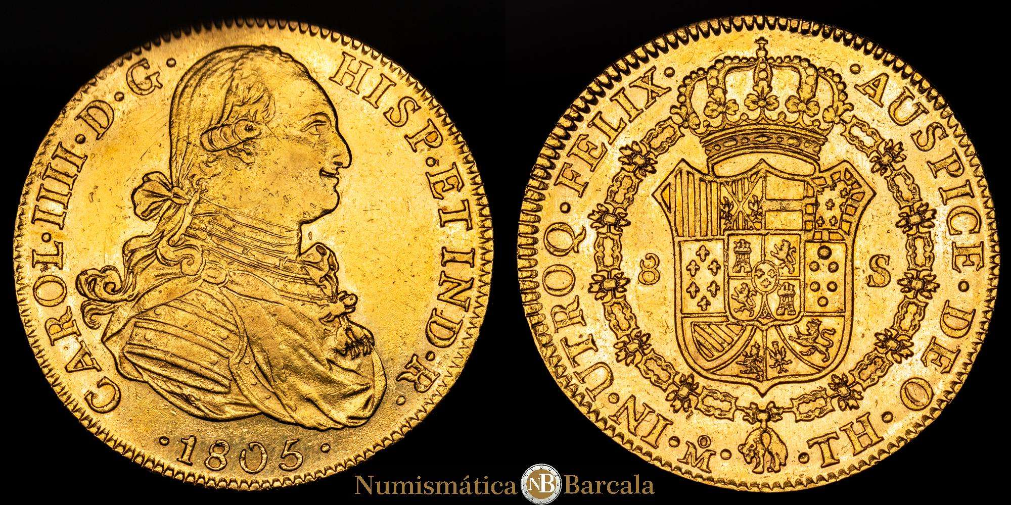 Numismática Barcala > Productos > Carlos IV (1788-1808). 1805 TH. México. 8 escudos. (CA 1649).(Cal onza-1041). 27,05 gramos. AU. Busto propio. Brillo original. Muy bonita. EBC/EBC+.