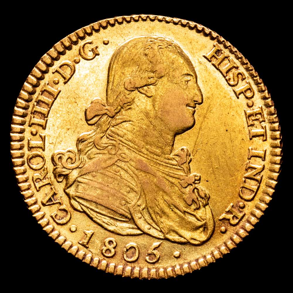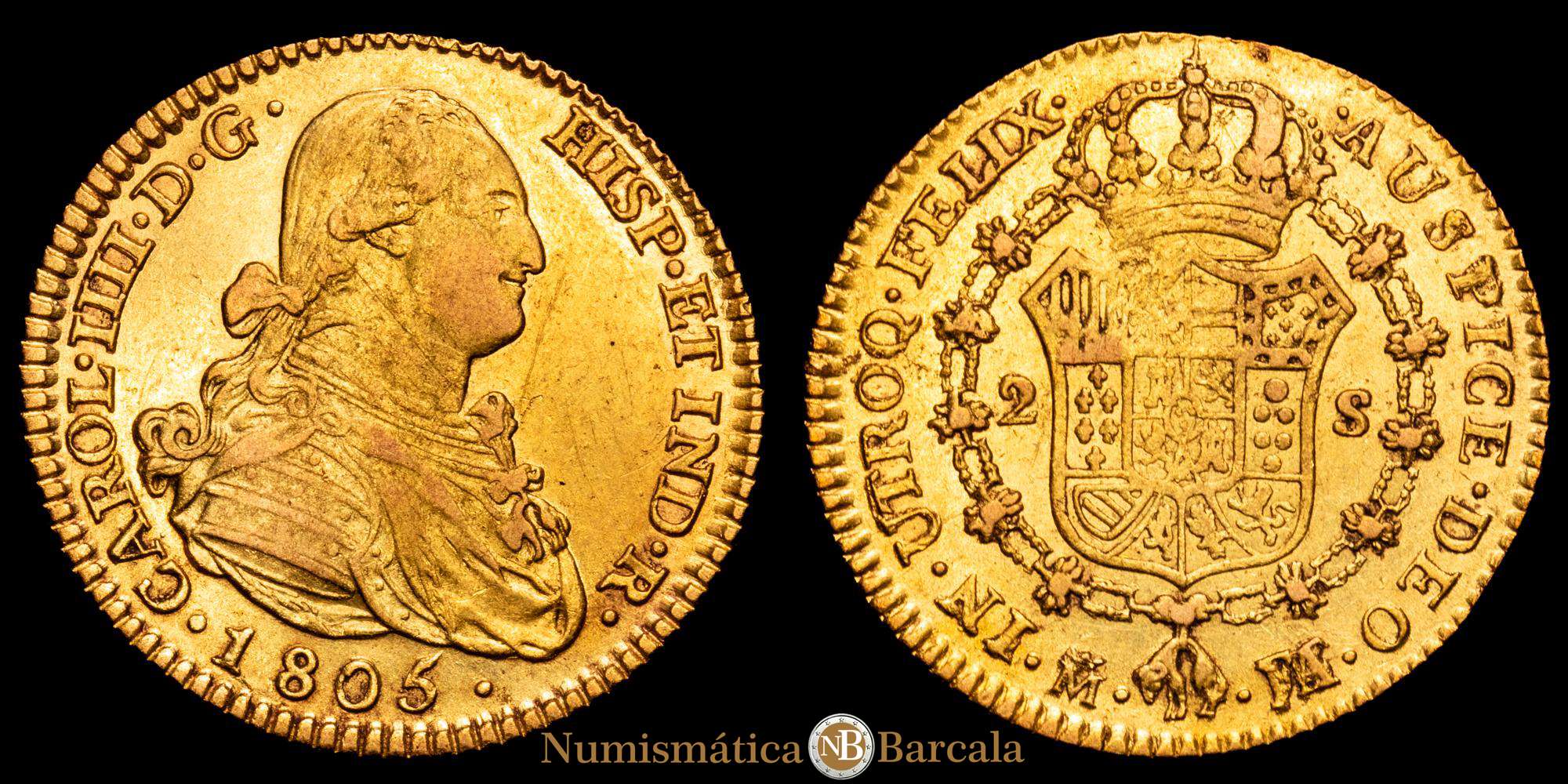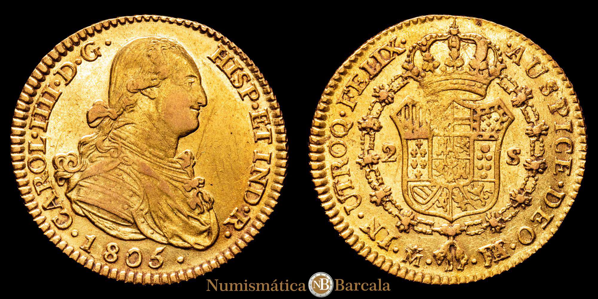 Numismática Barcala > Productos > Carlos IV (1788-1808). 2 escudos. 1805. Madrid. FA/MF. (Cal-1311). Au. 6,68 gramos. Clara rectificación del ensayador. MBC+.