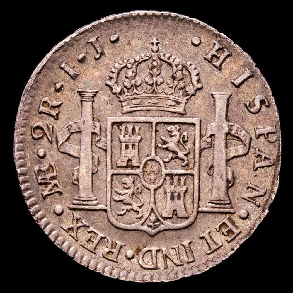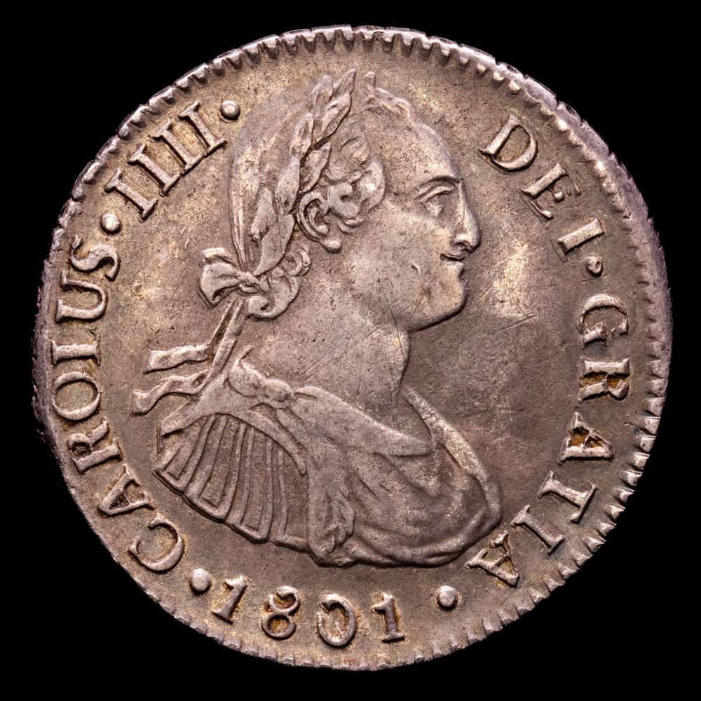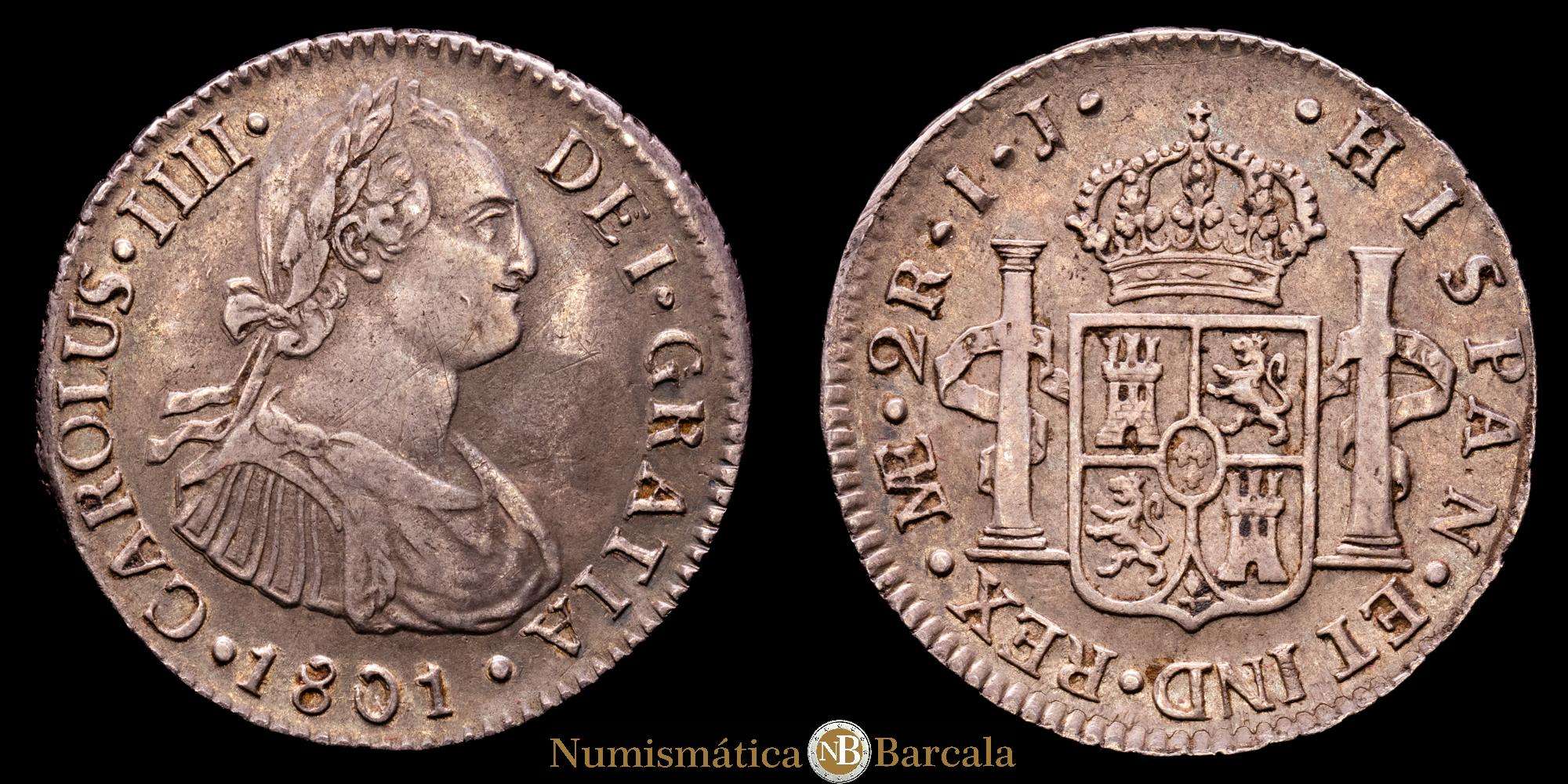 Numismática Barcala > Productos > Carlos IV (1788-1808). 2 reales. 1801. Lima. IJ. (Cal-584). Ag. 6,63 g. Pátina. Escasa así. MBC+.