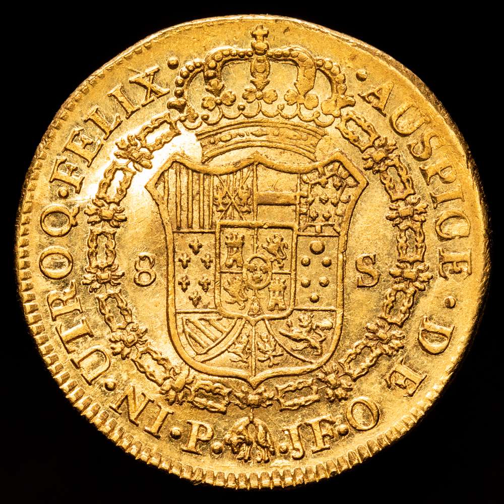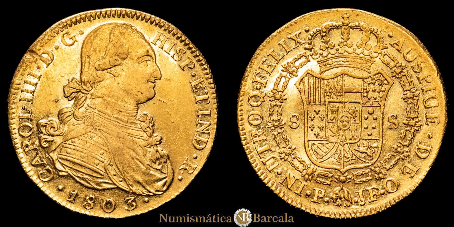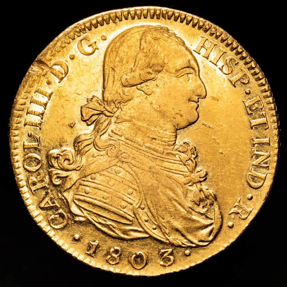 Carlos IV (1788-1808). 8 escudos. 1803. Popayán. JF. (Cal-1677).(Cal onza-1066).(Restrepo-98-26). Au. 27,04 g. Fallo de fábrica en grafila del reverso. Leves marquitas. EBC/EBC+, brillo original en el anverso y en el reverso. Bellísimo ejemplar.