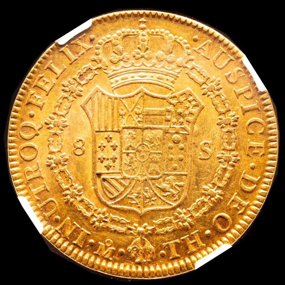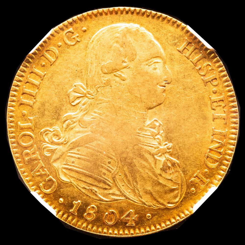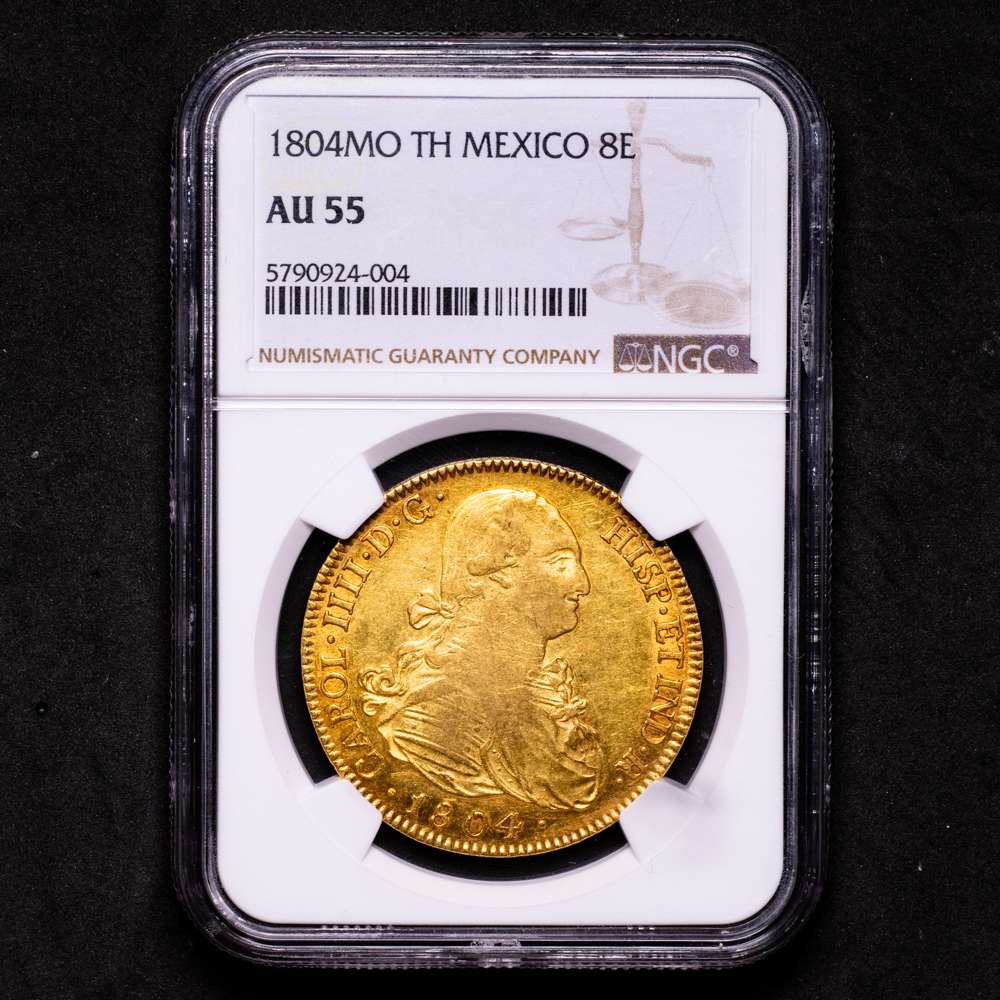 Numismática Barcala > Productos > Carlos IV (1788-1808). 8 escudos. 1804. México. TH. (Cal-1648). (Cal onza-1040). Au. Bonito color y restos de brillo original. Encapsulada por NGC como AU 55.