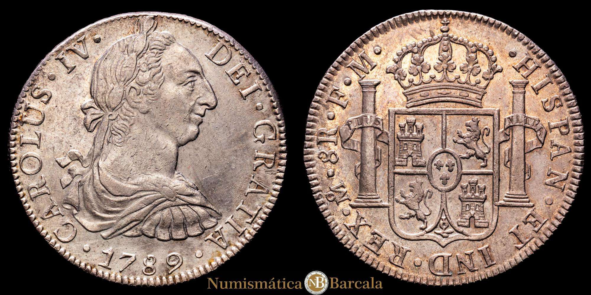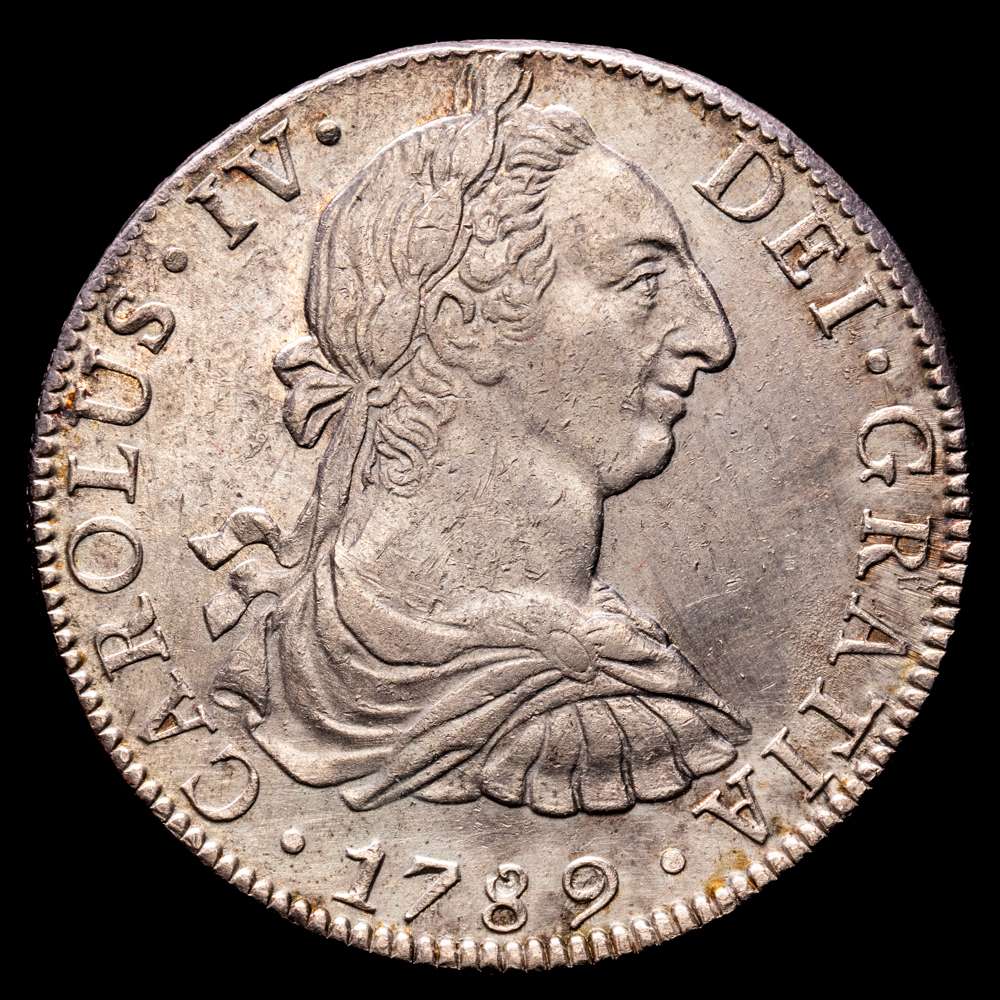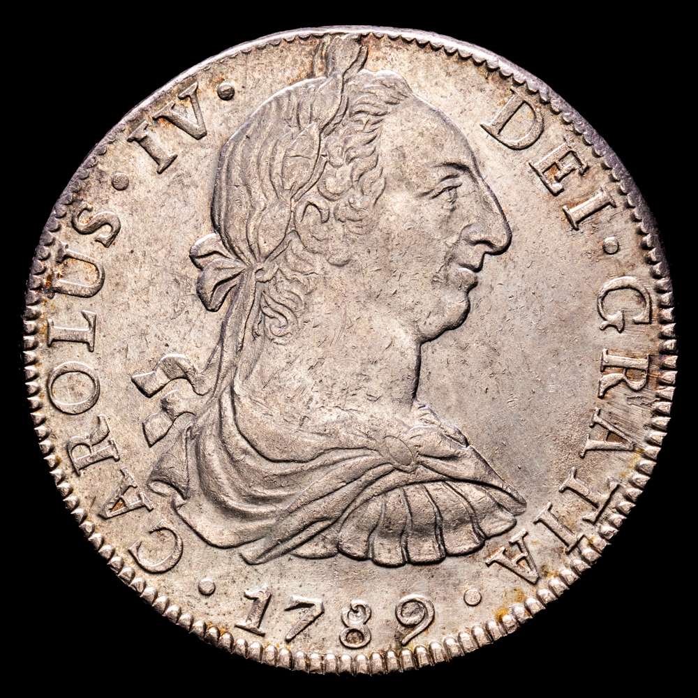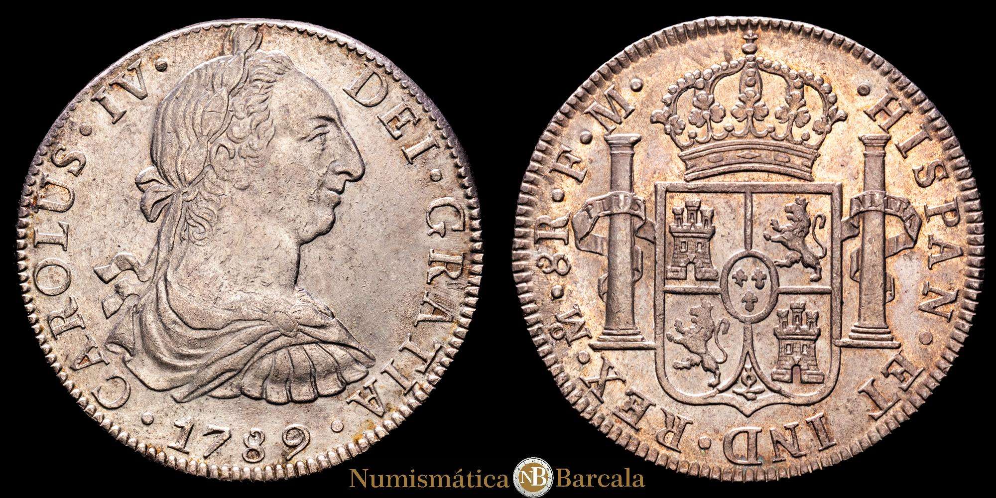 Numismática Barcala > Productos > Carlos IV (1788-1808). 8 reales. 1789. México. FM. (Cal-950). Ag. 27,01 gramos. Busto de Carlos III y ordinal IV. Suave pátina. Atractiva. Muy escasa así. EBC/EBC+.