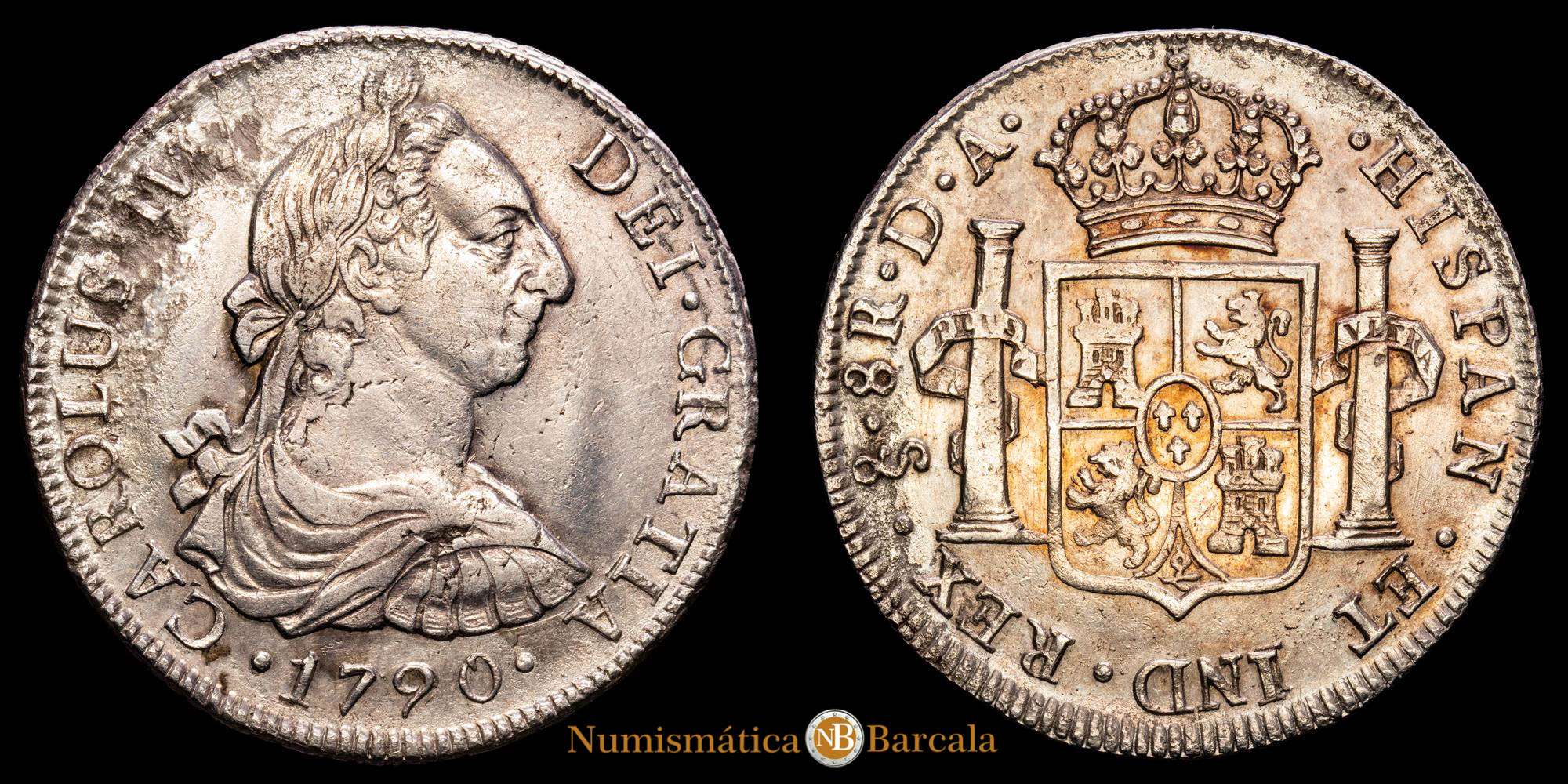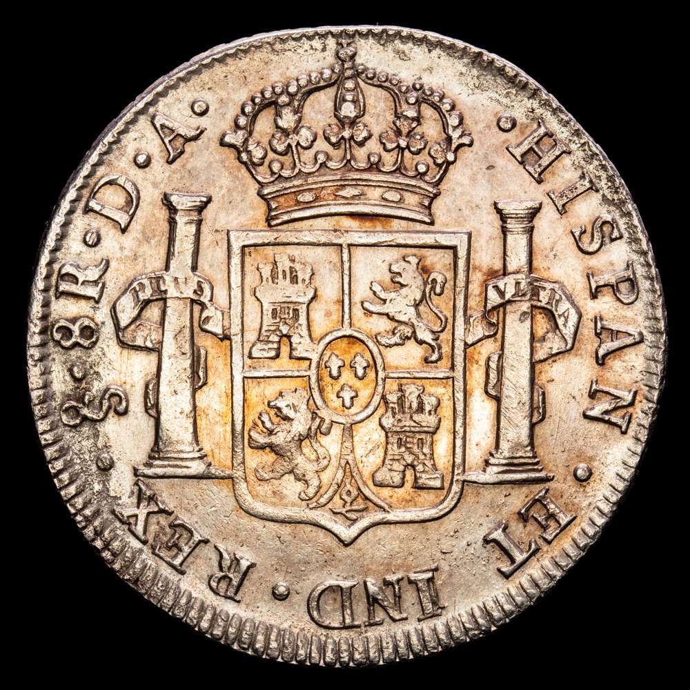 Carlos IV (1788-1808). 8 reales. 1790. Santiago. DA. (Cal-1017). Ag. 26,72 gramos. Busto de Carlos III y Ordinal IV. Ligera pátina en el reverso. Leve oxidación superficial en el anverso junto a la leyenda de Carolus IV, aún así muy buen ejemplar de este raro tipo transicional tan buscado por los coleccionistas de este período. Muy raro. MBC+.