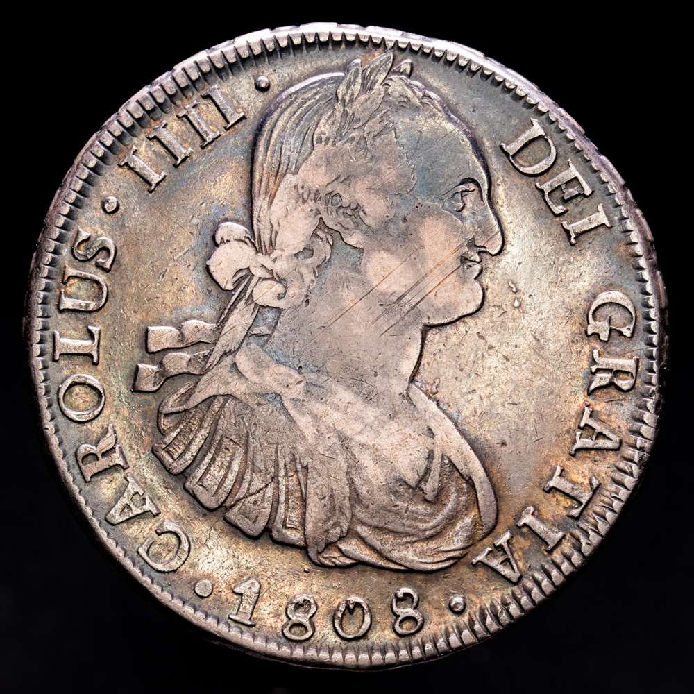 Carlos IV (1788-1808). 8 Reales. (26,91 g.). Santiago de Chile. 1808. F·J. AC-1049. MBC+. Variante sin punto entre DEI GRATIA. Pátina oscura. Escasa. Ex. Ponterio 46 “The Viceroyal Amat Collection” 8 Marzo 1991, n. 46.