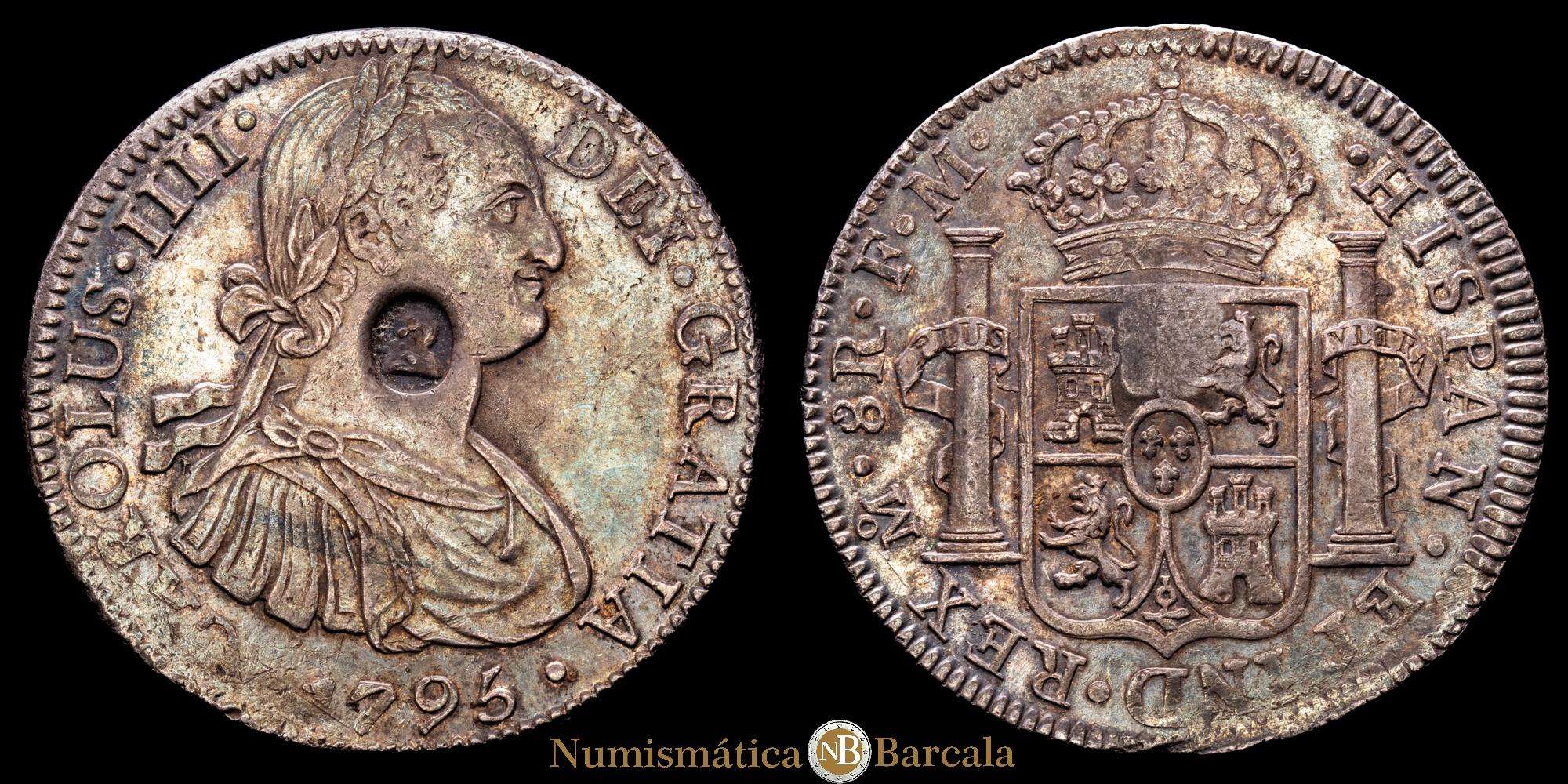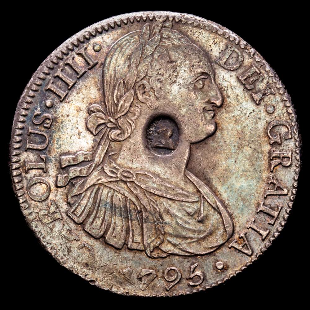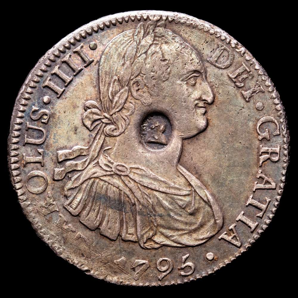 Carlos IV (1788-1808). Resello oval del Banco de Inglaterra con el rostro de Jorge III para circular por valor de 5 chelines, realizado en 1797 sobre una moneda de 8 reales acuñada en 1795 por la ceca de México durante el reinado de Carlos IV. Este resello trajo un malestar latente en el pueblo inglés, dado que un real de a 8 resellado equivalía a una corona menos tres peniques, Concretamente a 4 chelines y 9 peniques (1 corona = 5 chelines; 1 chelín = 12 peniques). Generó algunas frases humorísticas como “El Banco (de Inglaterra) para hacer pasar su dinero, estampó la cabeza de un tonto en el cuello de un asno”. (Km-634). (S-3765A). Ag. 27,01 gramos. Pátina oscura. VF+.