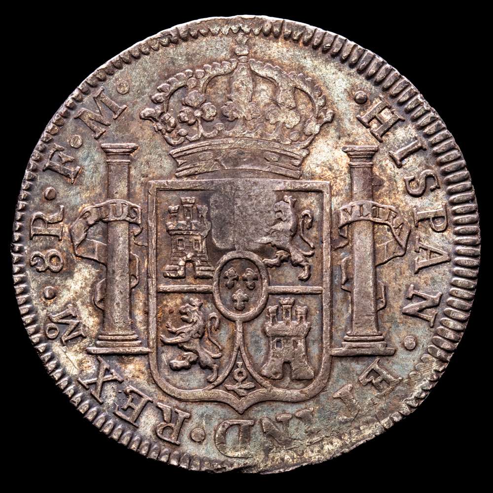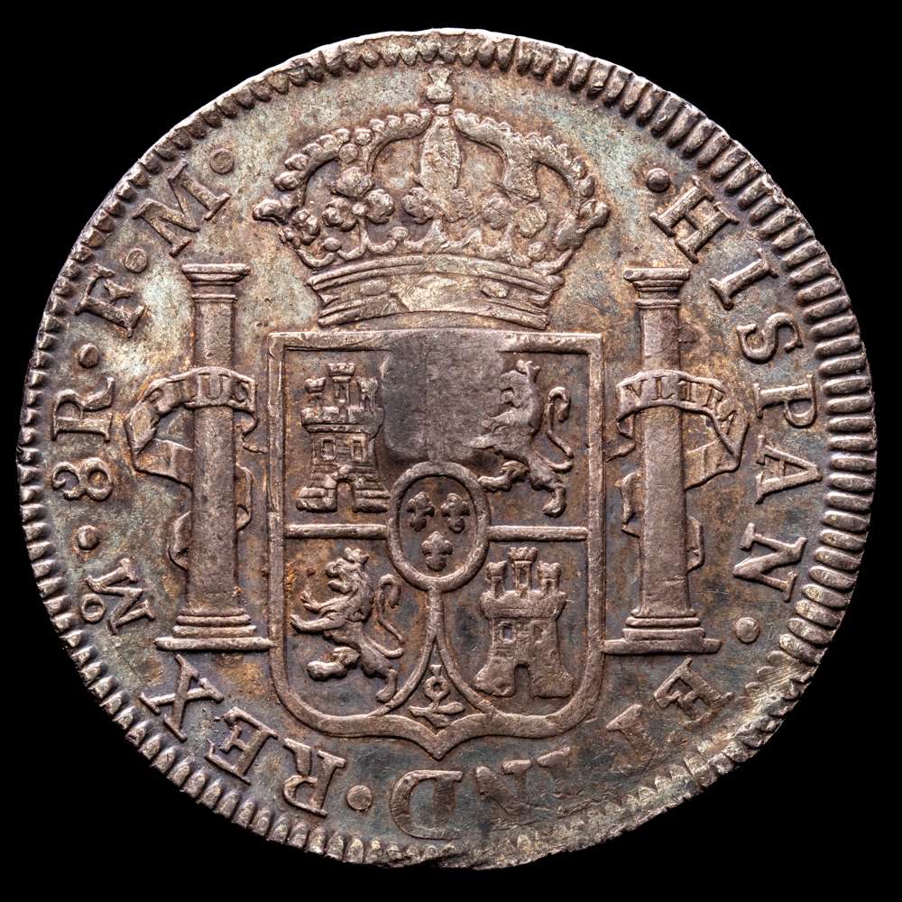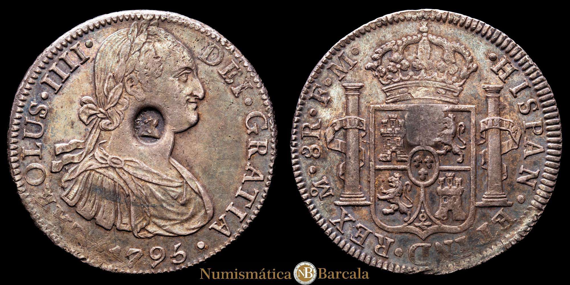 Carlos IV (1788-1808). Resello oval del Banco de Inglaterra con el rostro de Jorge III para circular por valor de 5 chelines, realizado en 1797 sobre una moneda de 8 reales acuñada en 1795 por la ceca de México durante el reinado de Carlos IV. Este resello trajo un malestar latente en el pueblo inglés, dado que un real de a 8 resellado equivalía a una corona menos tres peniques, Concretamente a 4 chelines y 9 peniques (1 corona = 5 chelines; 1 chelín = 12 peniques). Generó algunas frases humorísticas como “El Banco (de Inglaterra) para hacer pasar su dinero, estampó la cabeza de un tonto en el cuello de un asno”. (Km-634). (S-3765A). Ag. 27,01 gramos. Pátina oscura. VF+.