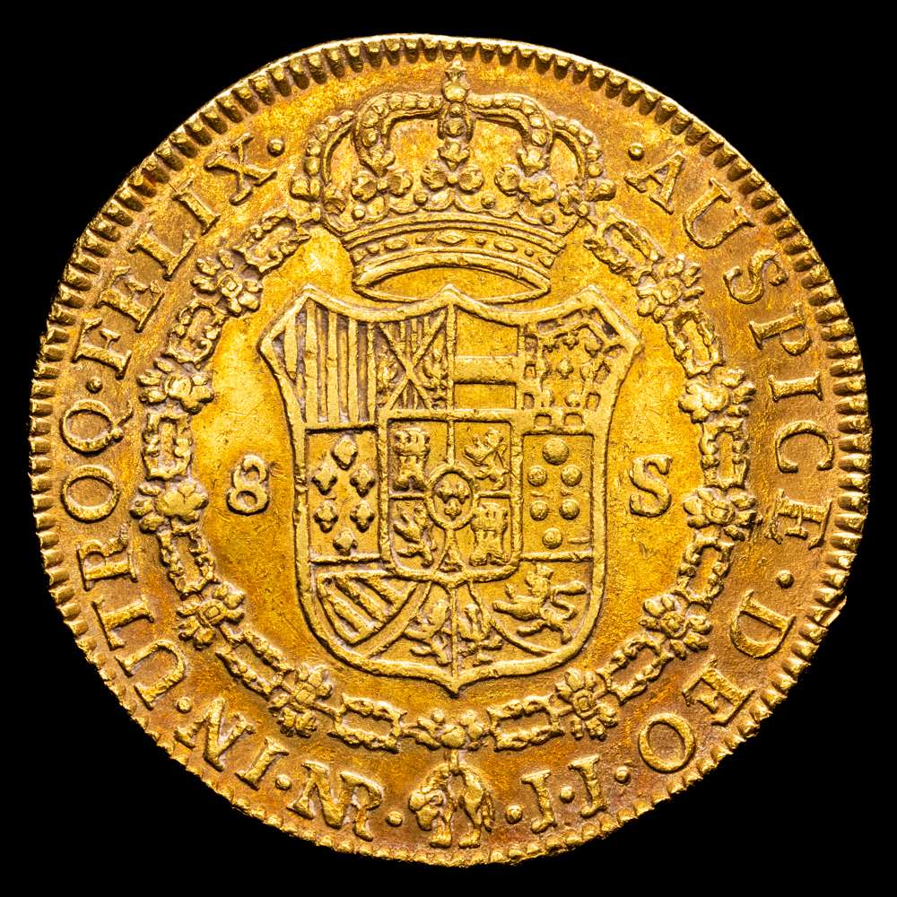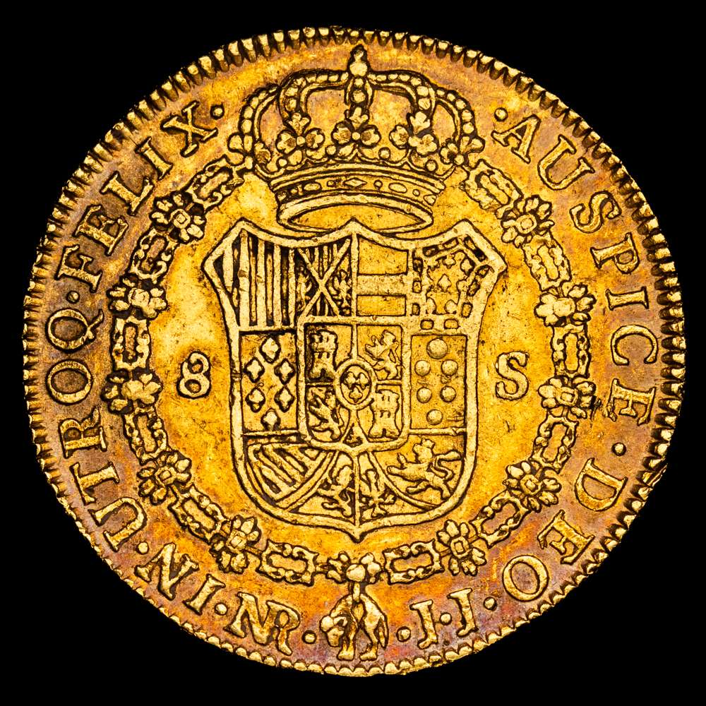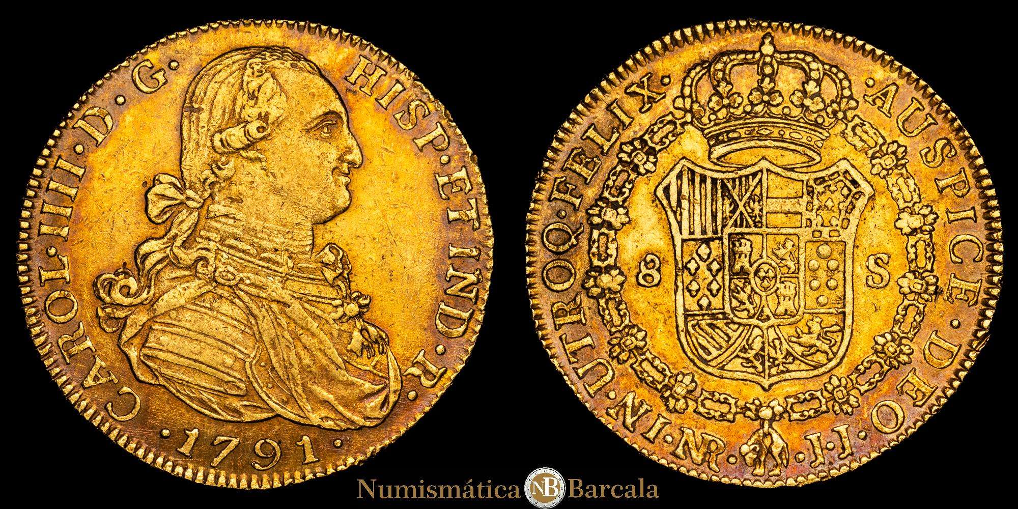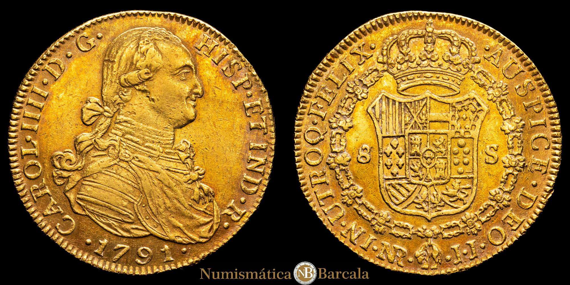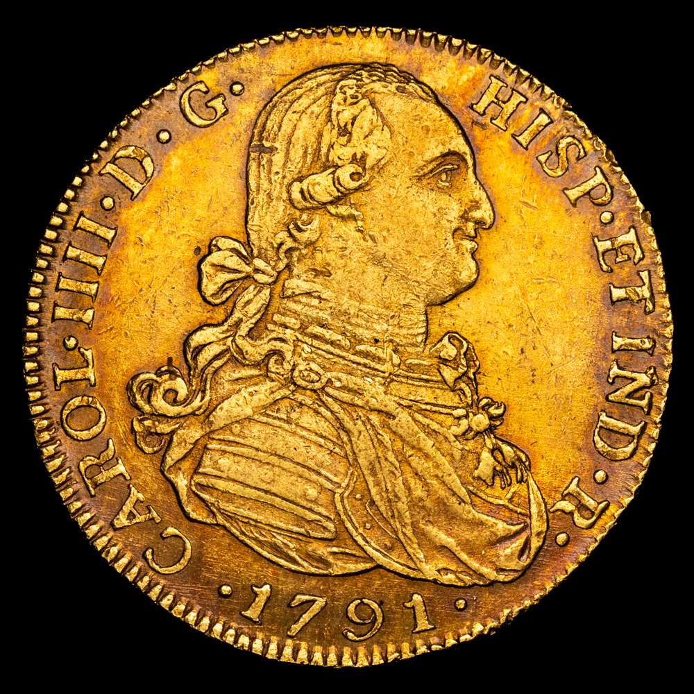 Carlos IV. 1791. Santa Fe de Nuevo Reino. J.J. 8 escudos. (AC. 1719) (Cal.Onza 11118) (Restrepo 97-2a). Primer año de busto propio. Punto delante de AUSPICE. 27,06 gramos. MBC+/EBC-. Precioso color.