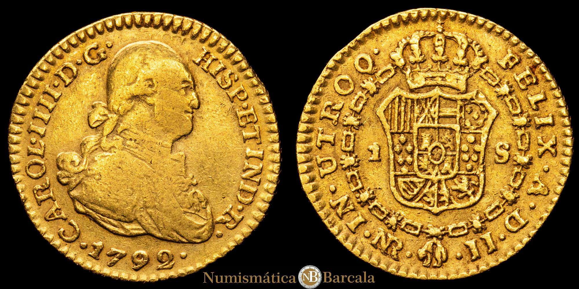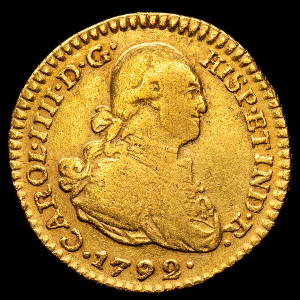 Numismática Barcala > Productos > Carlos IV. 1792 Santa Fe de Nuevo Reino. J.J. 1 escudo. (AC. 1198) (Restrepo 84-2). Primer año de busto propio, pocos ejemplares conocidos. 3,24 gramos. VF.