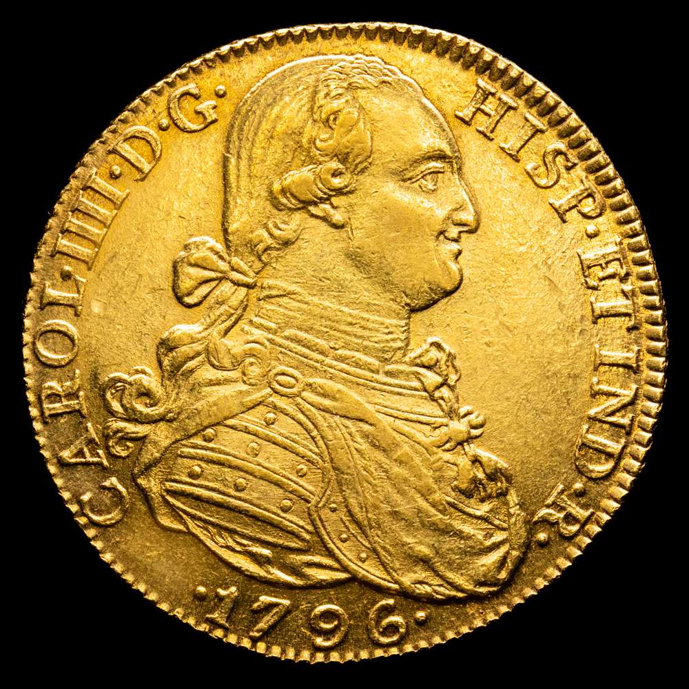 Carlos IV. 1796 Santa Fe de Nuevo Reino. J.J. 8 escudos. (AC. 1729) (Cal.Onza 1127) (Restrepo 97-14). 27,10 gramos. Precioso color, parte de brillo original. Buen y atractivo ejemplar, más para la serie. EBC+. Escasa en esta presentación.