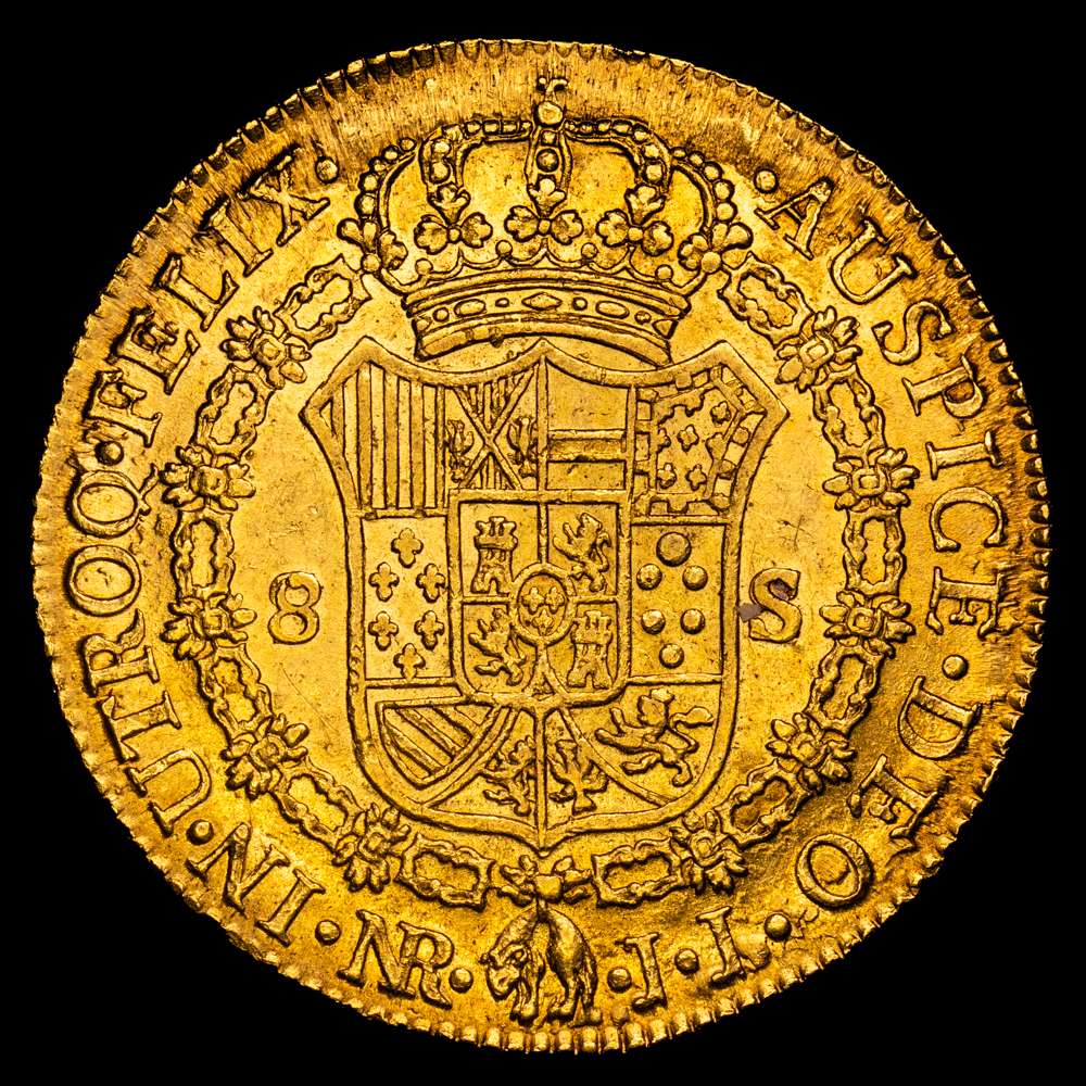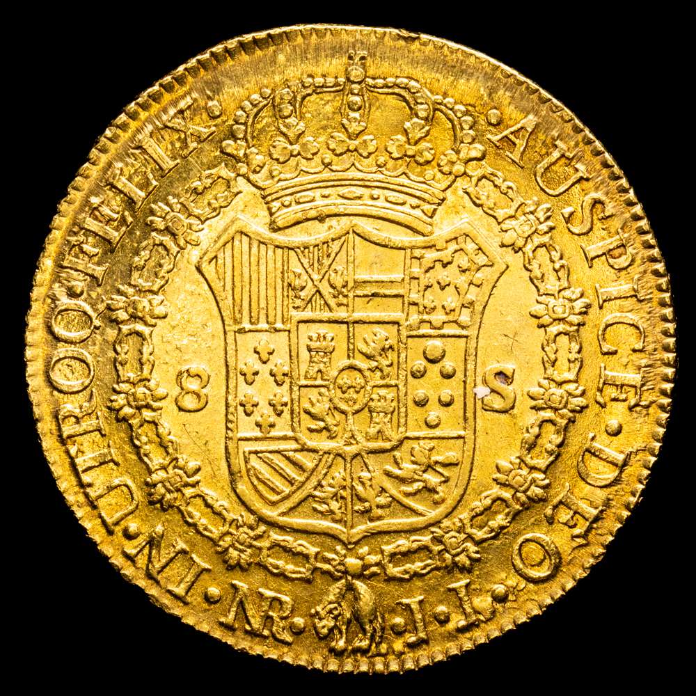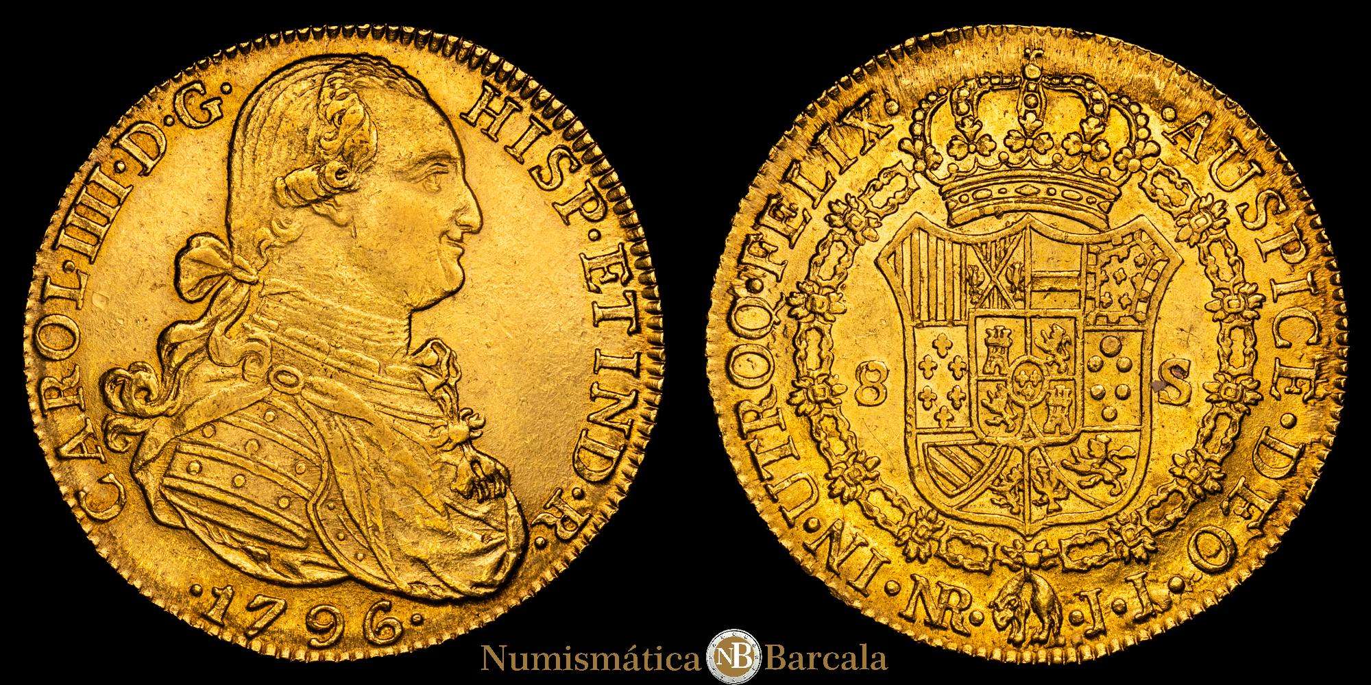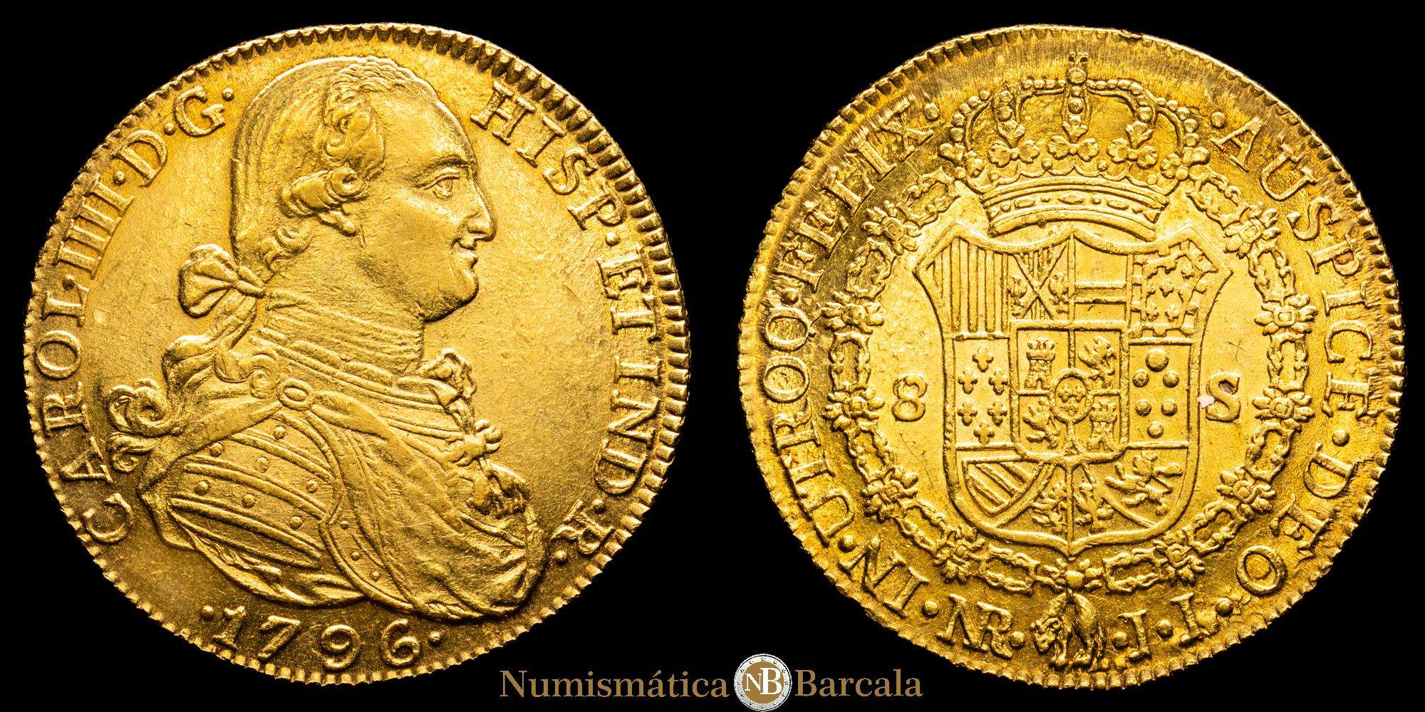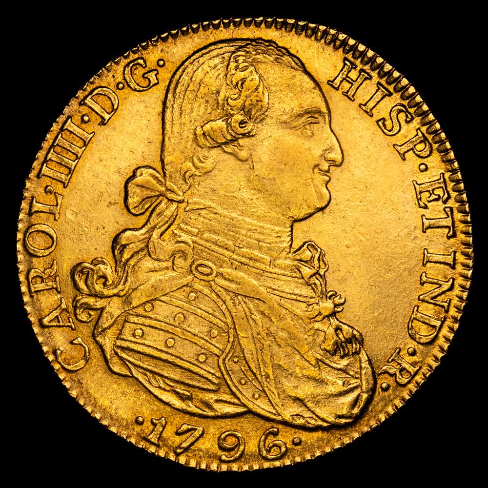 Carlos IV. 1796 Santa Fe de Nuevo Reino. J.J. 8 escudos. (AC. 1729) (Cal.Onza 1127) (Restrepo 97-14). 27,10 gramos. Precioso color, parte de brillo original. Buen y atractivo ejemplar, más para la serie. EBC+. Escasa en esta presentación.
