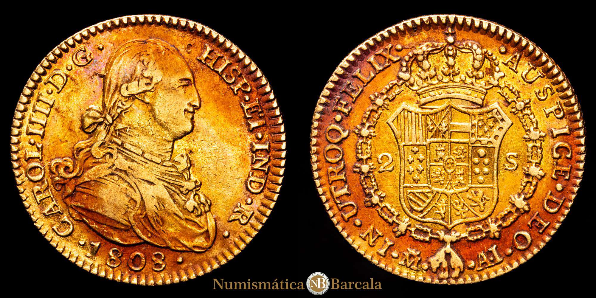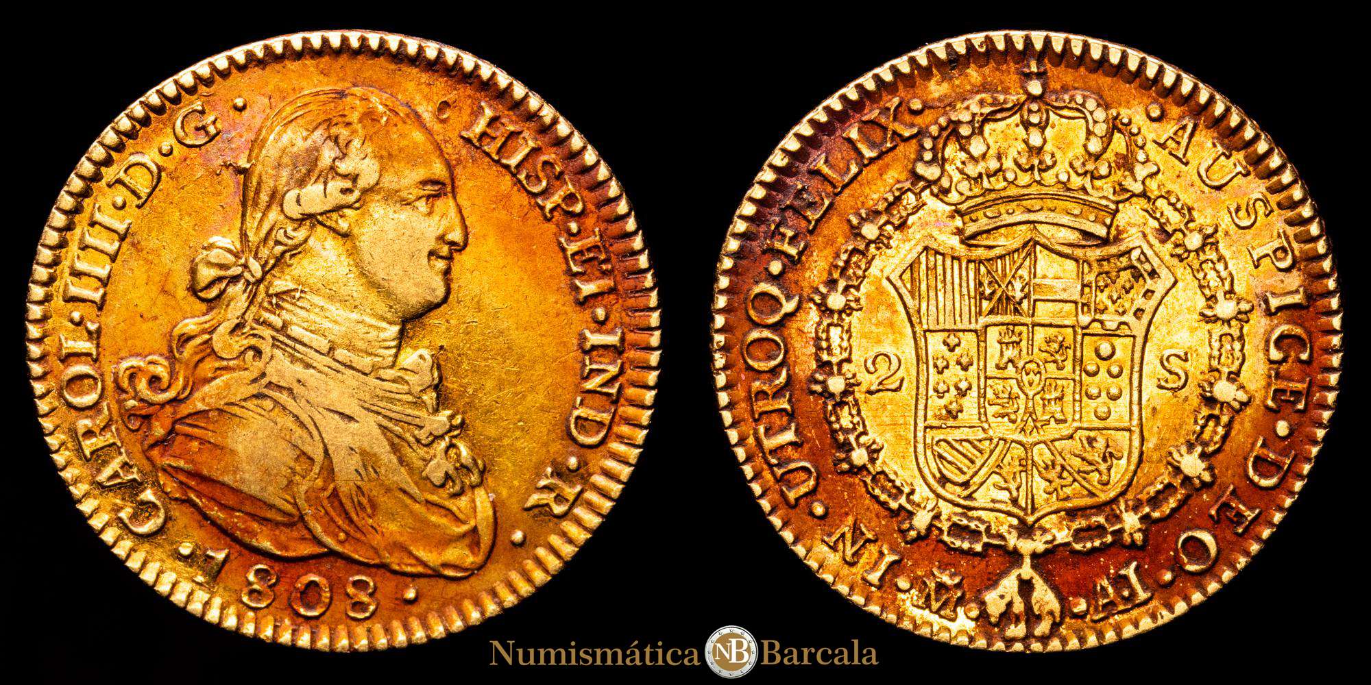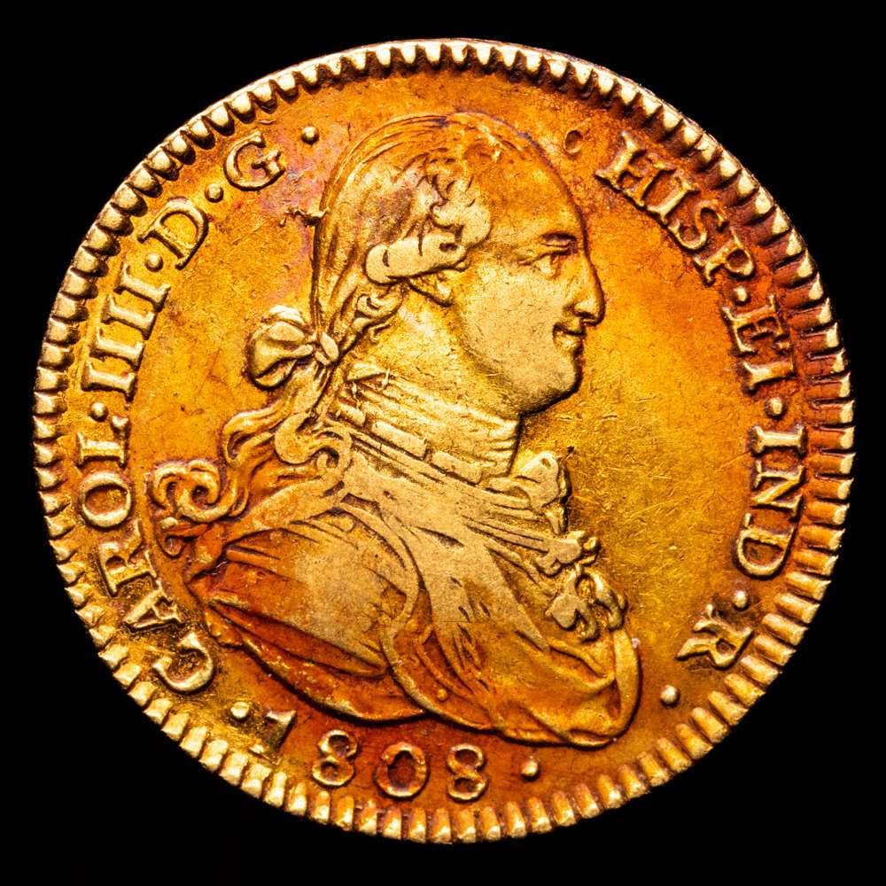 Carlos IV. 2 Escudos. (6,76 g.). Madrid. 1808. AC-1320. MBC+/EBC-. Bello color