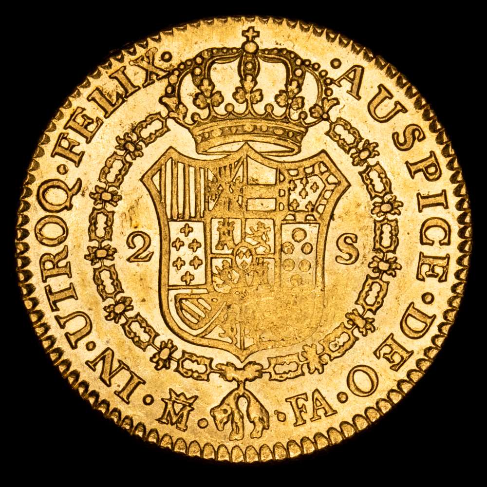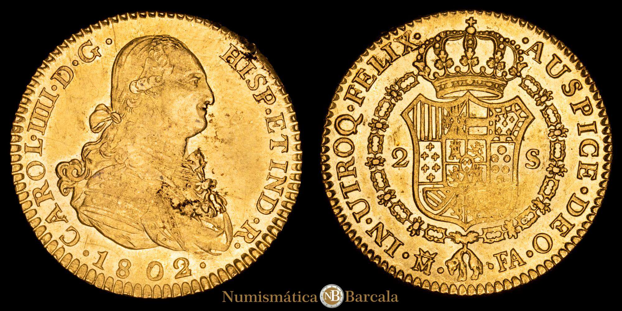 Carlos IV. 2 Escudos. (6,81 g.). Madrid. 1802/1. Ensyador F·A. AC-1304. EBC. Brillo original. Pequeñas marquitas en anverso pero buen ejemplar