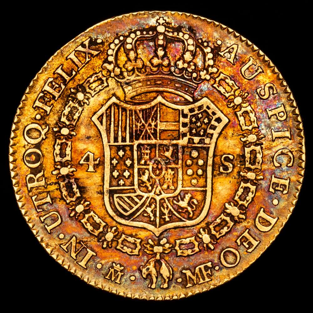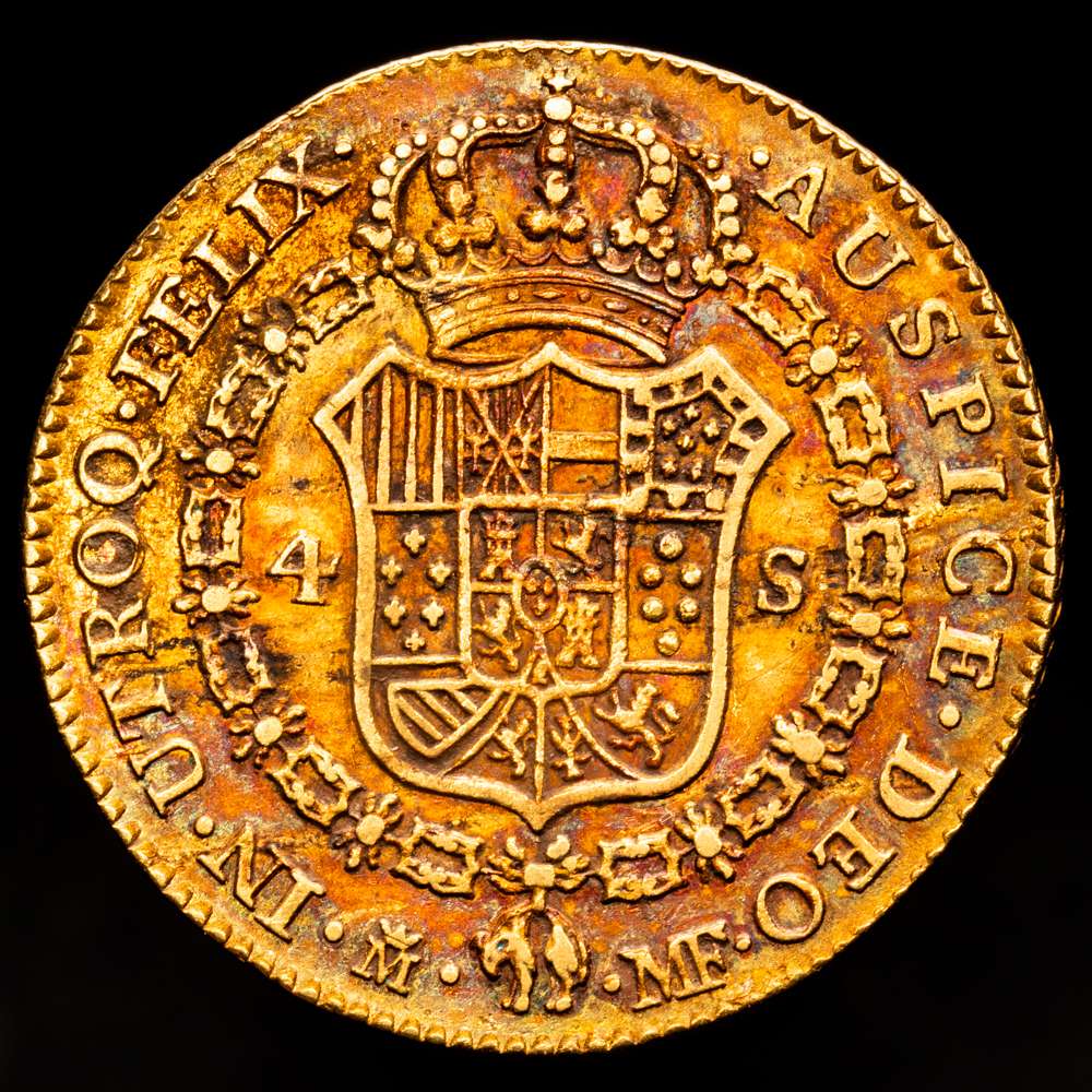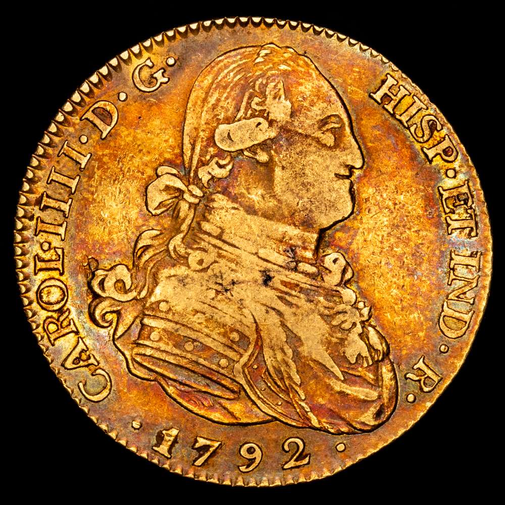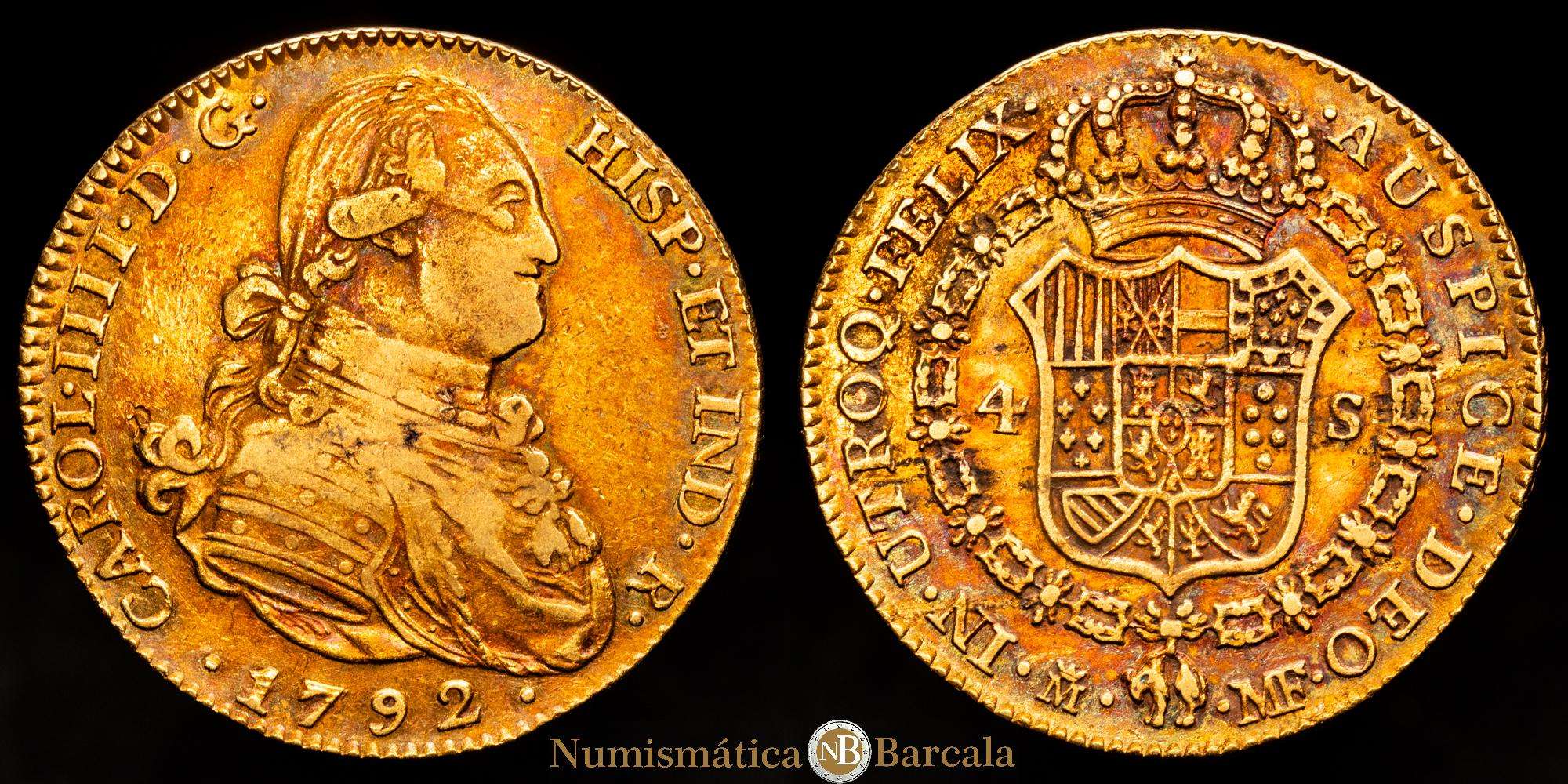 Numismática Barcala > Productos > Carlos IV. 4 Escudos. (13,51 gr.). Madrid. 1792. M·F. Bella pátina irisada. AC-1475. MBC.