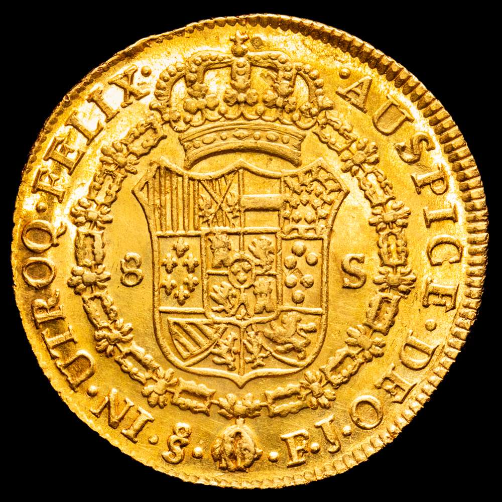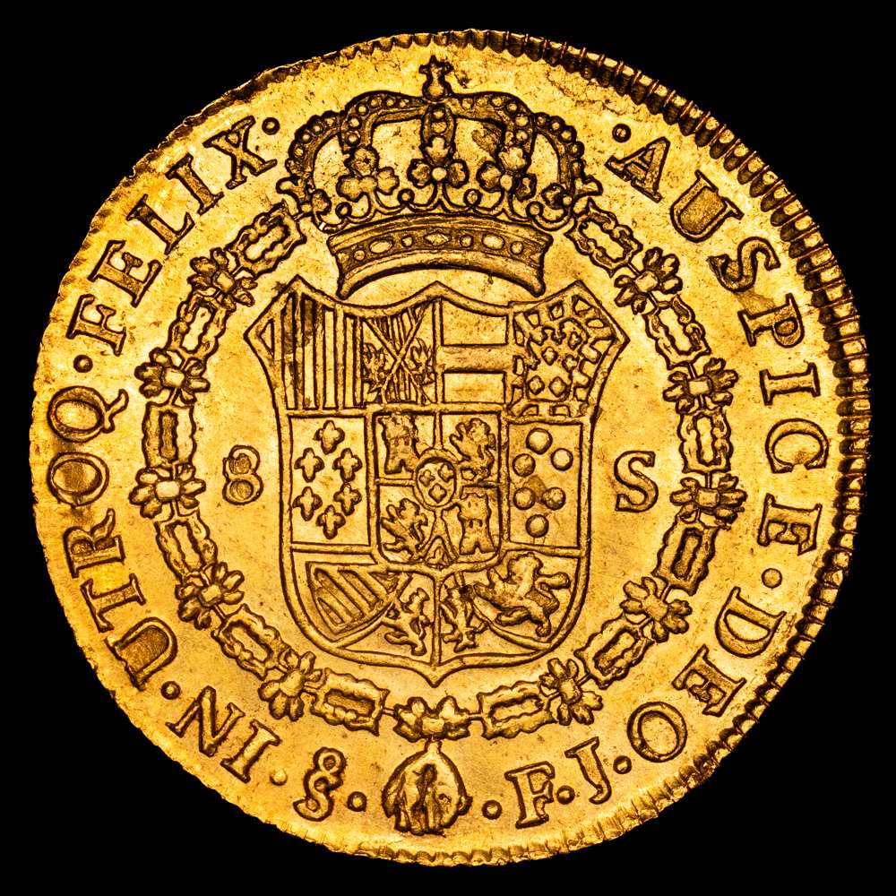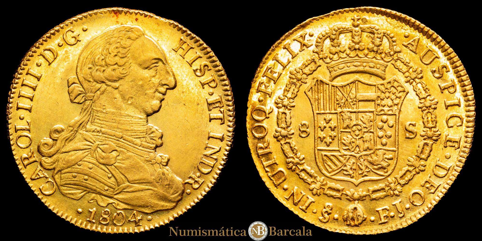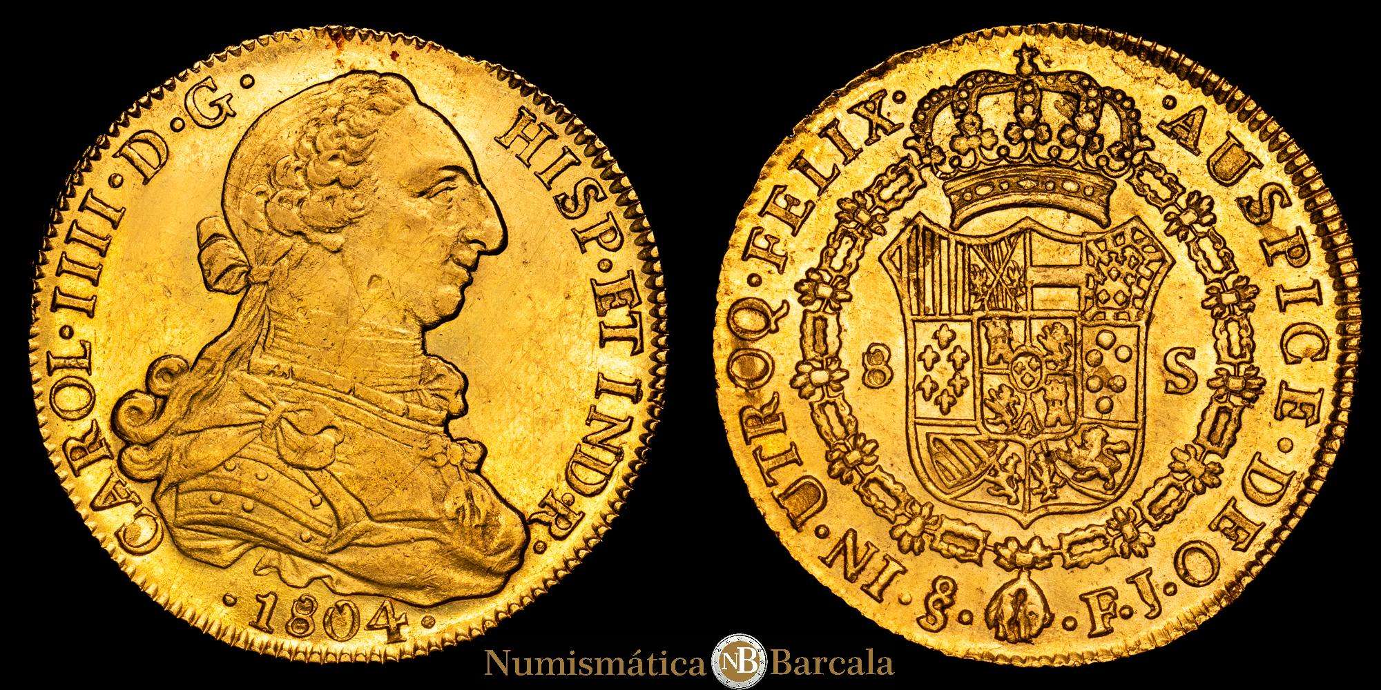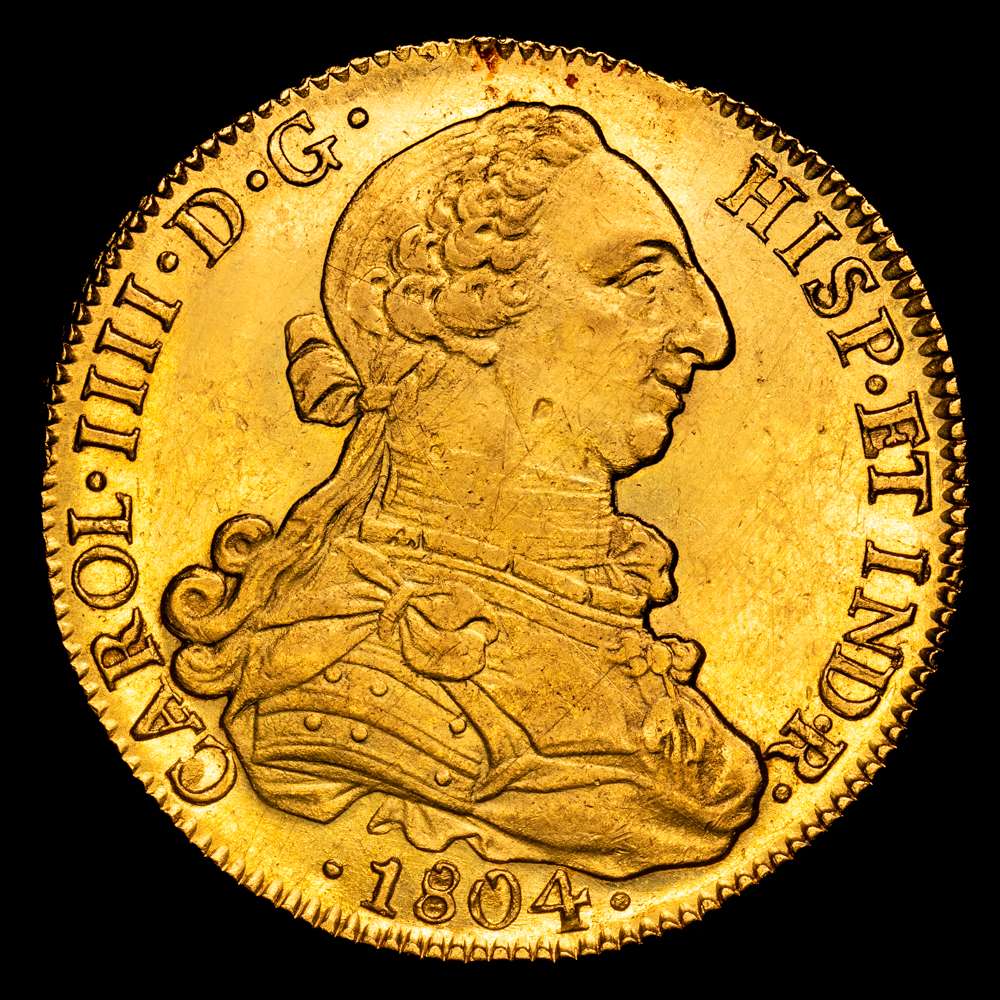 CARLOS IV. 8 escudos. 1804. Santiago. FJ. UA 27,19 g. 36,9 milímetros. (AC. 1774) (Cal.Onza 1176). Punto delante de AUSPICE. Algunas mínimas marquitas y leves suaves y finísimas rayitas en el anverso. Gran parte de brillo original en el anverso y todo su brillo original en el reverso. Bello ejemplar, con un muy buen reverso . Muy rara en esta muy notable presentación. EBC/EBC+.
