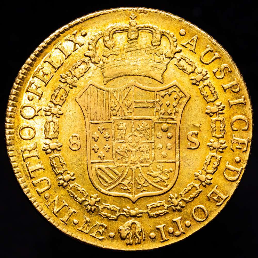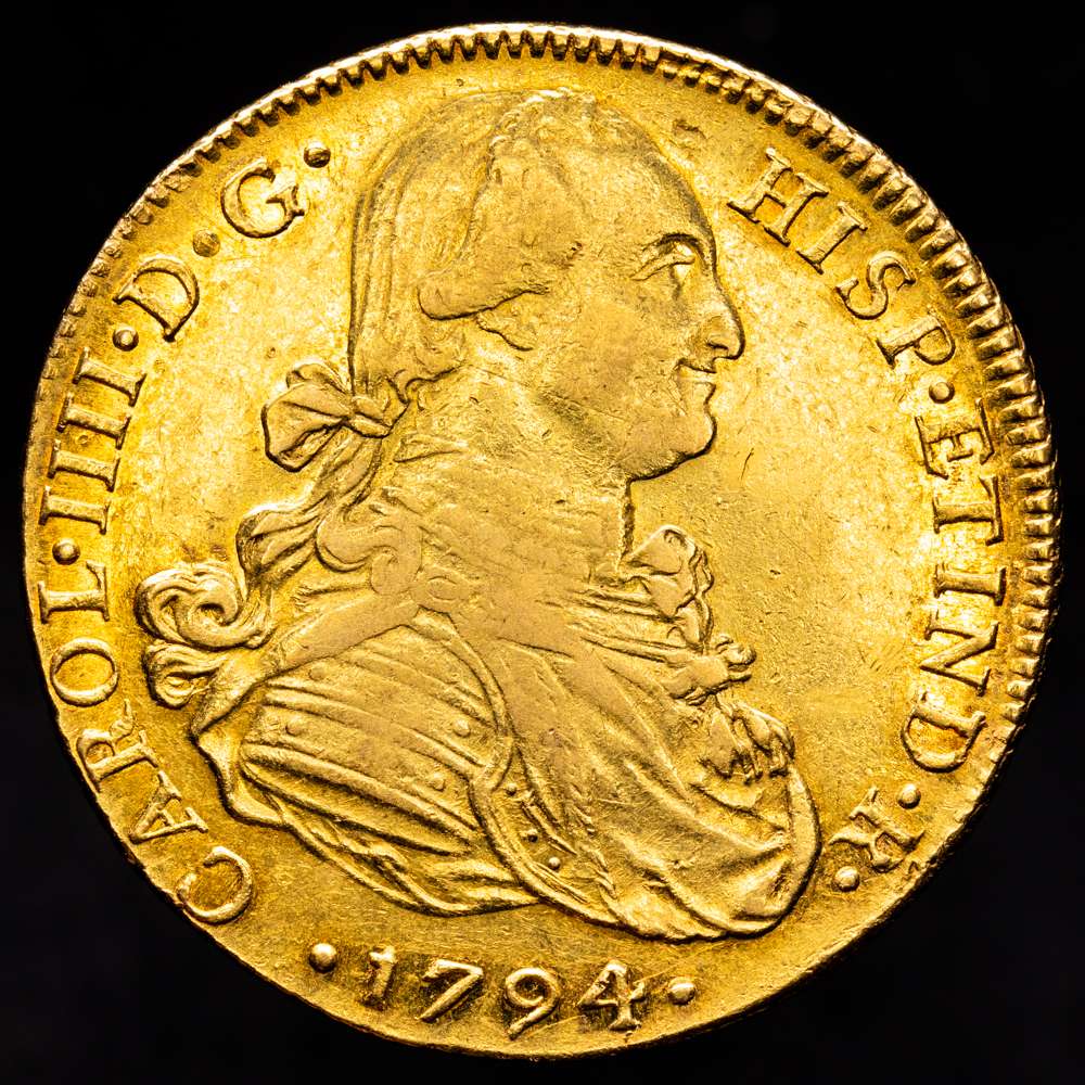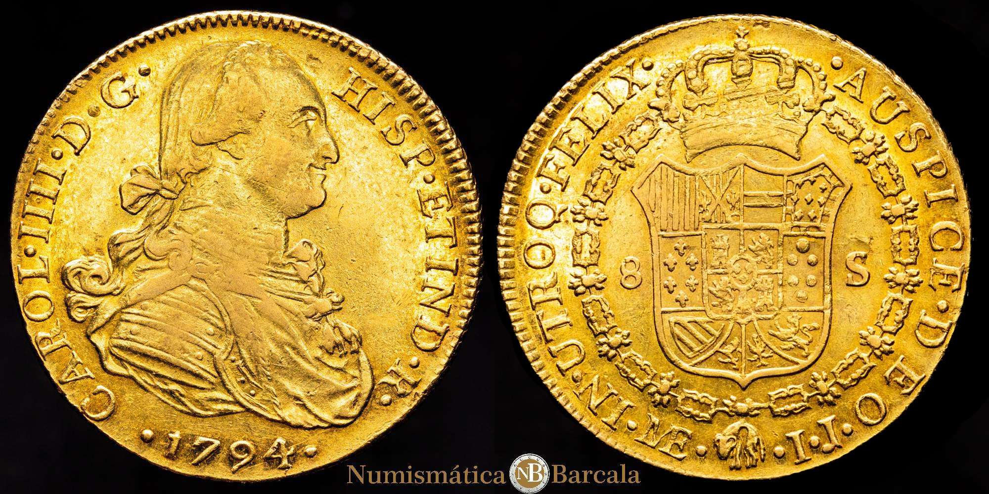 Numismática Barcala > Productos > Carlos IV. 8 Escudos. (26,93 g.). Lima. 1794. Ensayador I·J. AC-1593. EBC-/EBC. Gran parte de brillo original, bello color.