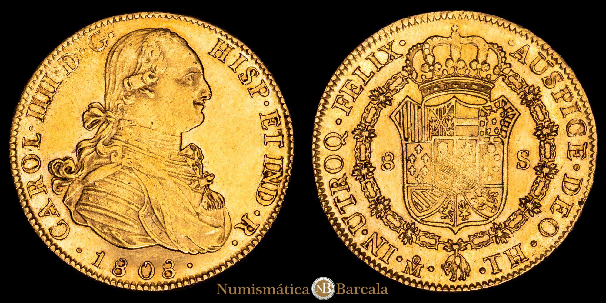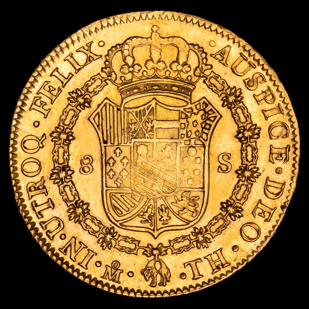 Carlos IV. 8 Escudos. (27,05 g.). México. 1808. Ensayador T·H. AC-1656. XF+. Brillo original. Precioso color.