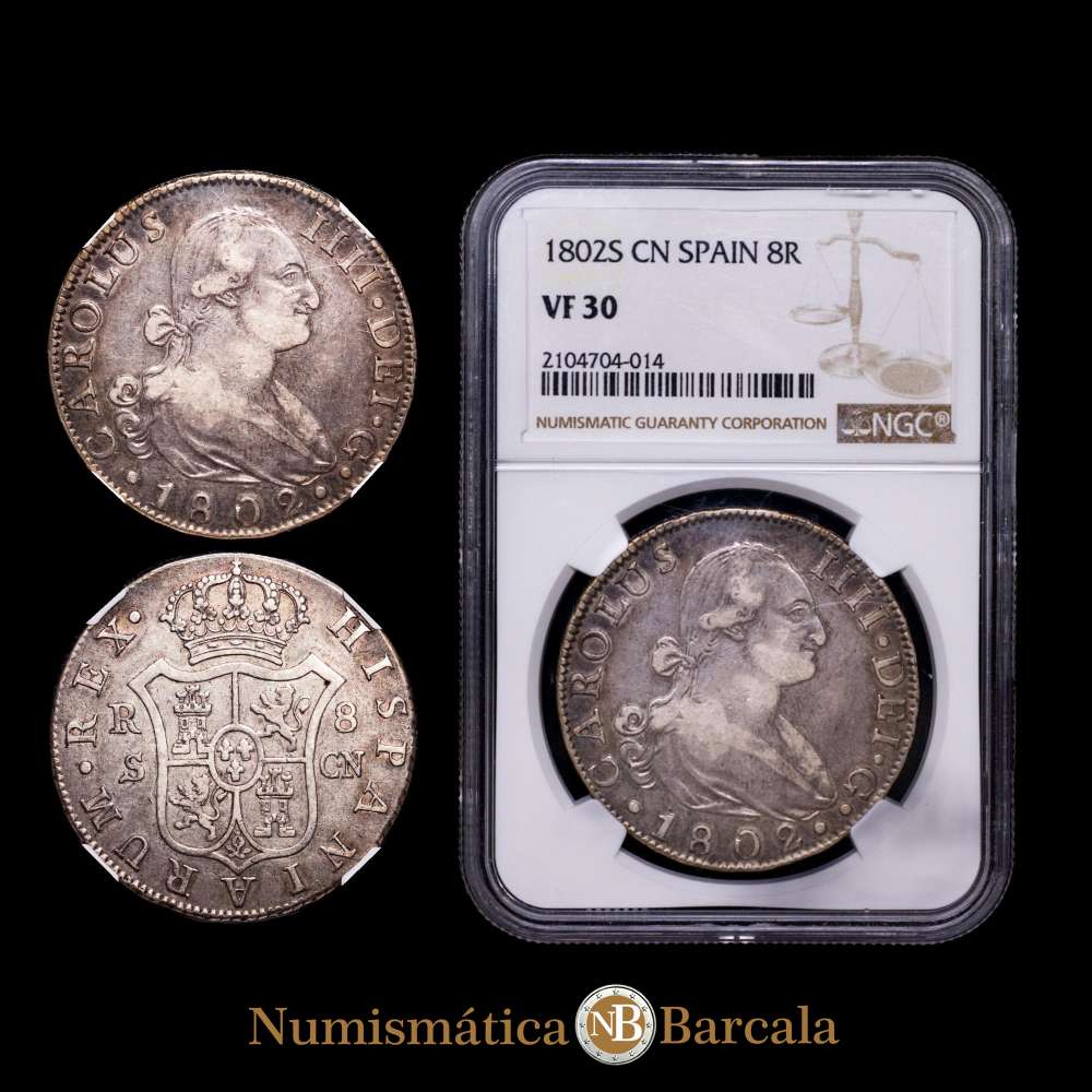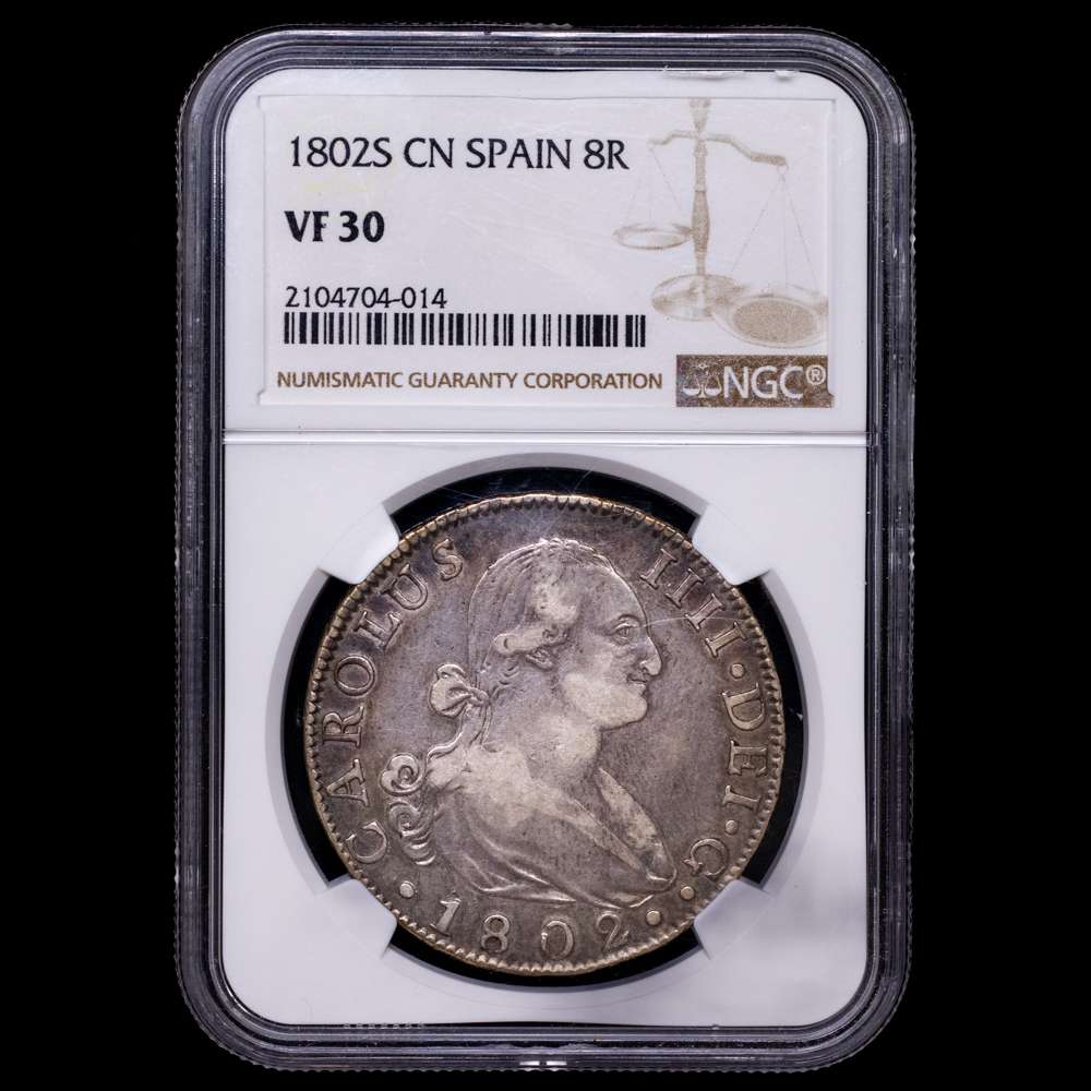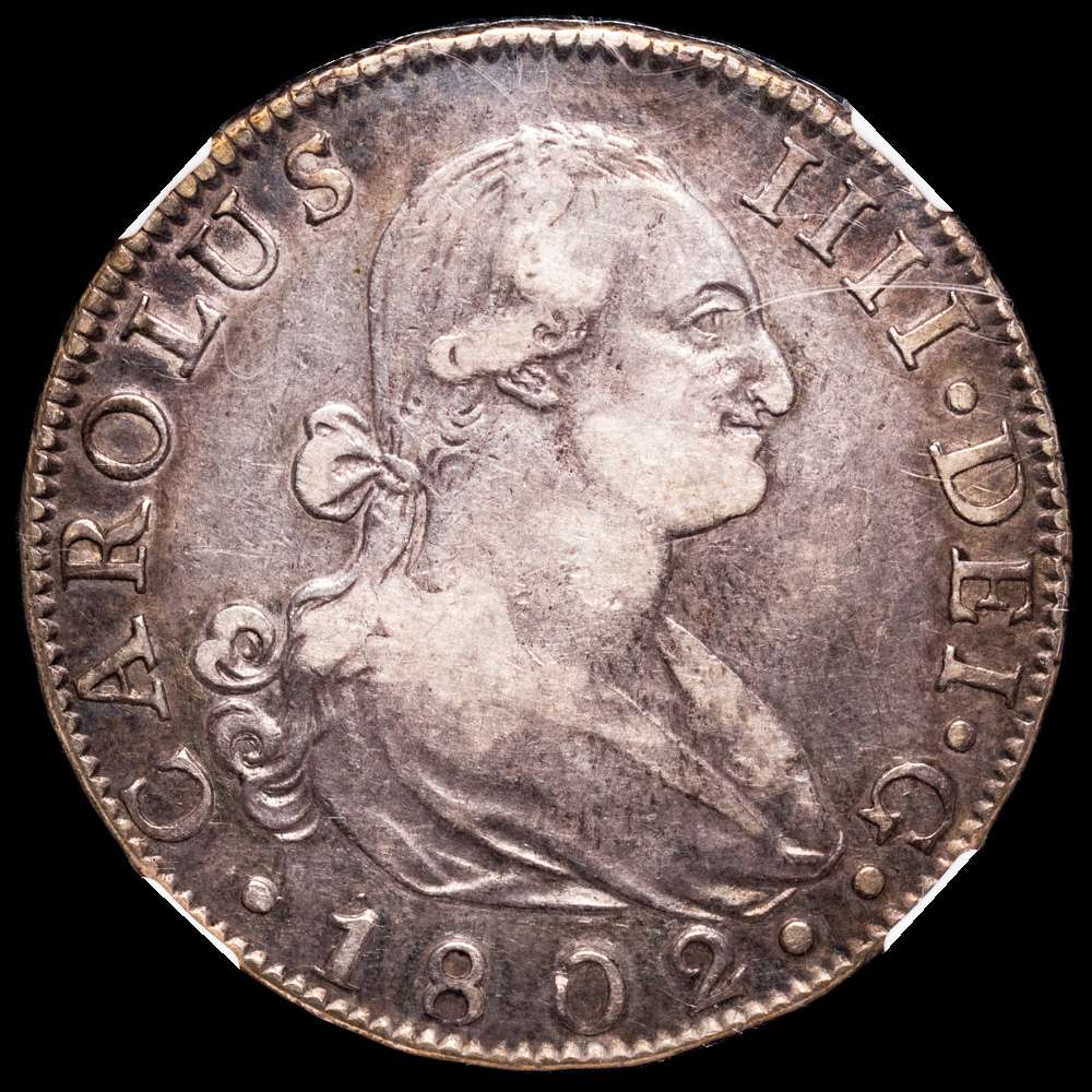 Carlos IV. 8 reales. 1802. Sevilla. CN. AR. VI-864; AC-1064. Encapsulada Encapsulado por NGC como VF 30. Suave pátina.