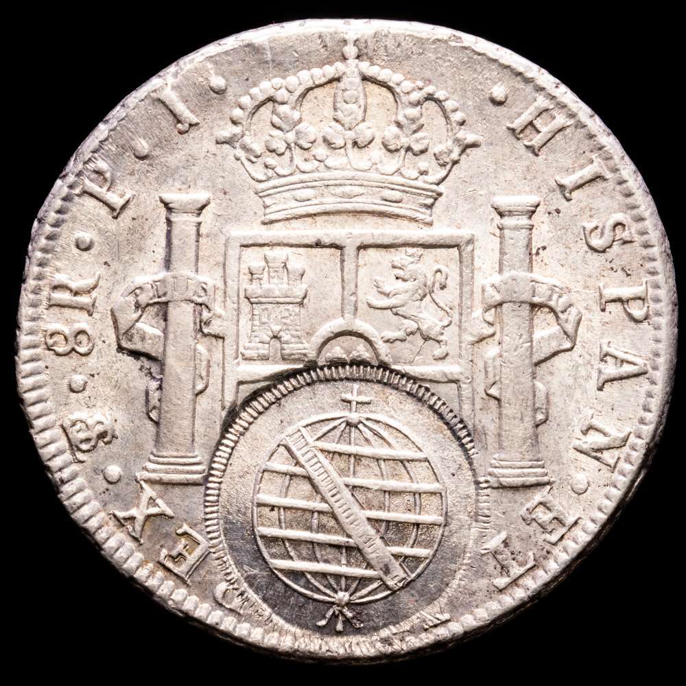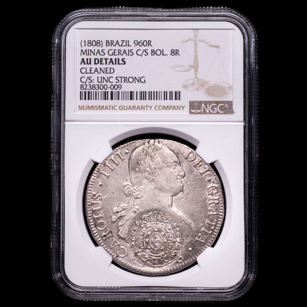 Numismática Barcala > Productos > Carlos IV 8 Reales. (1808). Potosí. Ensayador P·J. Doble resello de Minas Gerais para circular por Brasil, acuñado sobre 8 reales de (180) de Potosí. Encapsulada por NGC como AU Details.