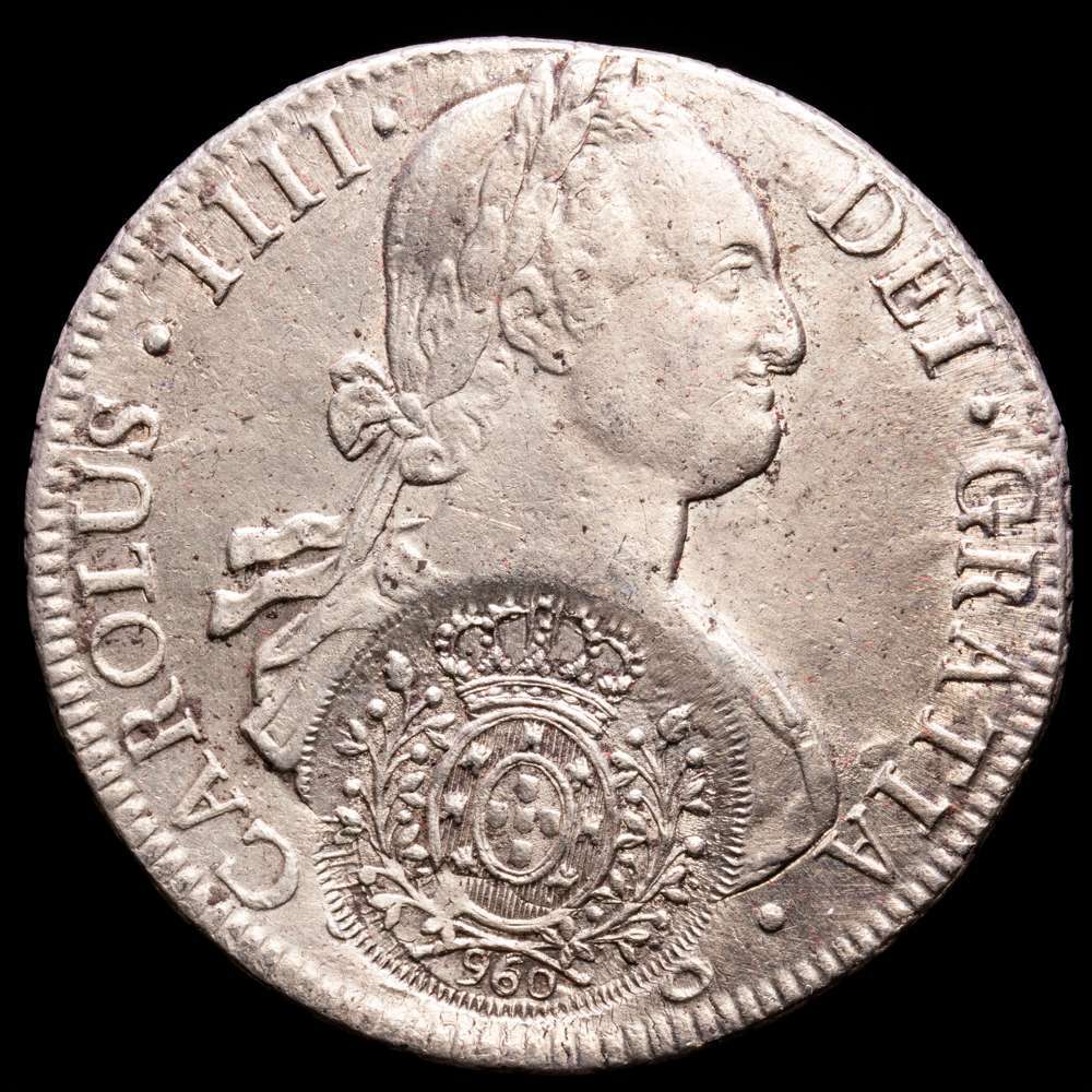 Carlos IV. Resellado en Brasil como 960 Réis sobre 8 Reales 1808. Potosí. Ensayador PJ. Encapsulada por la NGC, XF Details.