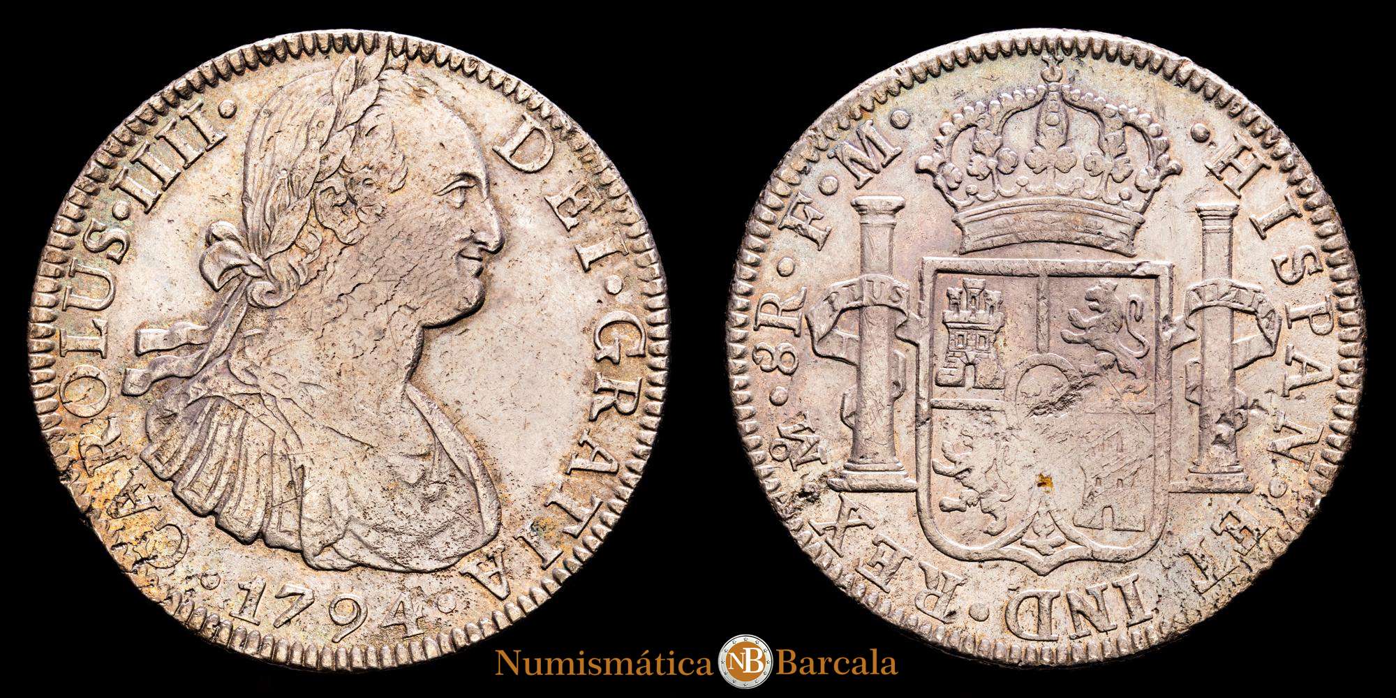 Numismática Barcala > Productos > Carlos IV. 8 Reales. (26,71 g.). México. 1794. F·M. AC-956. Ligera pátina irisada con tono mate. EBC-.