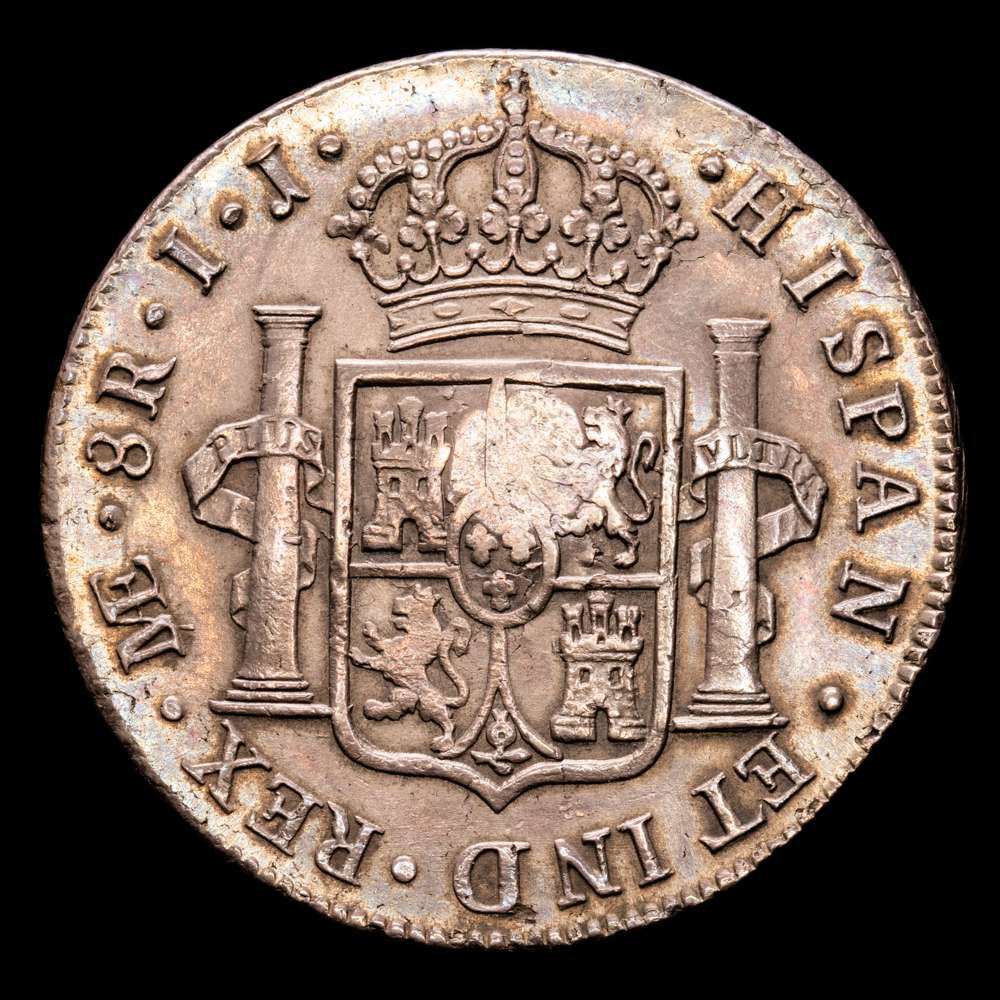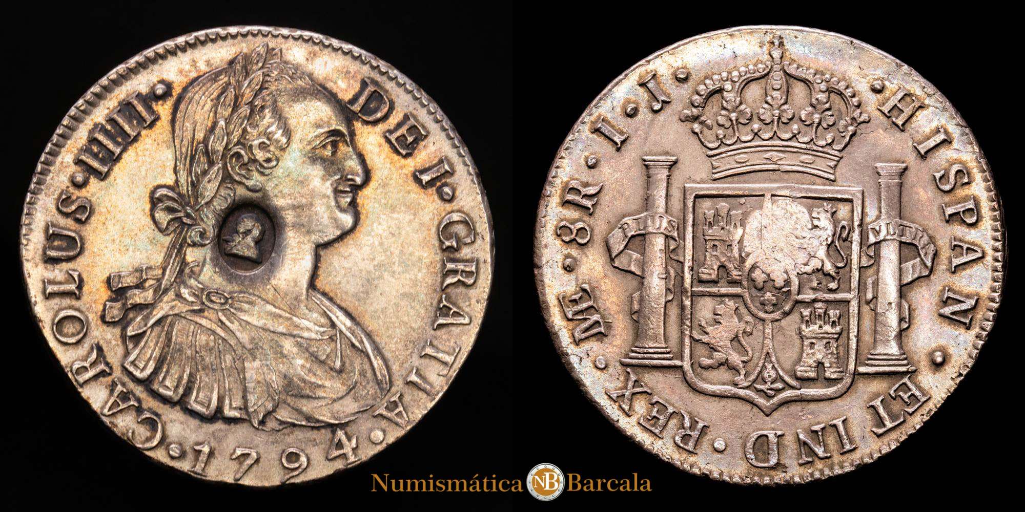 Numismática Barcala > Productos > Carlos IV. 8 Reales. (27,18 g.). Lima. 1794. Ensayador I·J. Contramarca de Jorge III de GB . EBC .