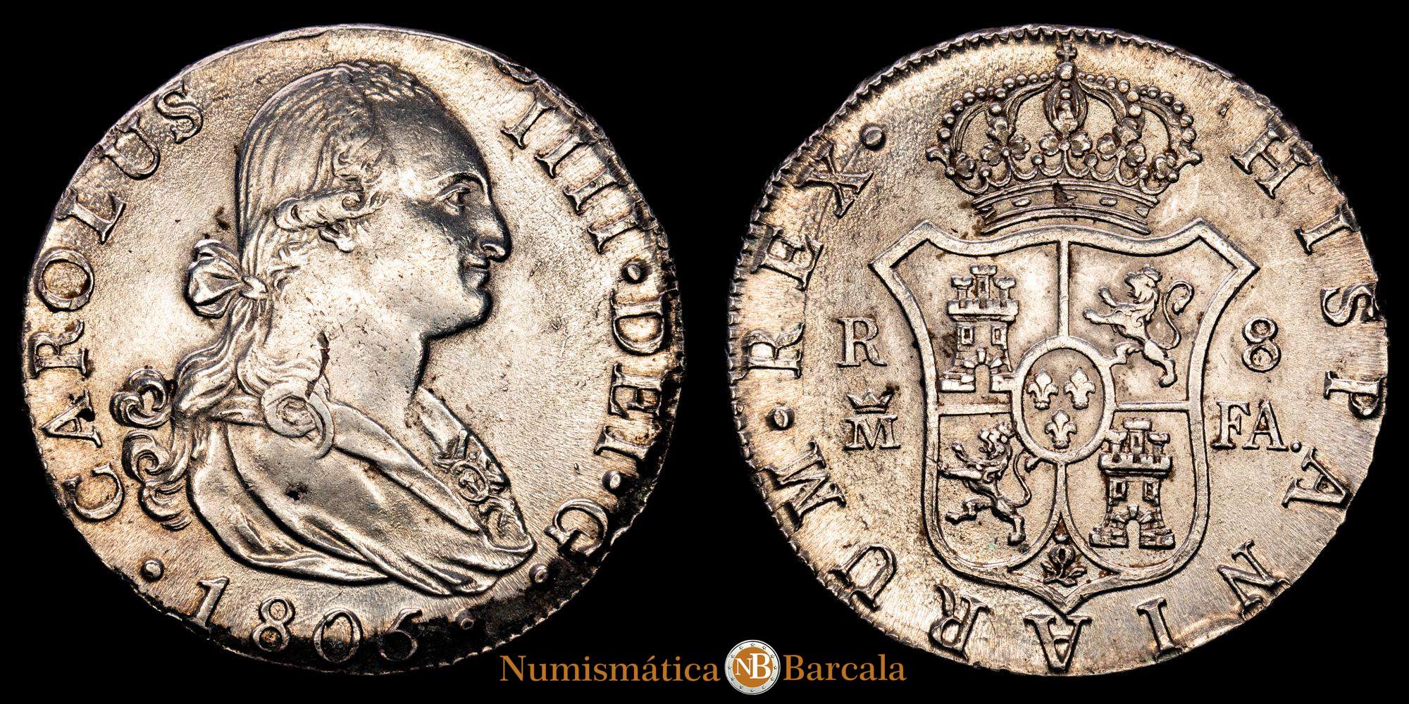 Numismática Barcala > Productos > Carlos IV. 8 Reales. (27,18 g.). Madrid. 1805. F·A. AC-943. EBC.