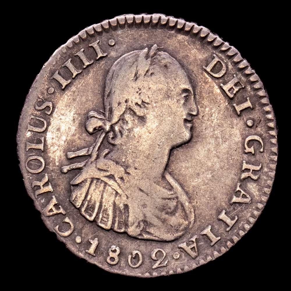 Carlos IV, ceca de Potosí. 1real. 1802. Ensayadores: PP (Pedro Narciso de Mazondo, Pedro Martín de Albizu). Anverso: Busto del Rey coronado con laureles y mirando hacia la derecha; leyendas alrededor y año en la parte baja. Reverso: Escudo de armas español al centro; leyendas alrededor, marca de ceca y valor facial hacia la izquierda. (AC.476). KM 70. Plata 896; 3,51 gramos; 21 milímetros. VF.
