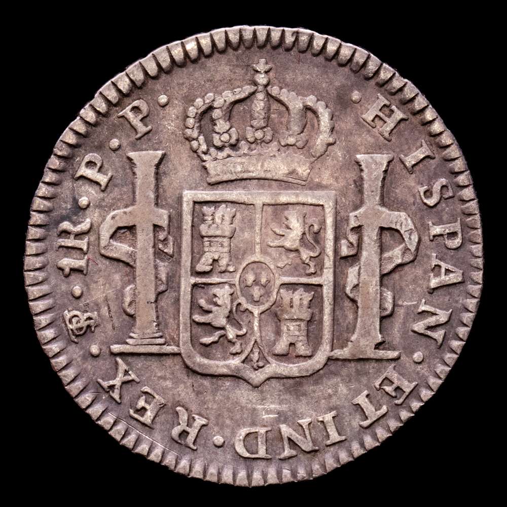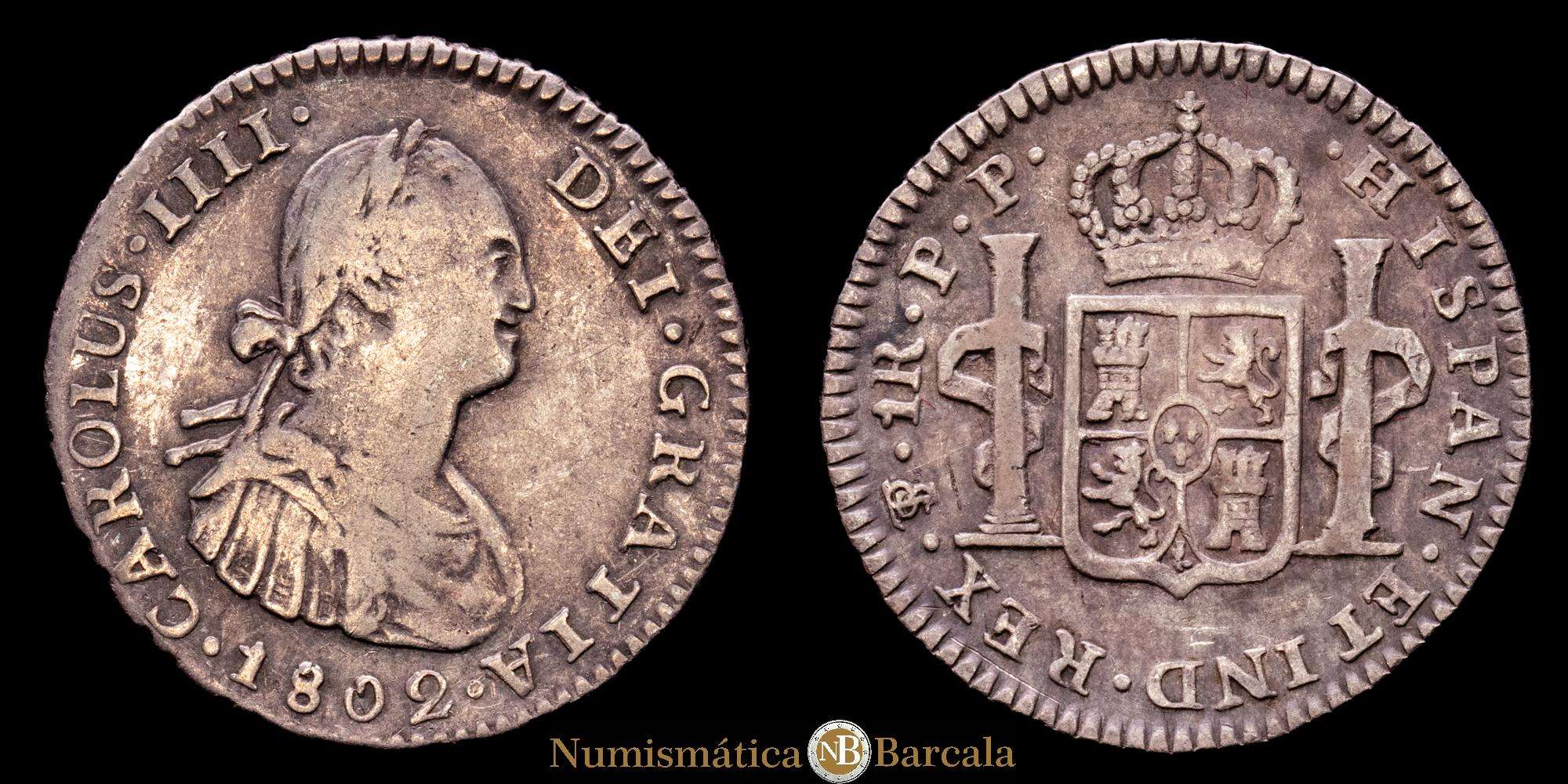 Numismática Barcala > Productos > Carlos IV, ceca de Potosí. 1real. 1802. Ensayadores: PP. (AC.476). KM 70. Plata 896; 3,51 gramos; 21 milímetros. VF.
