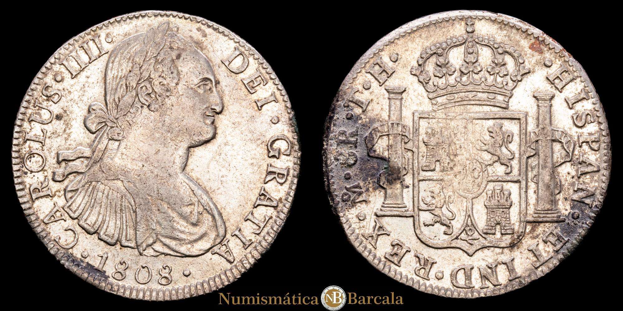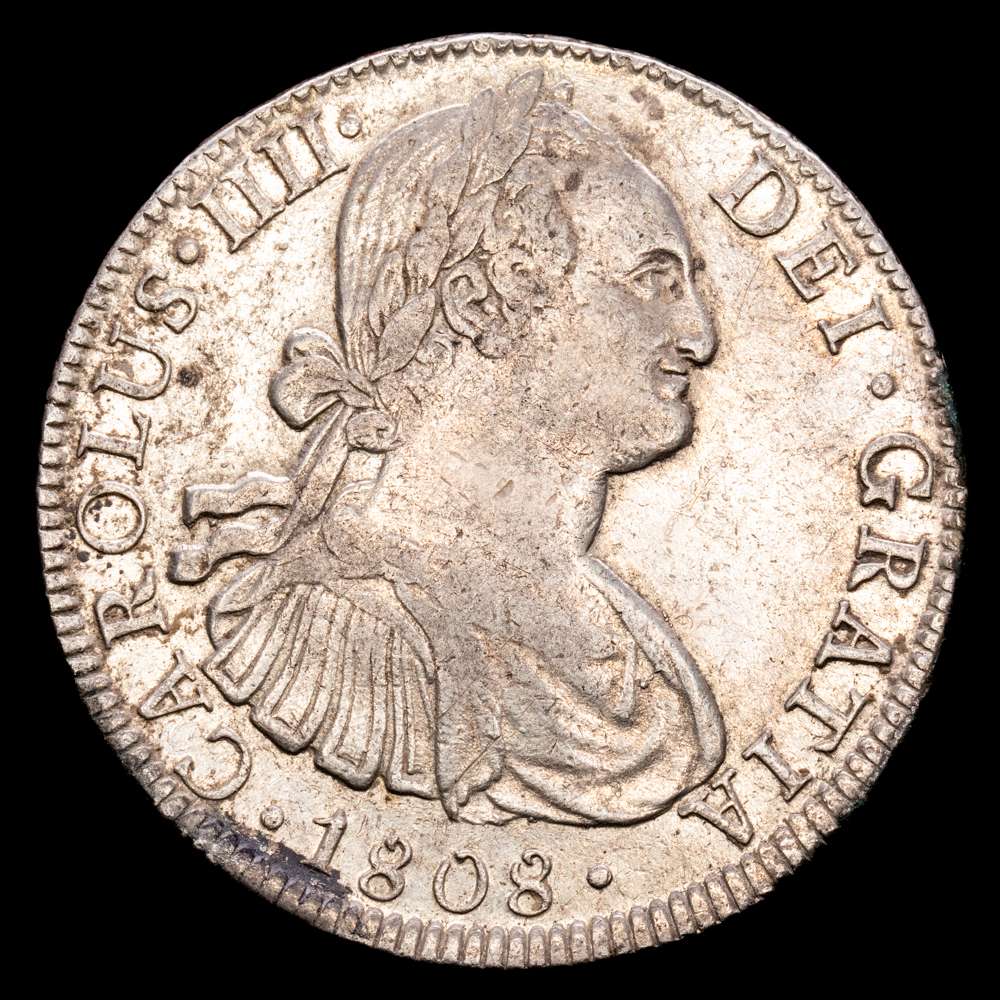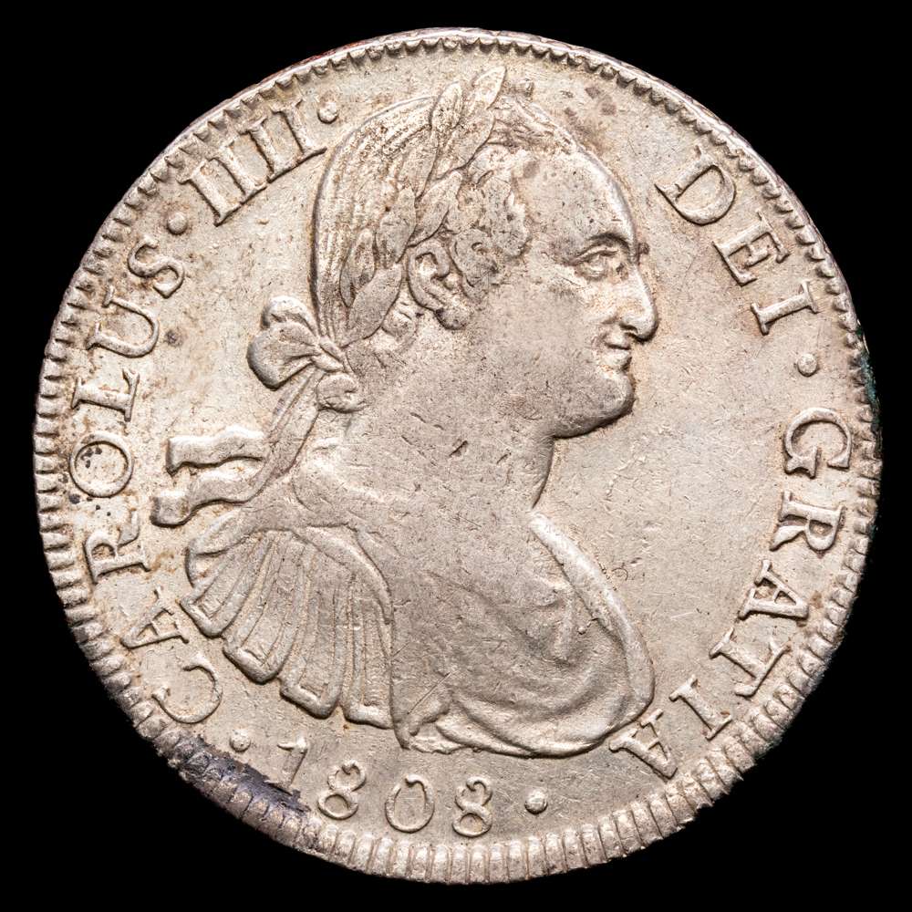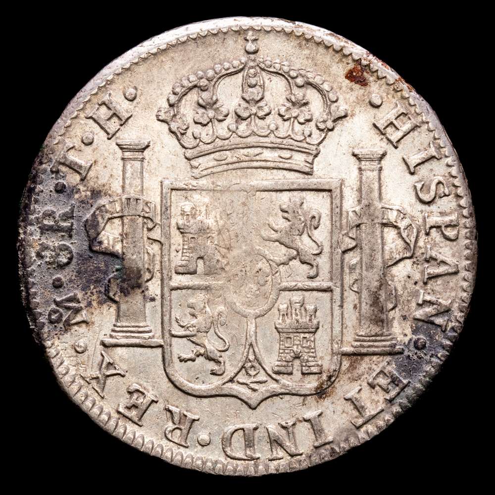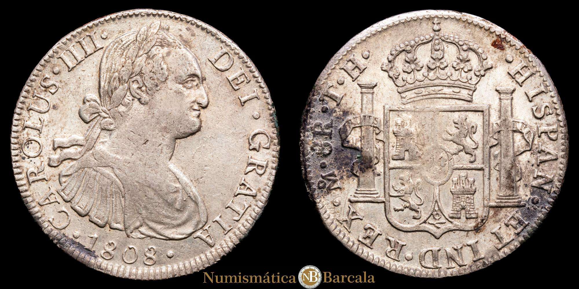 Numismática Barcala > Productos > Carlos IV. México. 8 reales. 1808. TH. (26,86 g.). AC-988. Restos de concreciones limpiadas, mínimas cocas de metal. Centro del escudo ligeramente poco recrecido. MBC+.