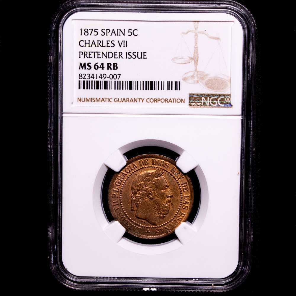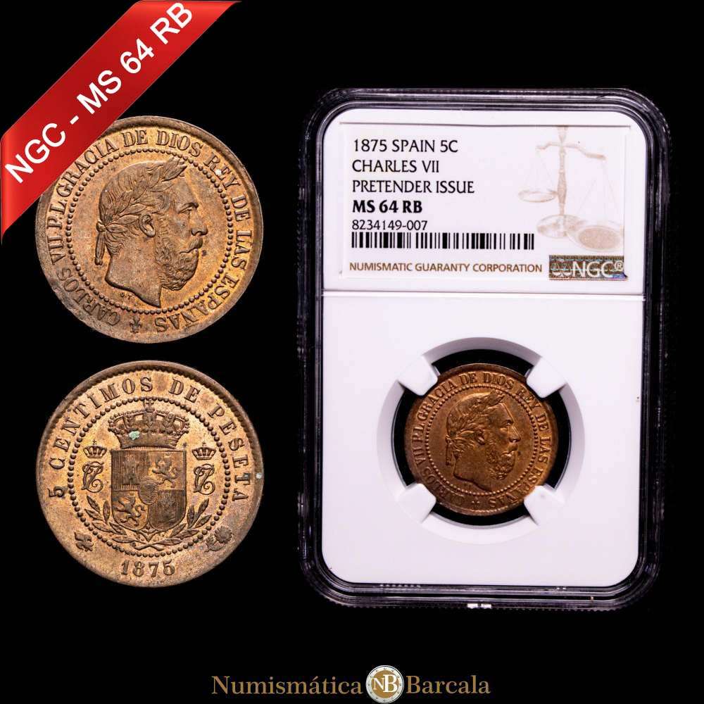 Numismática Barcala > Productos > Carlos VII Pretendiente. Oñate. (1872-1876). 5 céntimos. 1875. (AC.2). Ae. Muy bella. Pleno brillo original. En cápsula de la NGC como MS64 RB.