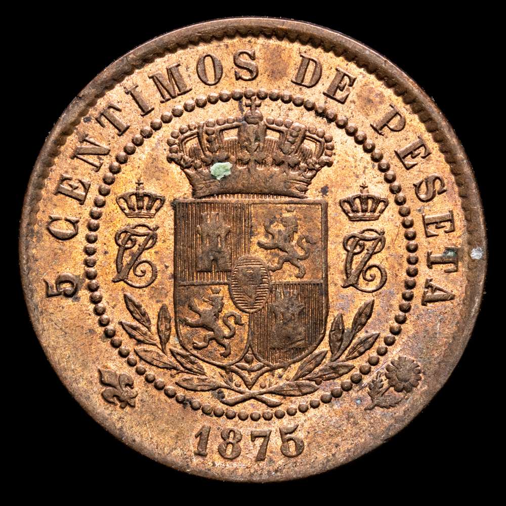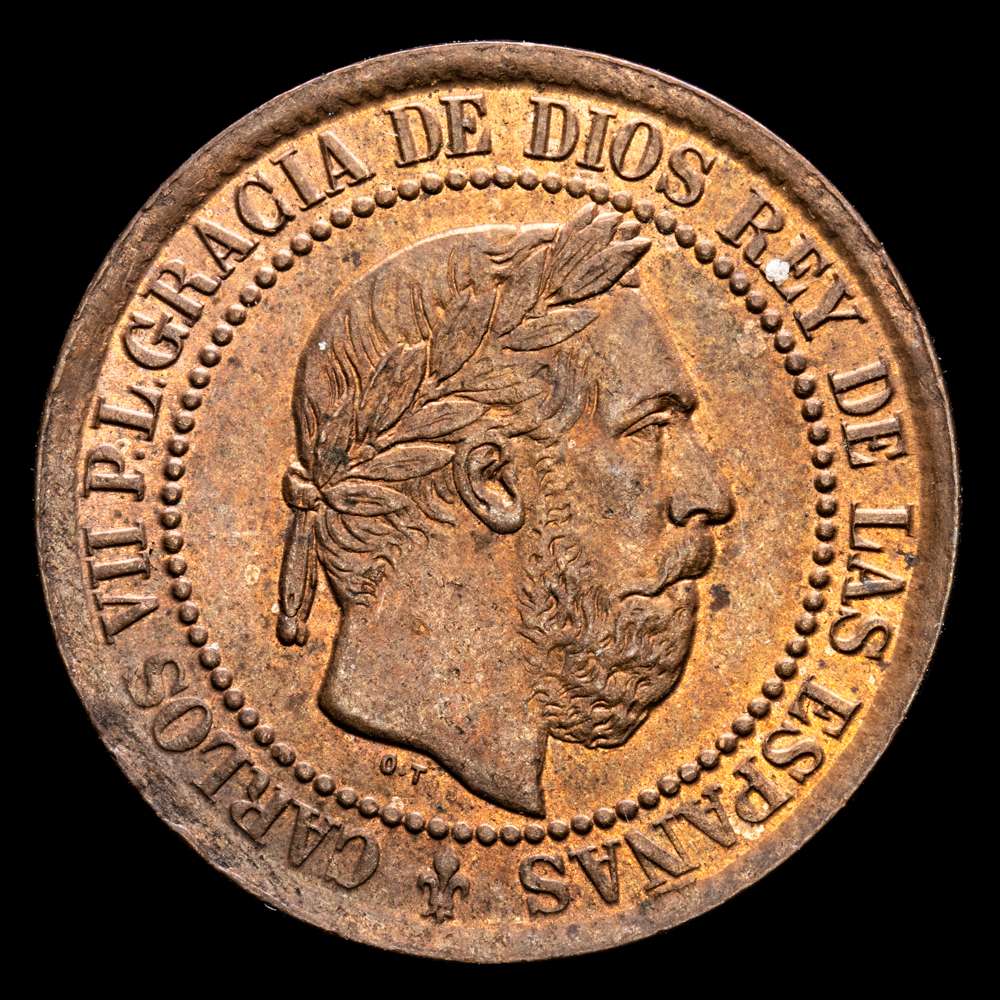 Carlos VII Pretendiente. Oñate. (1872-1876). 5 céntimos. 1875. (AC.2). Ae. Muy bella. Pleno brillo original. En cápsula de la NGC como MS64 RB.