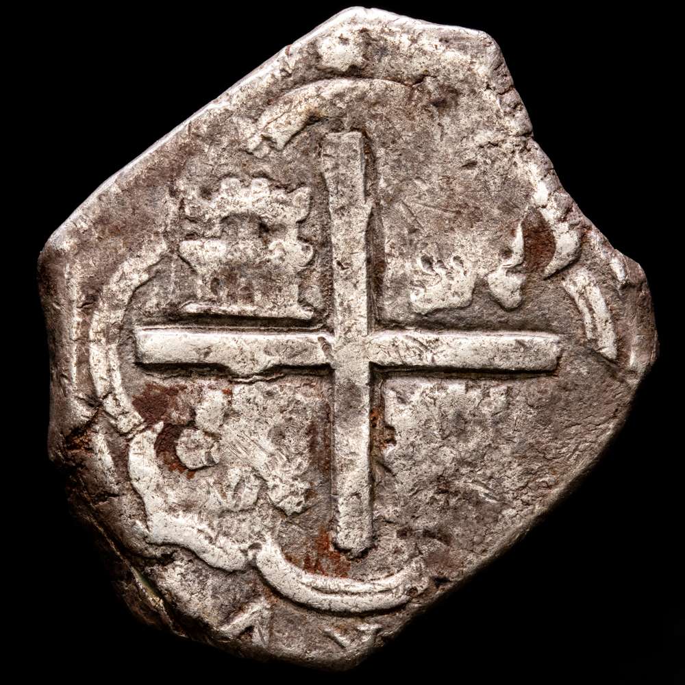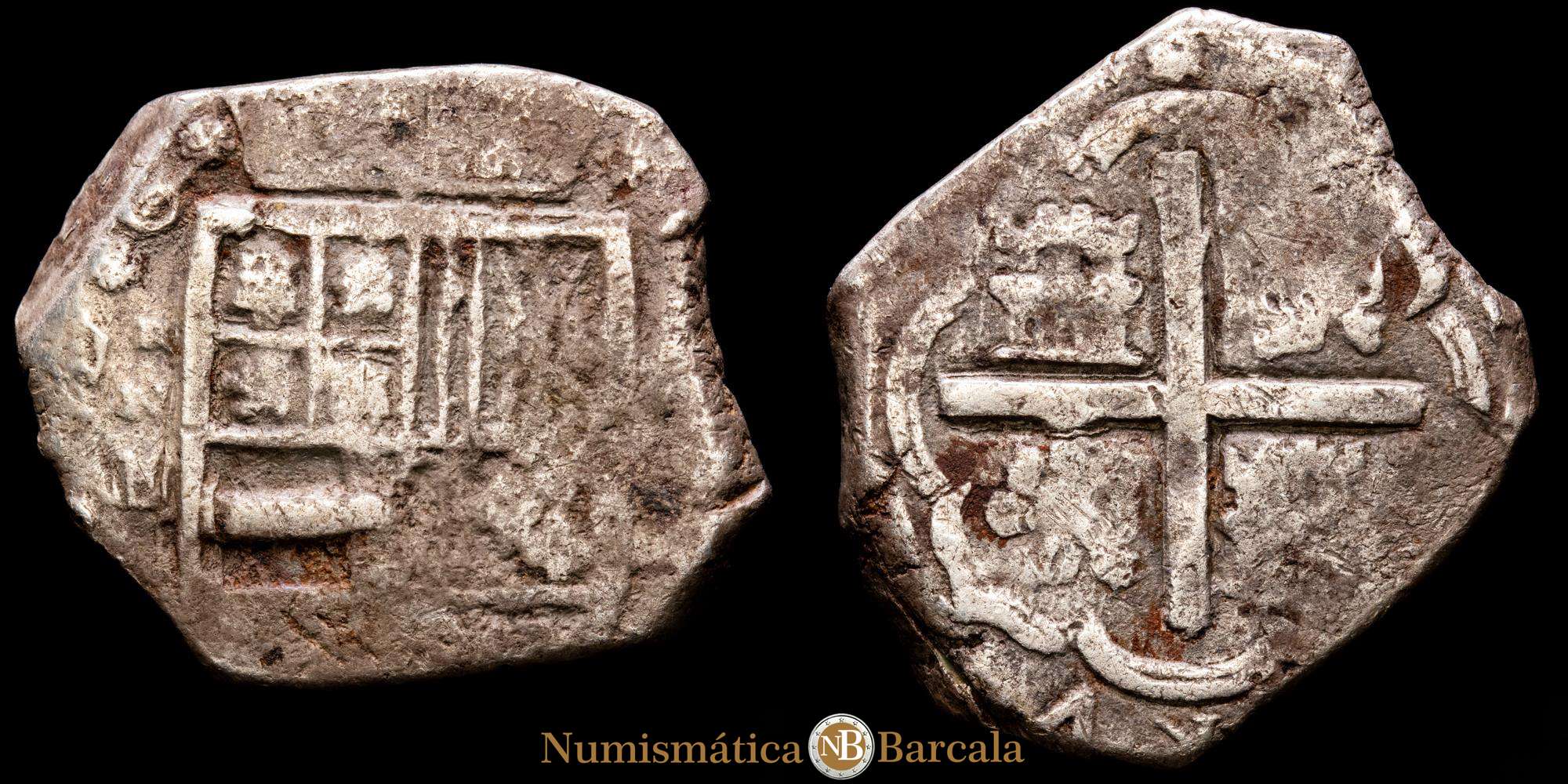Cartagena, Colombia, cob 8 reales, Felipe IV, (1621-1665) ensayador E debajo de la marca de ceca RN a la izquierda (1626-30), rara. Restrepo-M45.3; S-C3; Cal-Type 298; KM-3.4. 25,92 gramos. Gruesa y robusta, con un ligero tono irregular y oxidación, cruz completa en negrita y escudo casi completo con RN-E tenue pero completo a la izquierda. MUY RARA!!