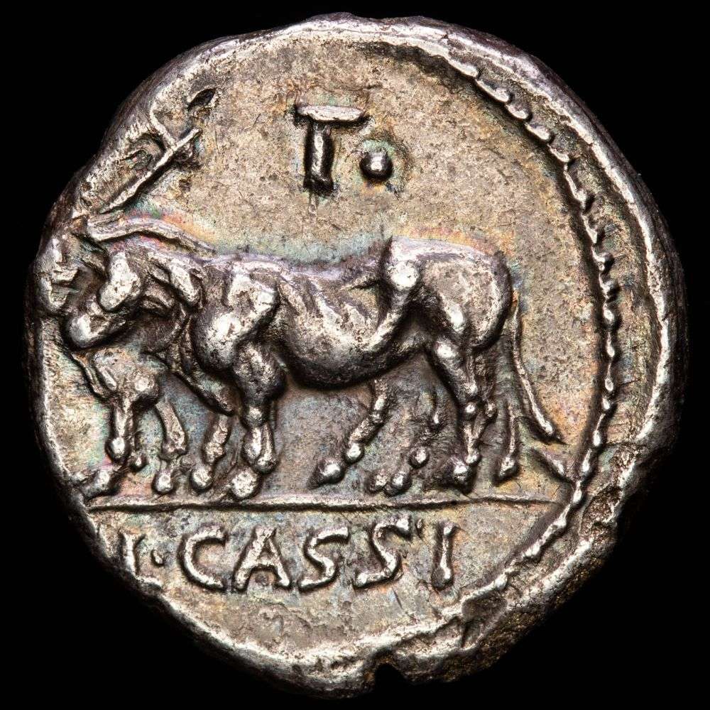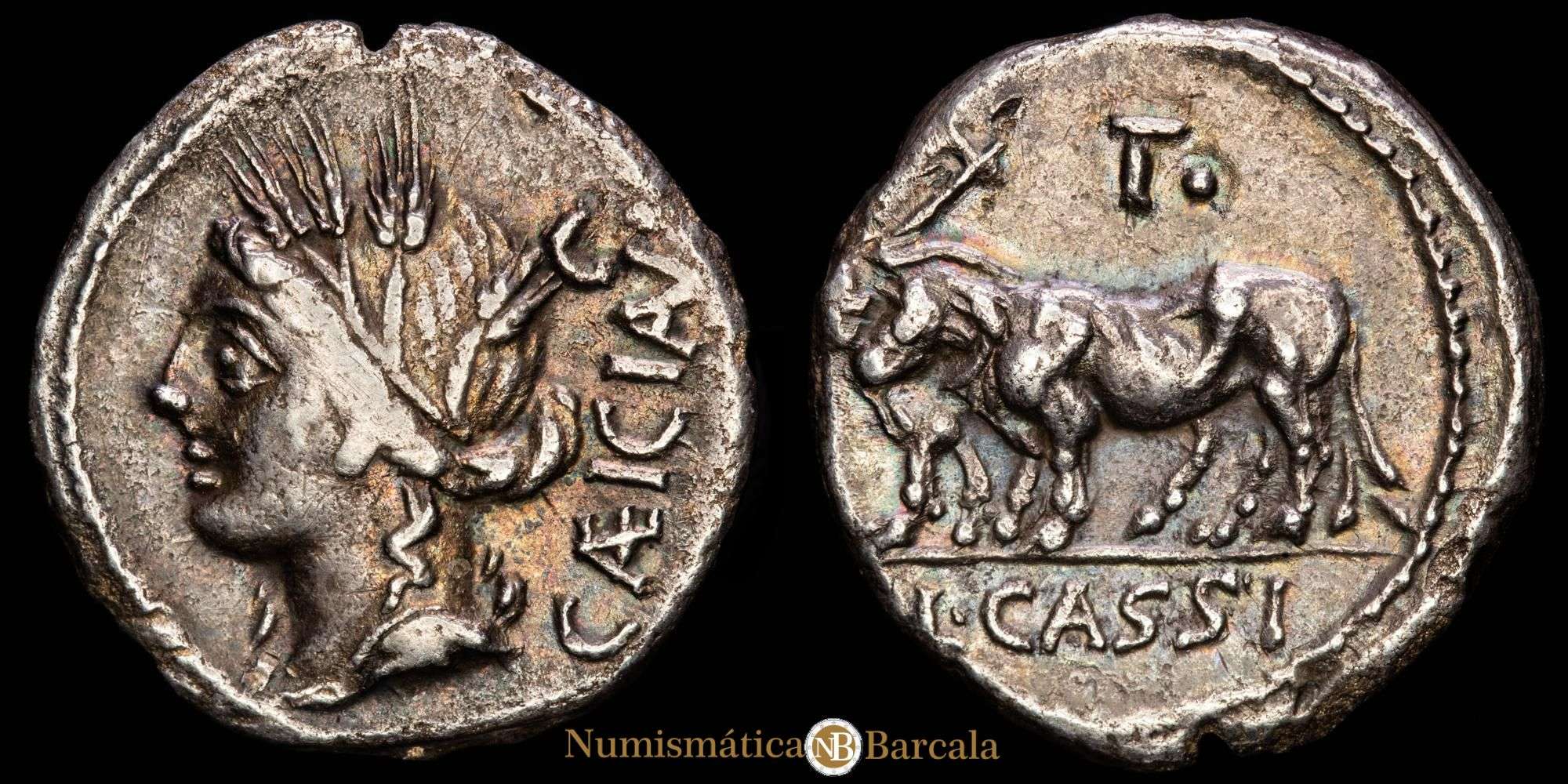 CASSIA. L. Cassius Caecianus. Denario (3,87 g.). Roma, 102 a.C. Anv.: Cabeza laureada de Ceres a izquierda, detrás C y leyenda: CAECIAN. Rev.: Dos bueyes a izquierda, arriba T. En exergo: L. CASSI. Pátina oscura. Cal-409; Craw-321/1 FFC-555; Se-4.MBC+.