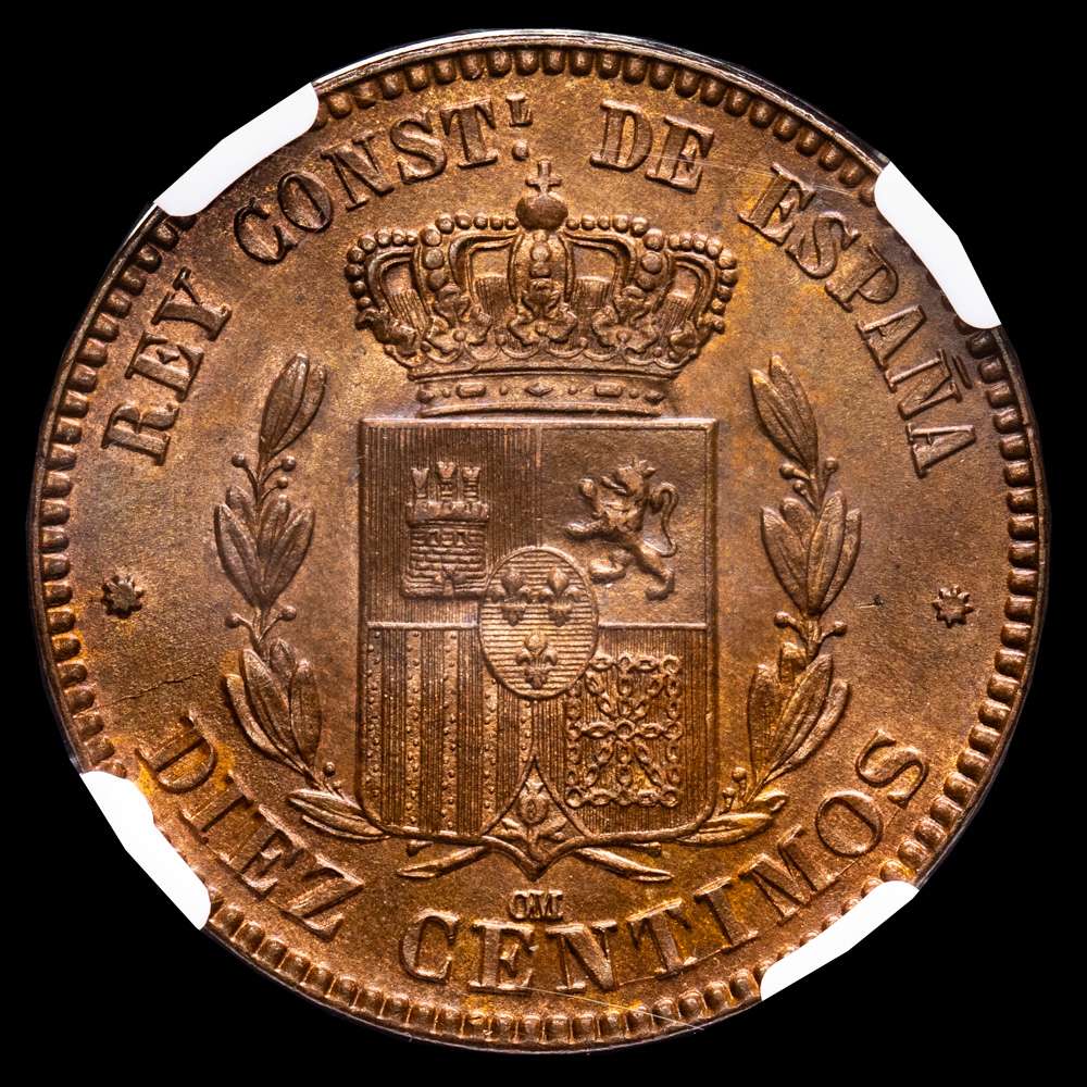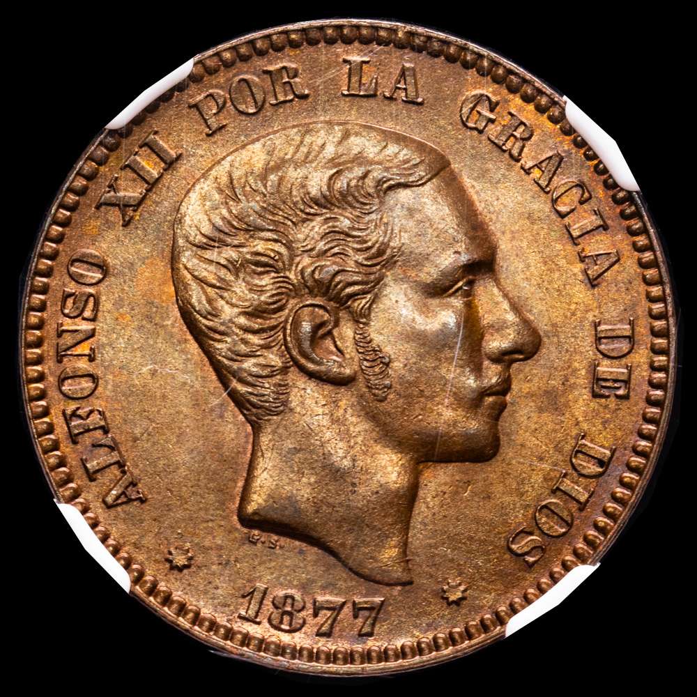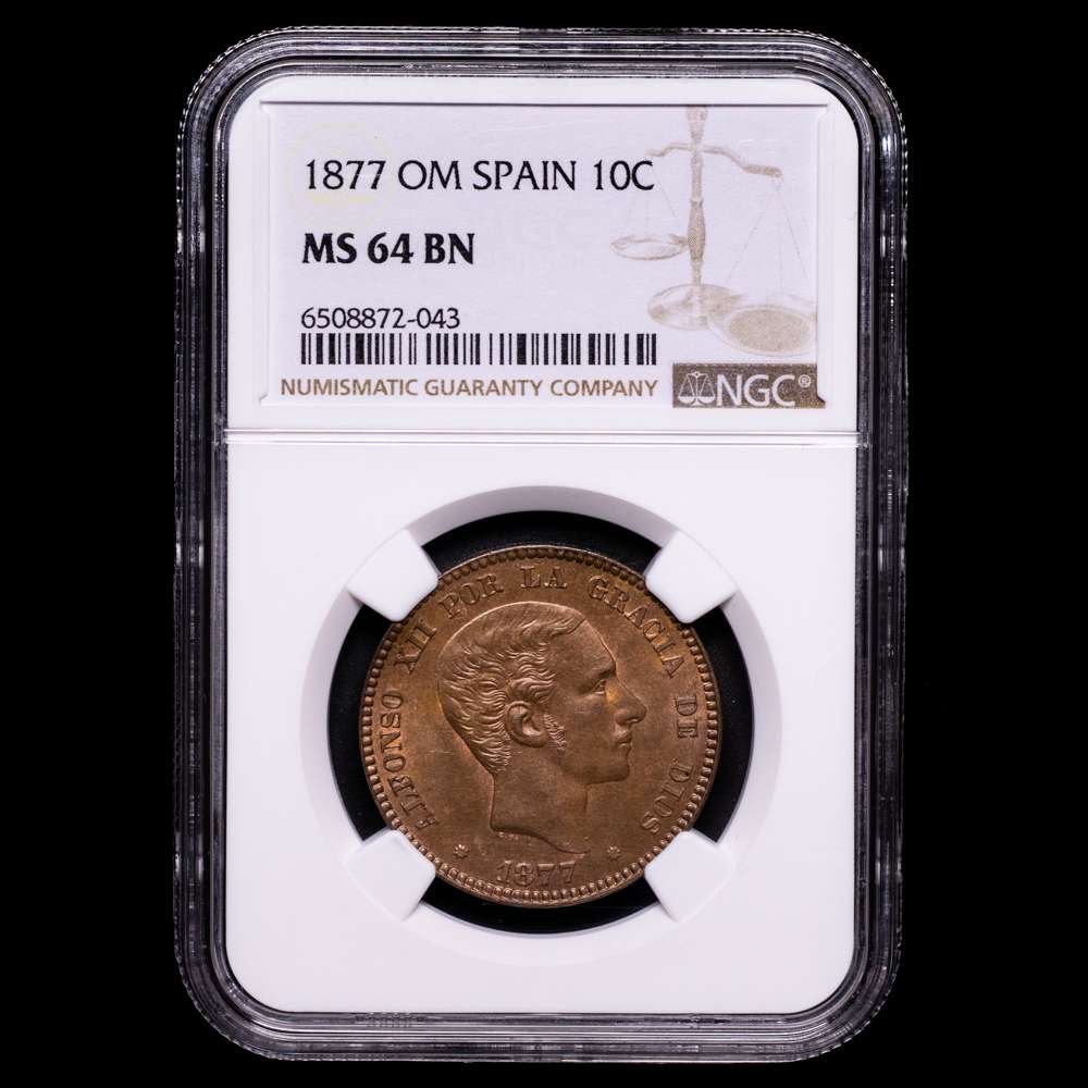Numismática Barcala > Productos > Centenario de la Peseta (1868-1931). Alfonso XII (1874-1885). 10 céntimos. 1877. Barcelona. (Cal-8). Ae. Parte de brillo original. Rara así. Encapsulada por NGC como MS 64 BN.
