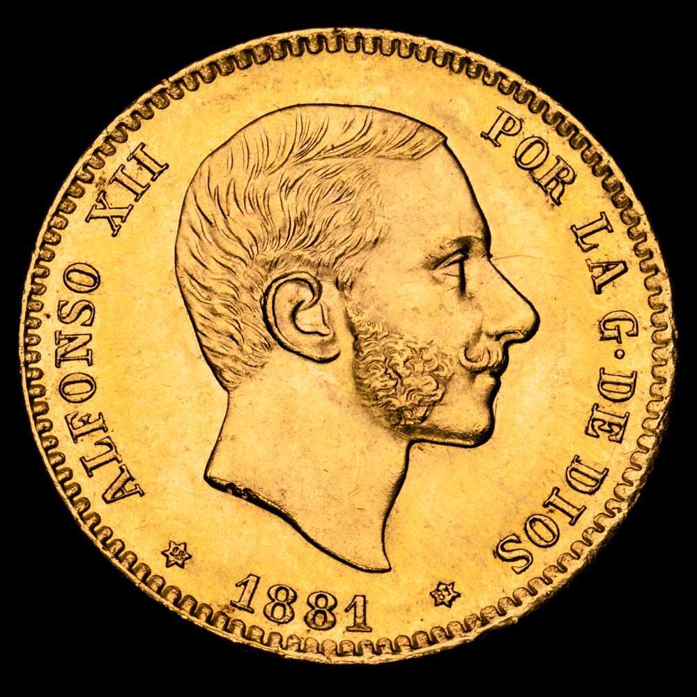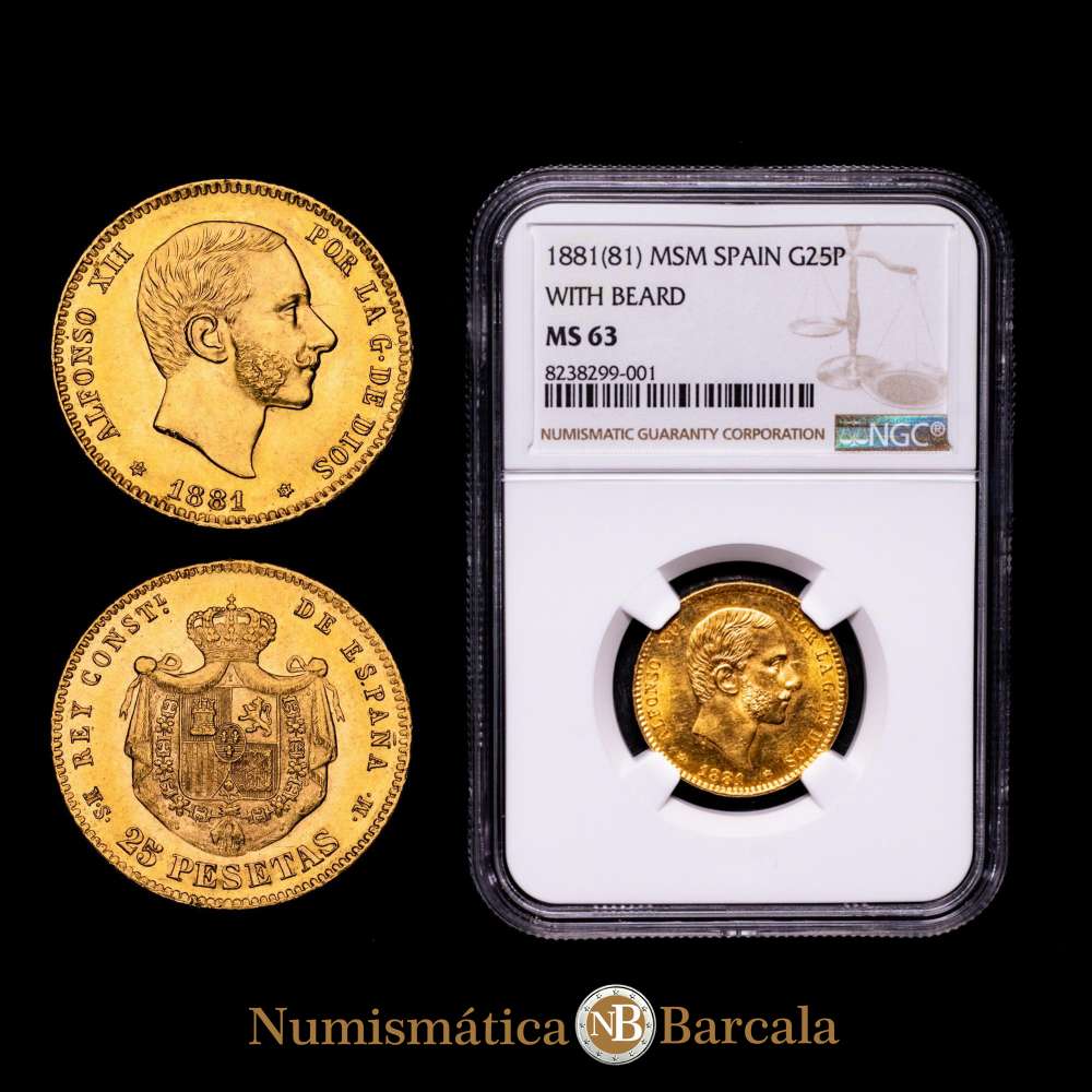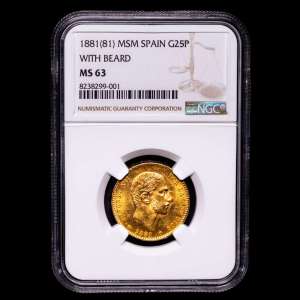 Numismática Barcala > Productos > Centenario de la Peseta (1868-1931). Alfonso XII (1874-1885). 25 pesetas. 1881*18-81. Madrid. HSH. (Cal-82). Ag. Color bonito. Brillo original. Encapsulada por NGC como MS 63.