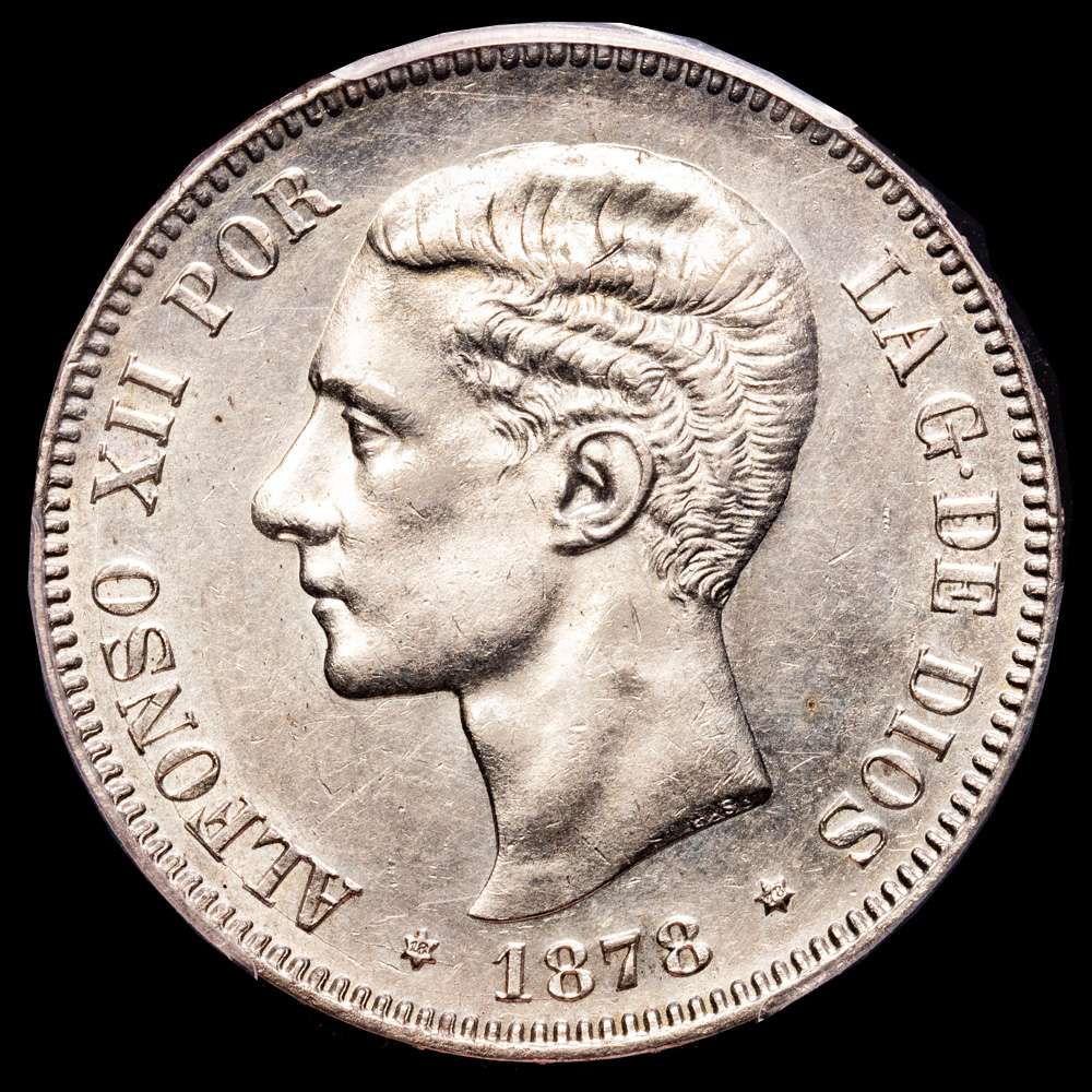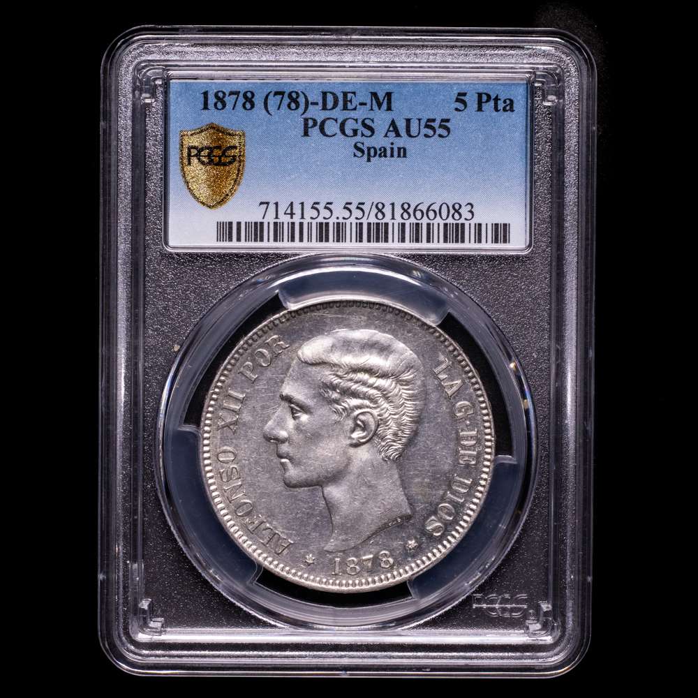 Numismática Barcala > Productos > Centenario de la Peseta (1868-1931). Alfonso XII (1874-1885). 5 pesetas. 1878*18-78. Madrid. DEM. (Cal-39). Ag. 25,00 g. Encapsulada por PCGS COMO AU 55.