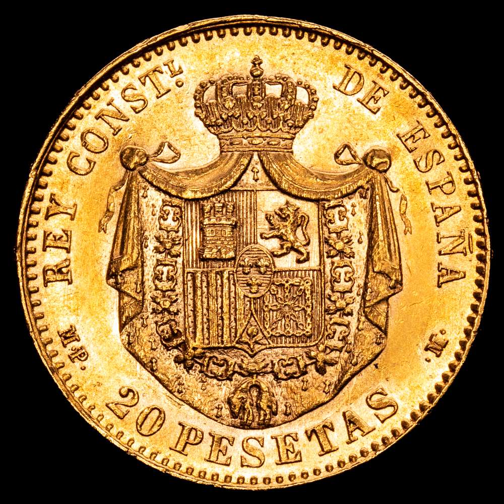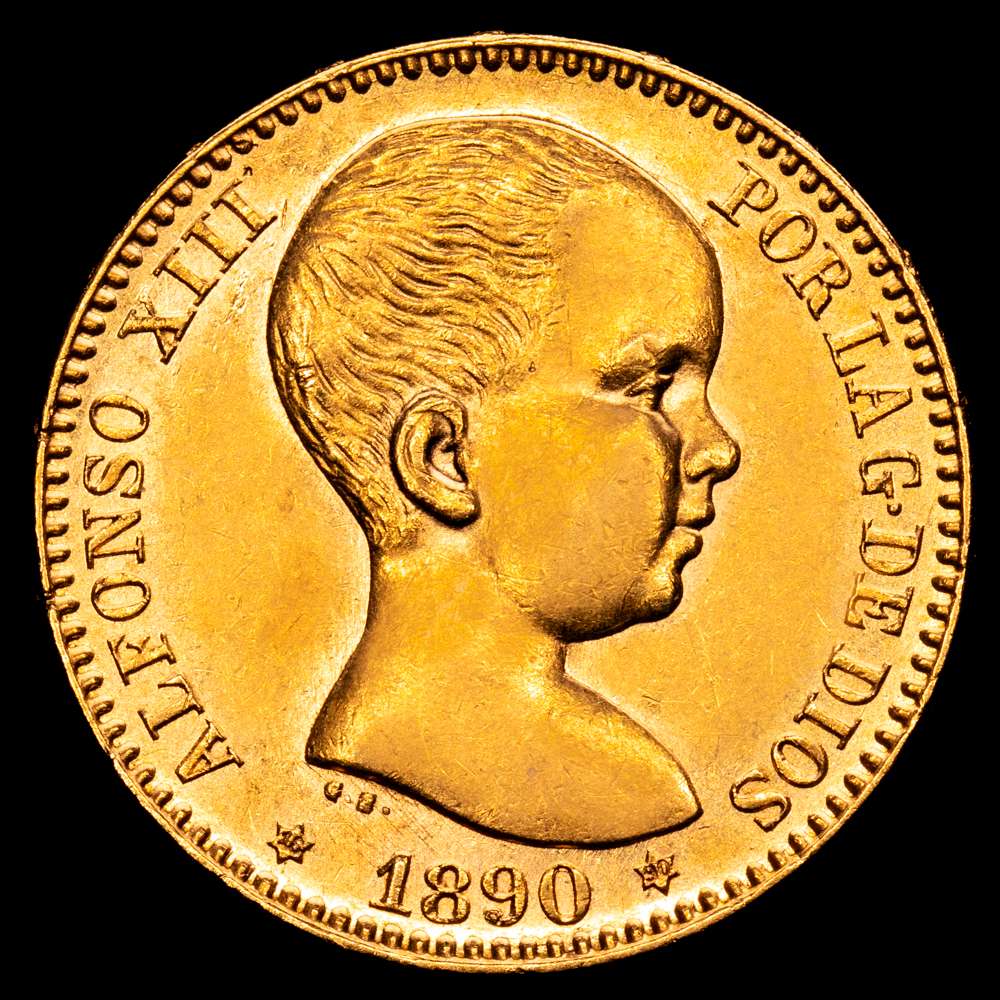 Numismática Barcala > Productos > Centenario de la Peseta (1868-1931). Alfonso XIII (1886-1931). 20 pesetas. 1890*18-90. Madrid. MPM. (Cal-114). Au. 6,43 g. Brillo original. EBC+.