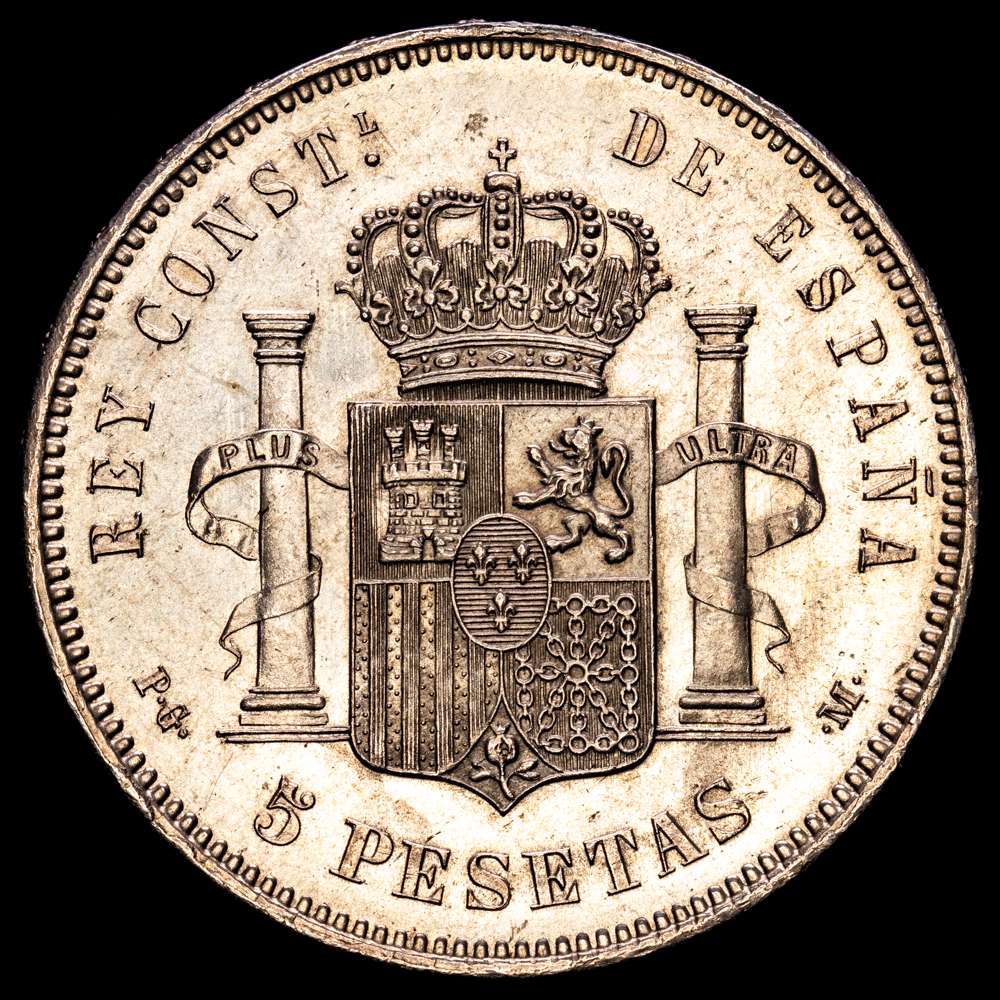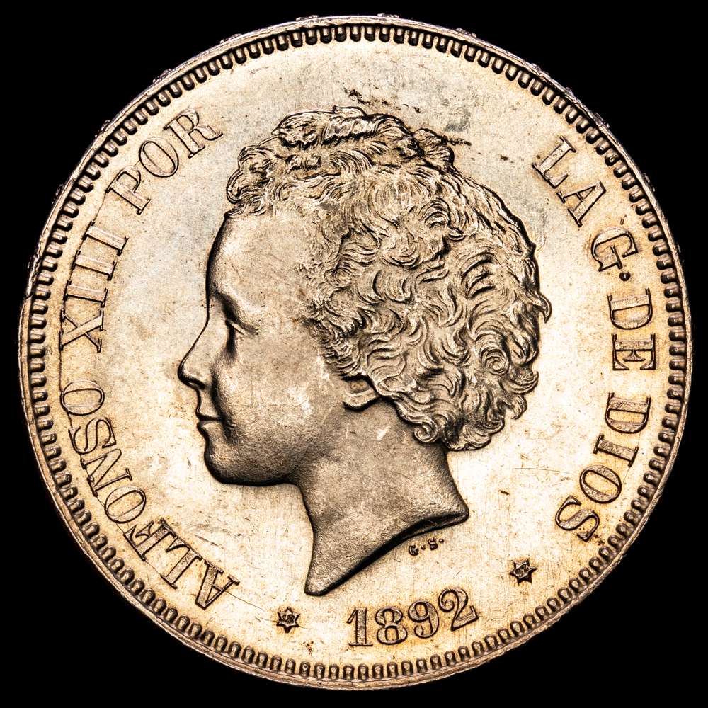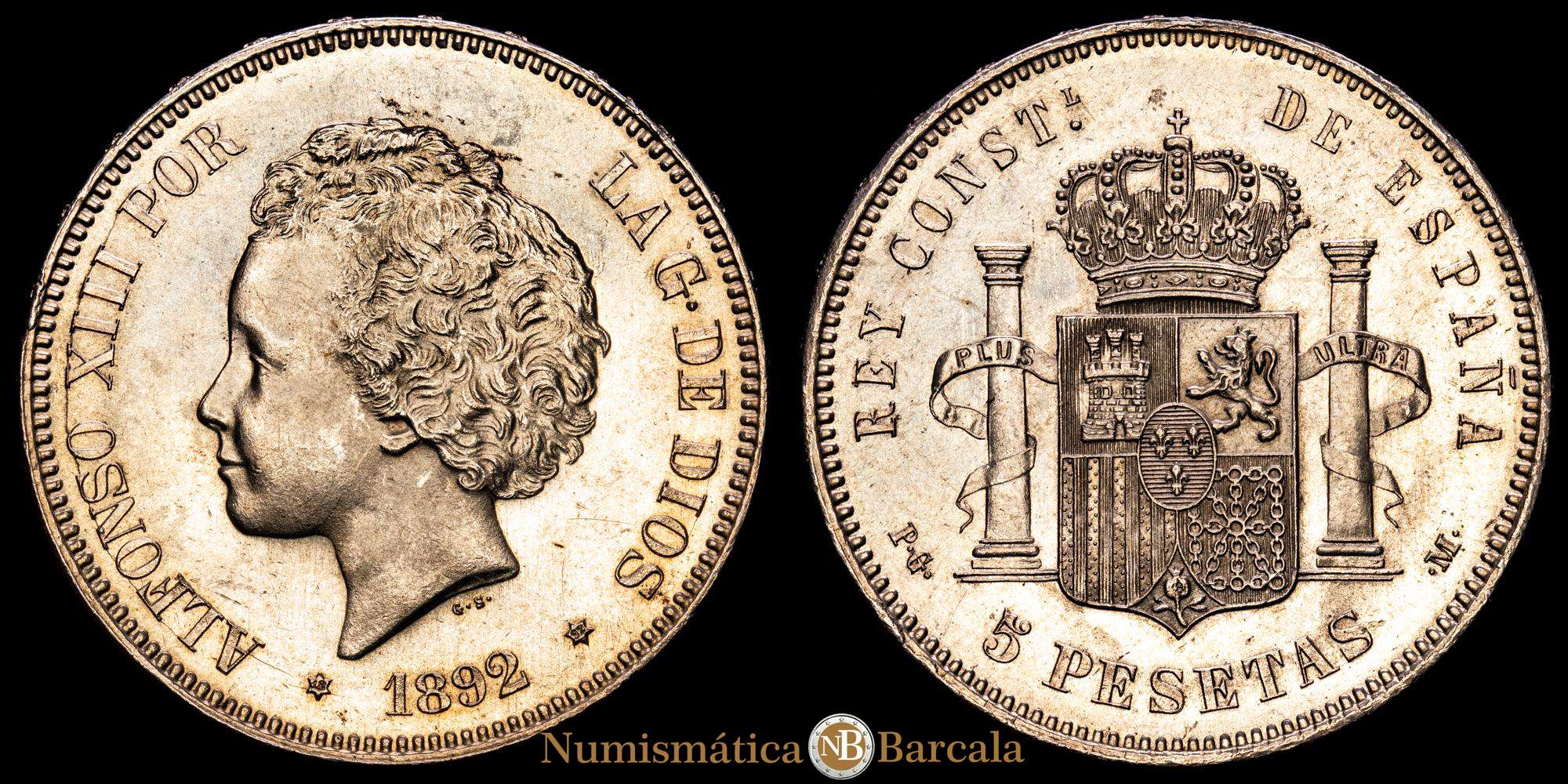 Numismática Barcala > Productos > Centenario de la Peseta (1868-1931). Alfonso XIII (1886-1931). 5 pesetas. 1892*18-92. Madrid. PGM. (Cal-100). Ag. 25,03 gramos. Leves marquitas. Restos de brillo original. SC.