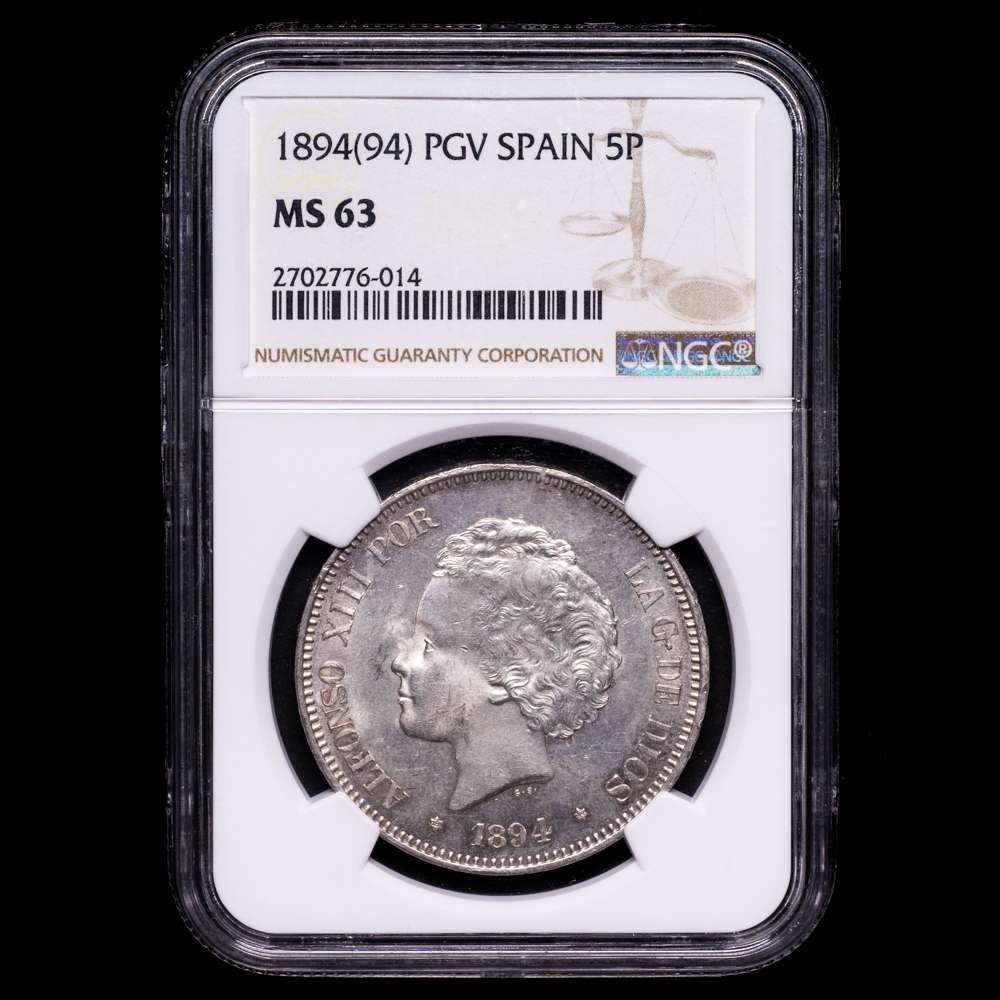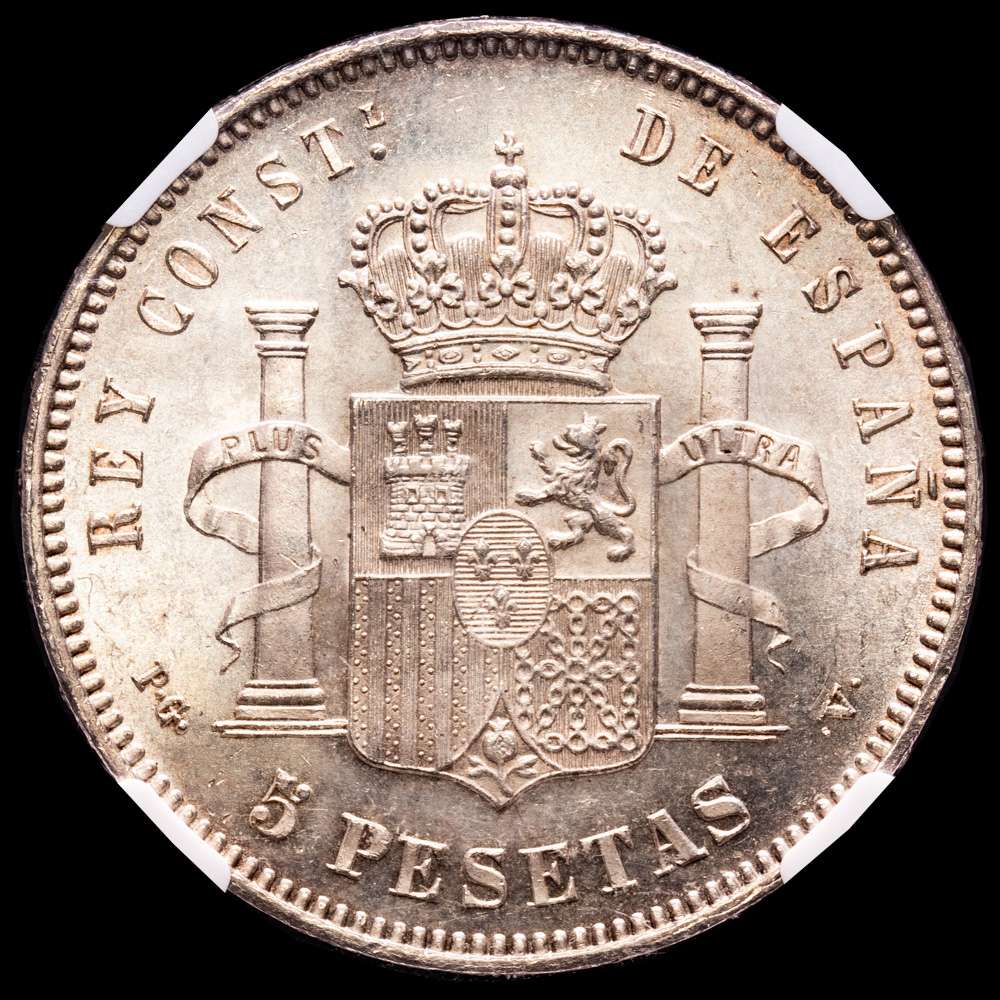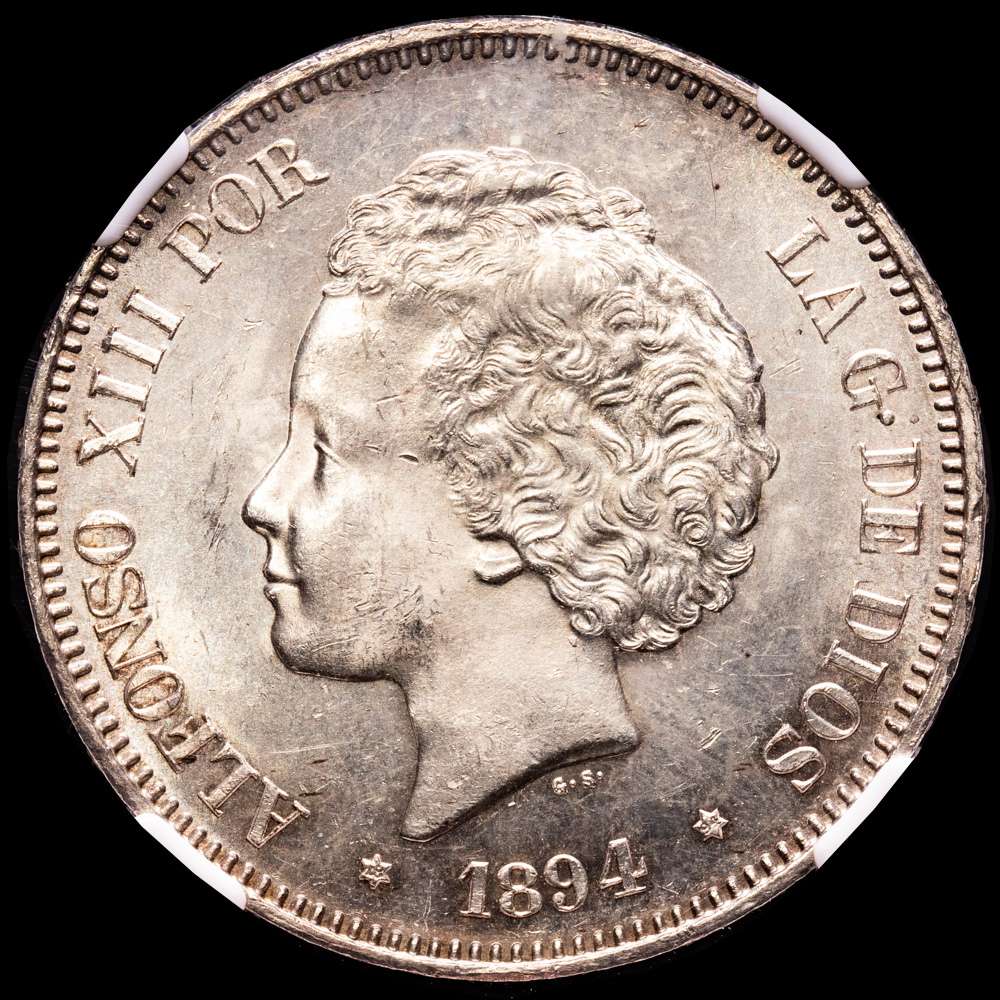 Centenario de la Peseta (1868-1931). Alfonso XIII (1886-1931). 5 pesetas. 1894*18-94. Madrid. PGV. (Cal-104). Ag. 25,00 g. Pleno brillo original. Encapsulado por NGC MS 63. Rara así.