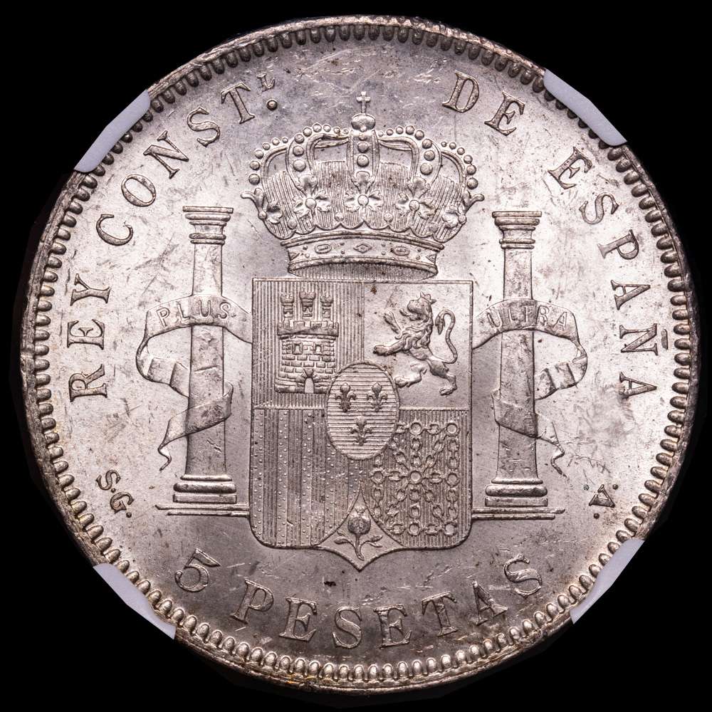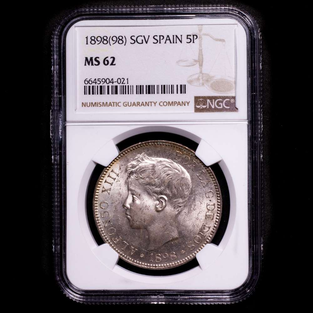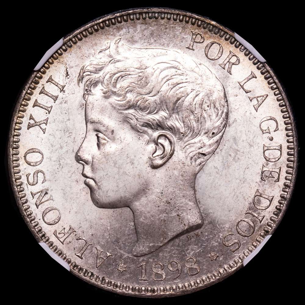 Centenario de la Peseta (1868-1931). Alfonso XIII (1886-1931). 5 pesetas. 1898*18-98. Madrid. SGV. (Cal-109). Ag. Brillo original. Encapsulada por NGC como MS 62.