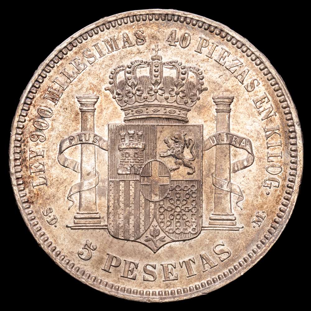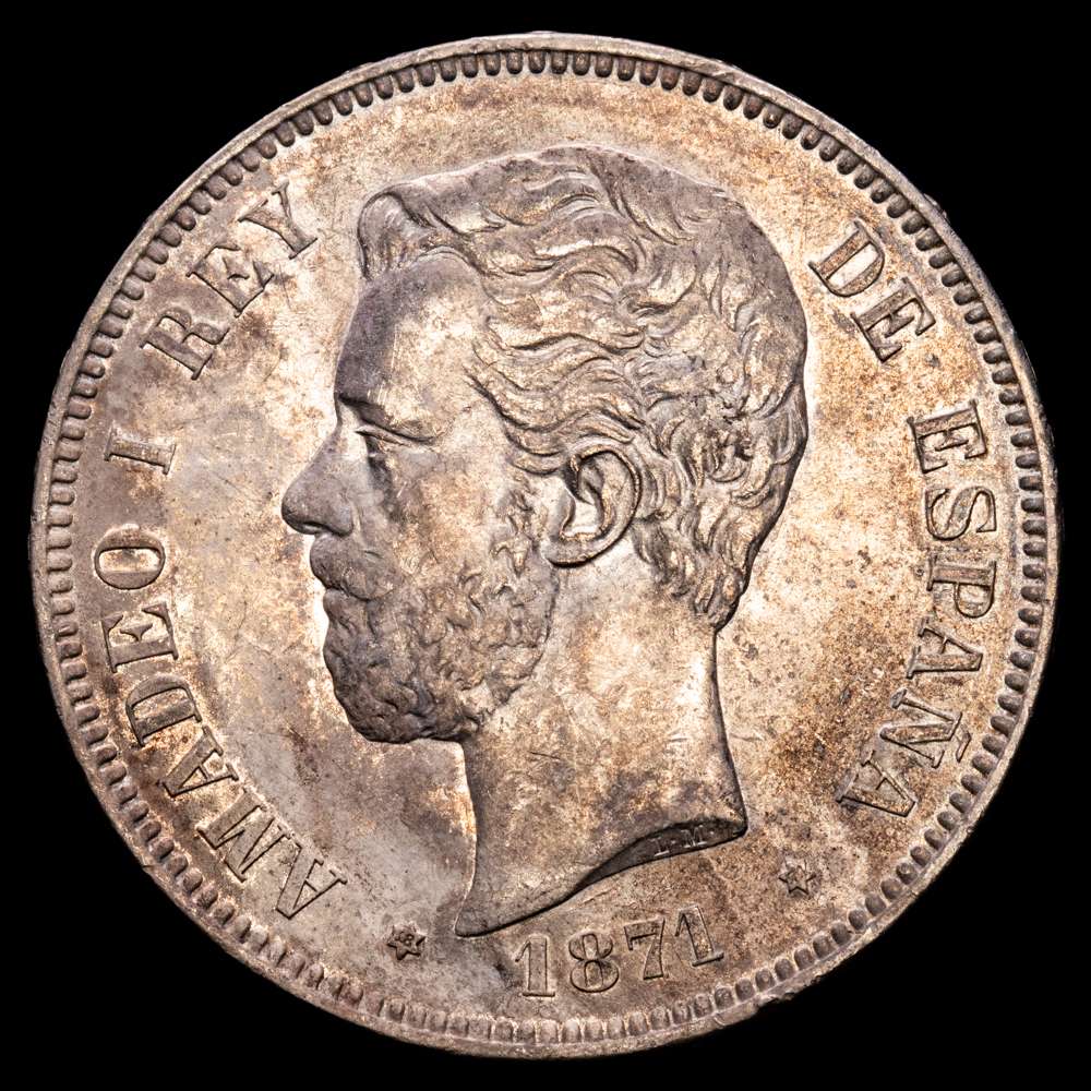 Numismática Barcala > Productos > Centenario de la Peseta (1868-1931). Amadeo I (1871-1873). 5 pesetas. 1871*18-71. Madrid. SDM. (Cal-1). Ag. 25,09 gramos. Pátina oscura. EBC/EBC+.