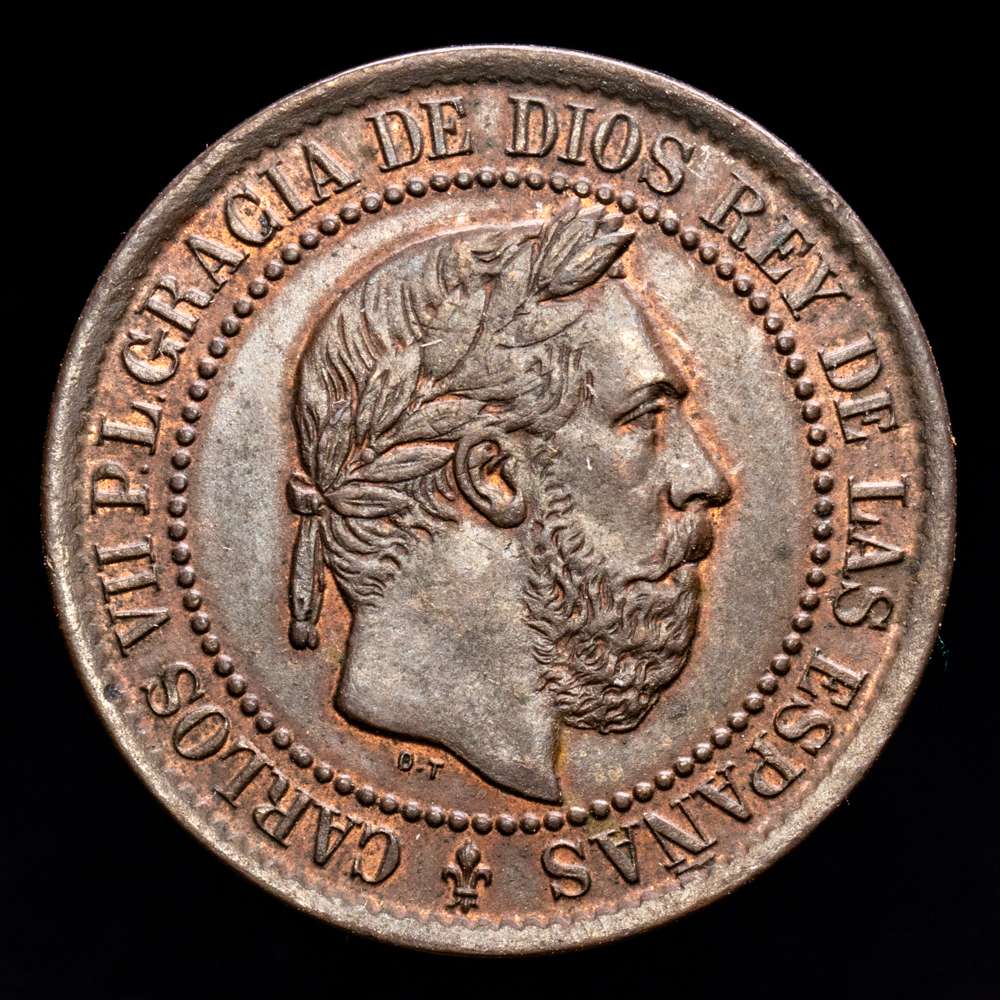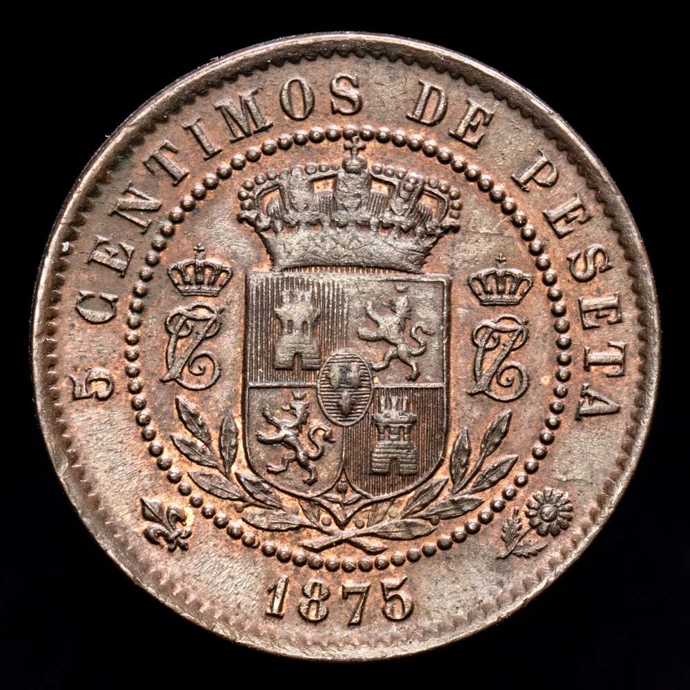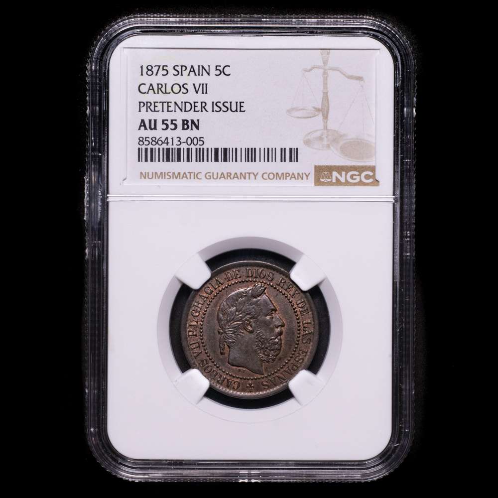 Centenario de la Peseta (1868-1931). Carlos VII (1872-1876). 5 céntimos. 1875. Oñate. (Cal-2). Ae. Encapsulada por NGC como AU 55 BN.