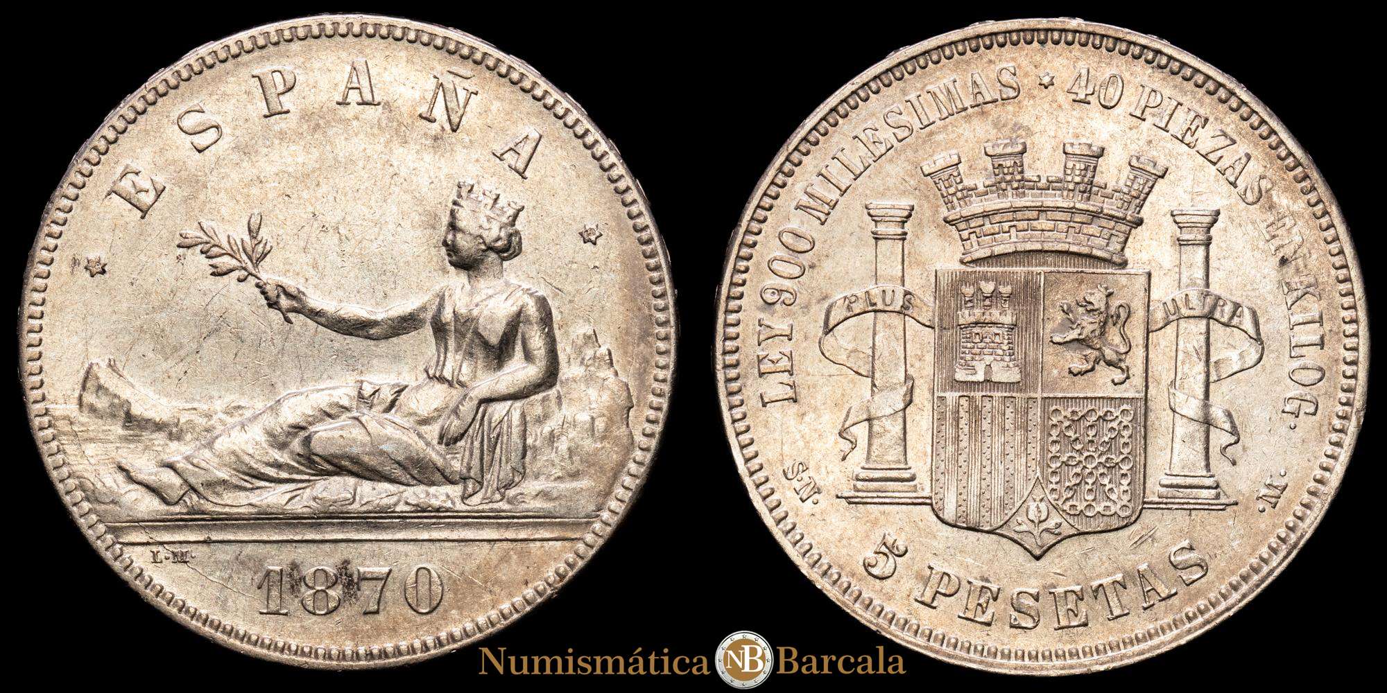 Centenario de la Peseta (1868-1931). Gobierno Provisional (1868-1871). 5 pesetas. 1870*18-70. Madrid. SNM. (Cal-39). Ag. 24,86 gramos. MBC+.