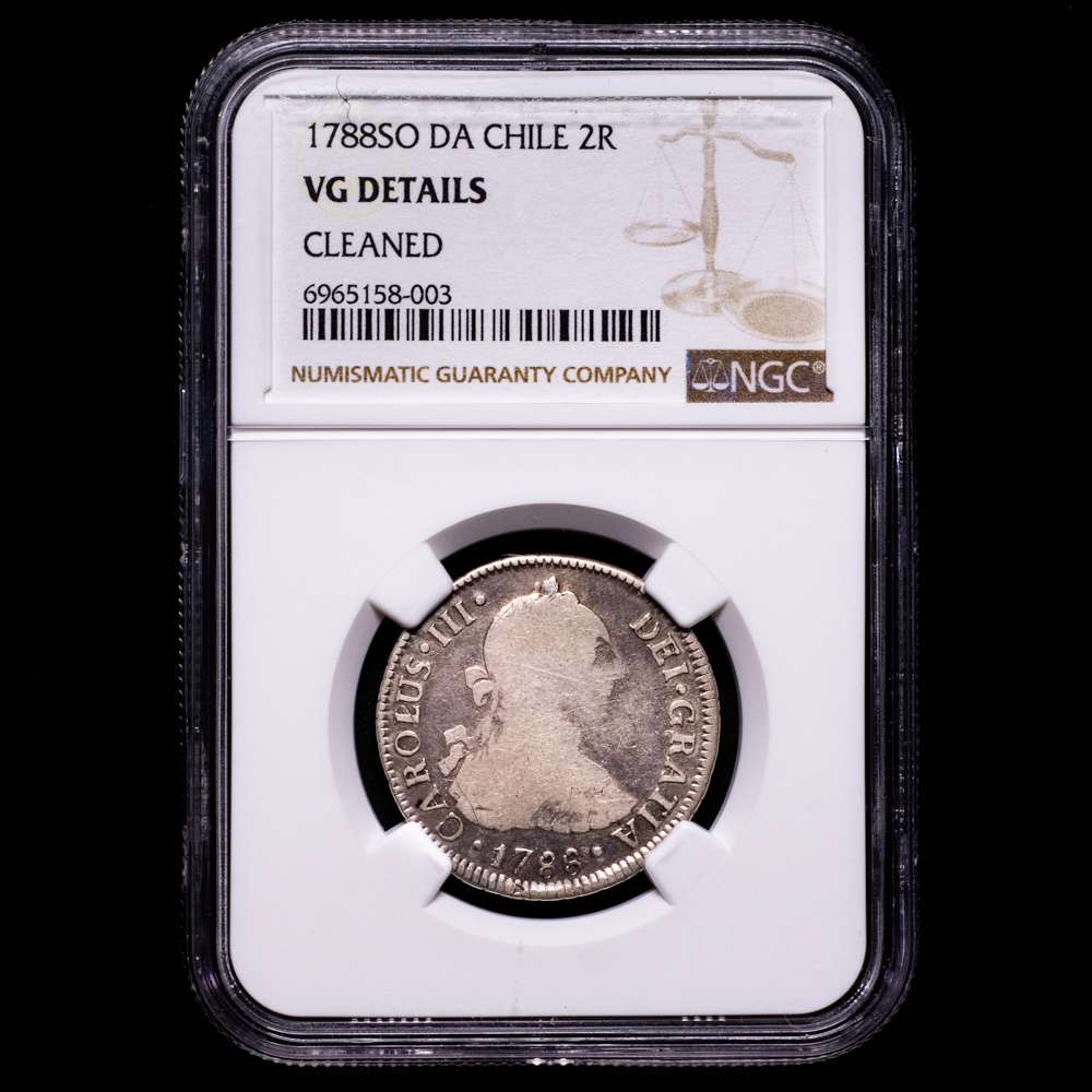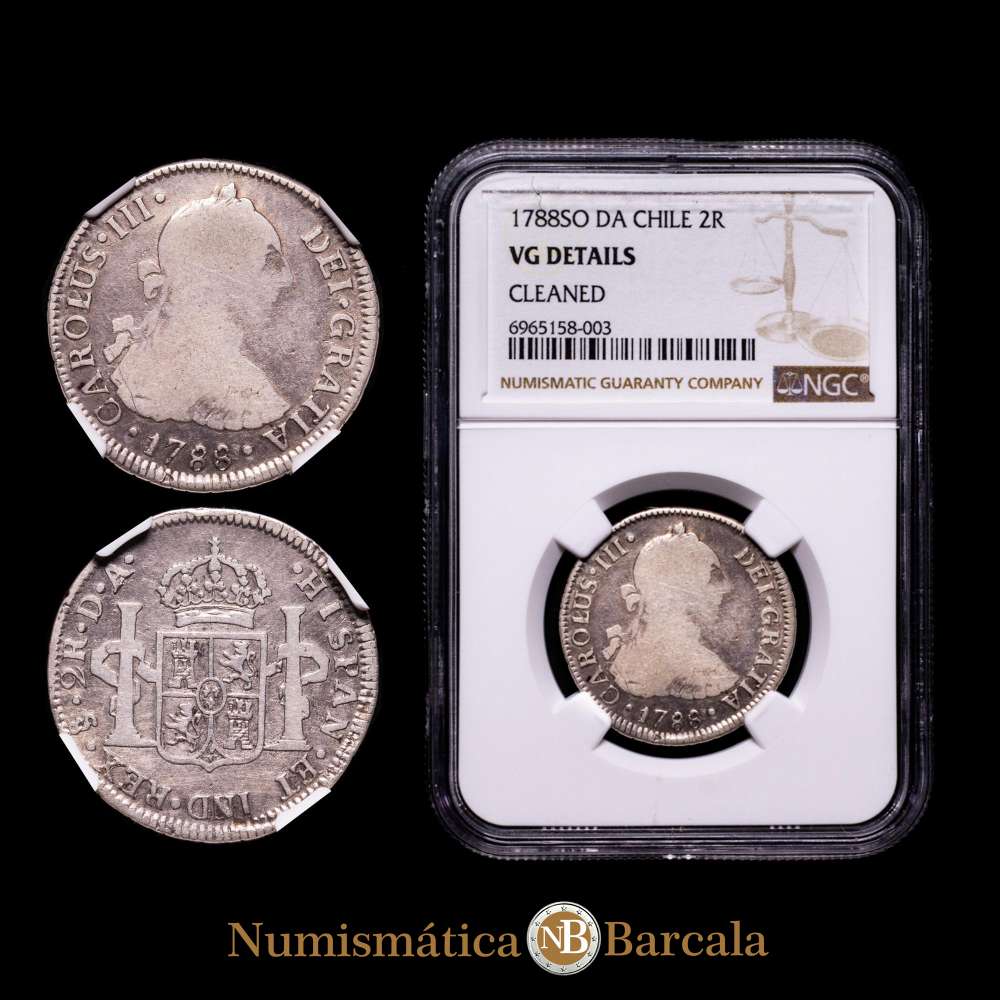 Numismática Barcala > Productos > CHILE. 2 Reales, 1788-04 DA. Ceca de Santiago. Carlos III. Encapsulada por NGC como VG Detalles–Limpiada. KM-30.