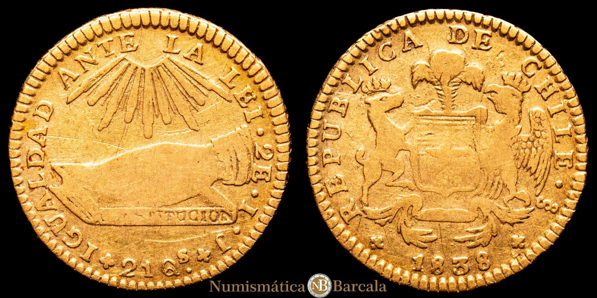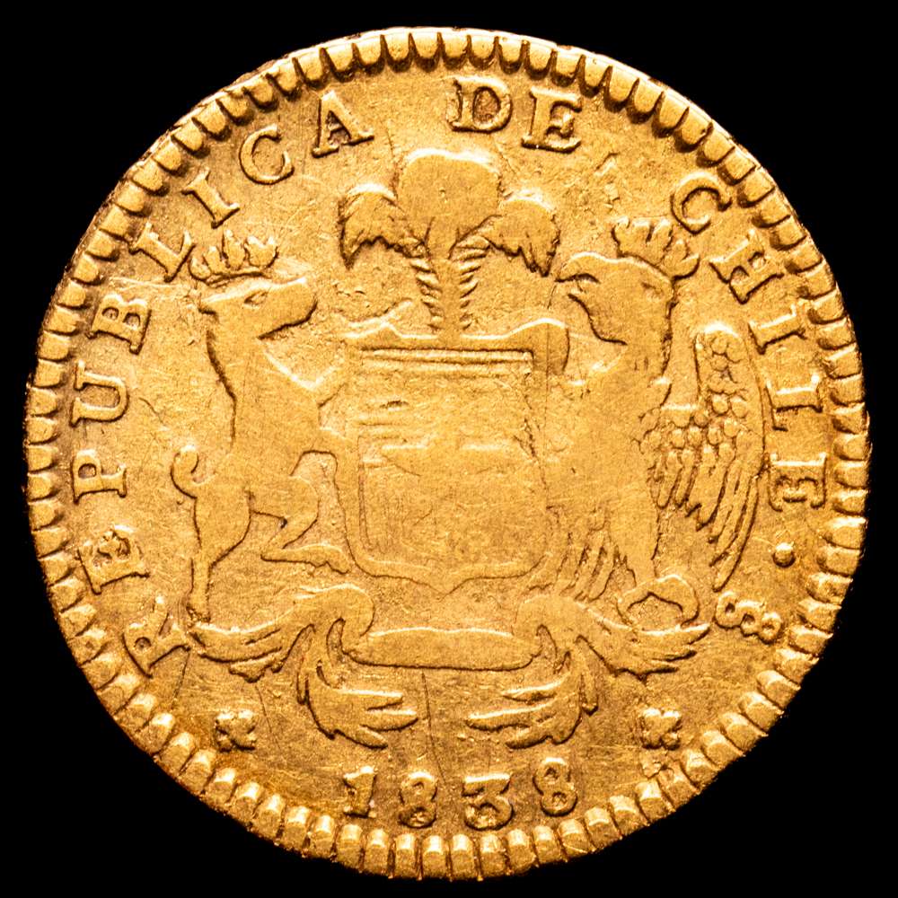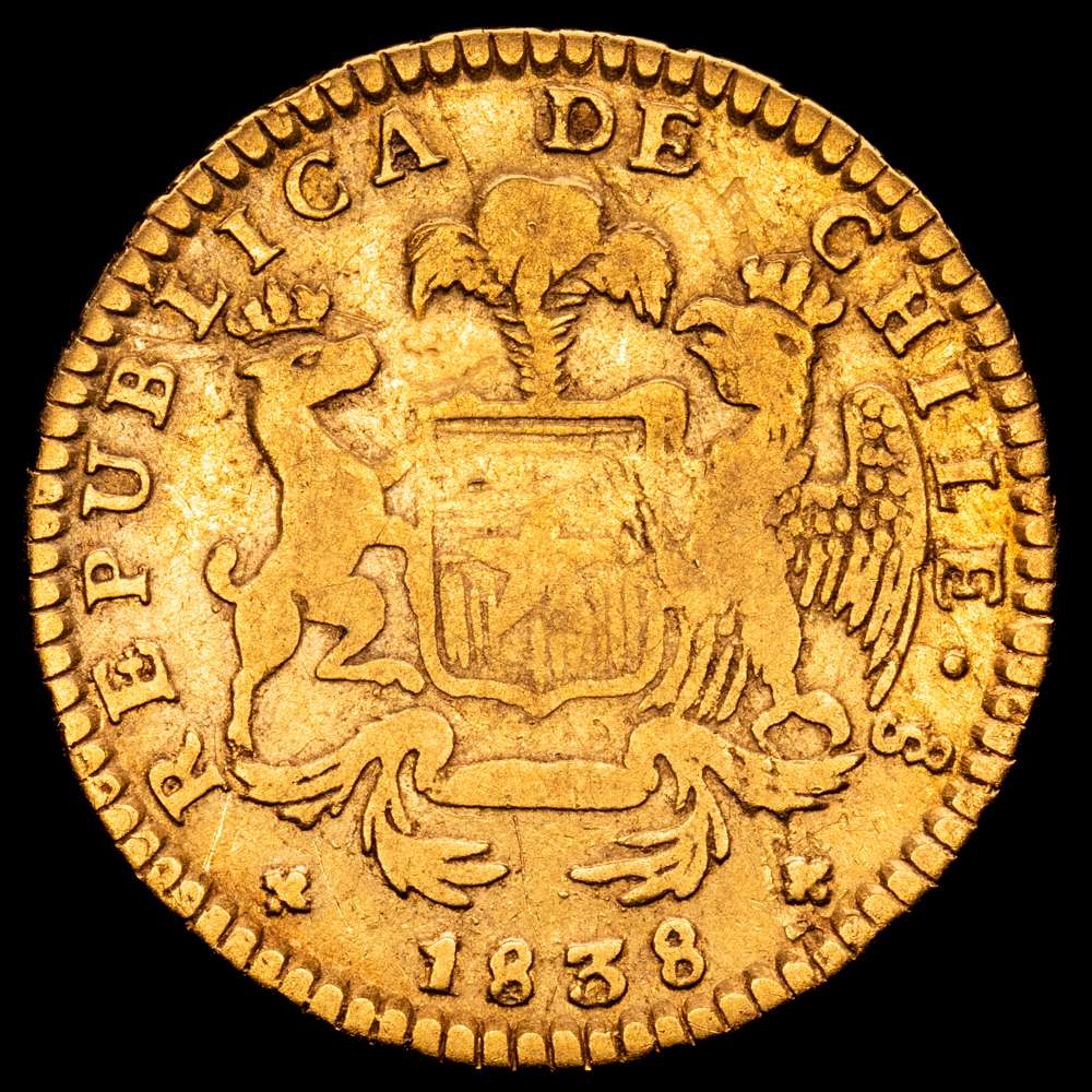 Numismática Barcala > Productos > Chile, Santiago. 2 Escudos 1838 IJ. Diseño “Mano sobre la Constitucion” Cantidad acuñada: 3.449. Oro 875; 22.5mm; 6.61 gr. (Km-97). (Fried-39). VF.