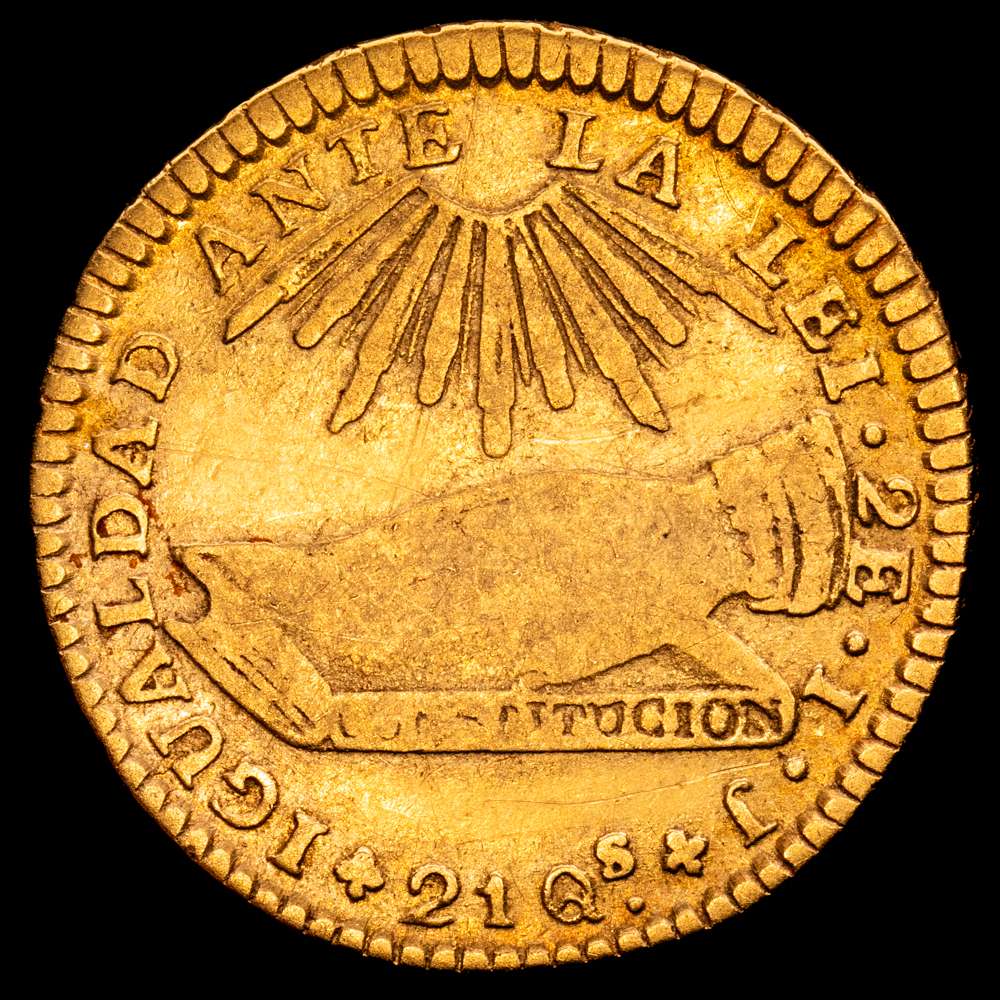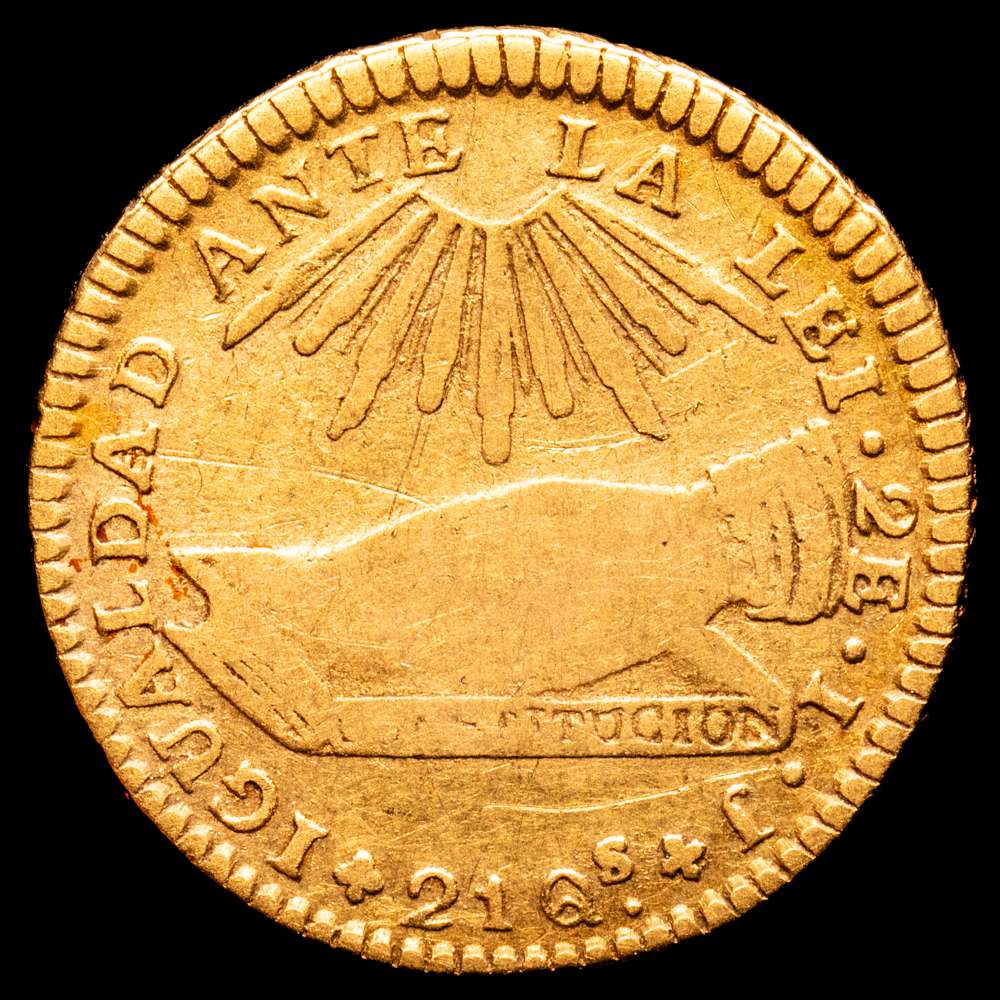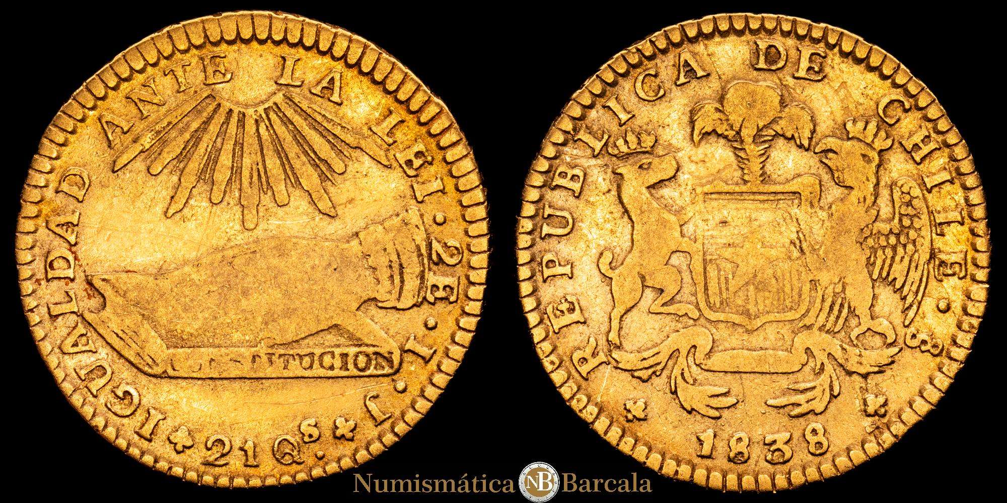 Numismática Barcala > Productos > Chile, Santiago. 2 Escudos 1838 IJ. Diseño “Mano sobre la Constitucion” Cantidad acuñada: 3.449. Oro 875; 22.5mm; 6.61 gr. (Km-97). (Fried-39). VF.