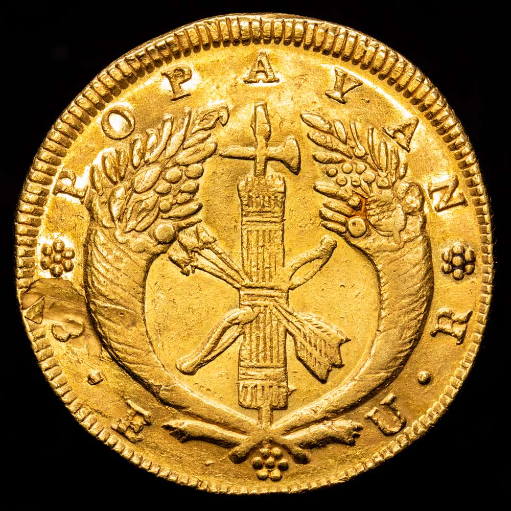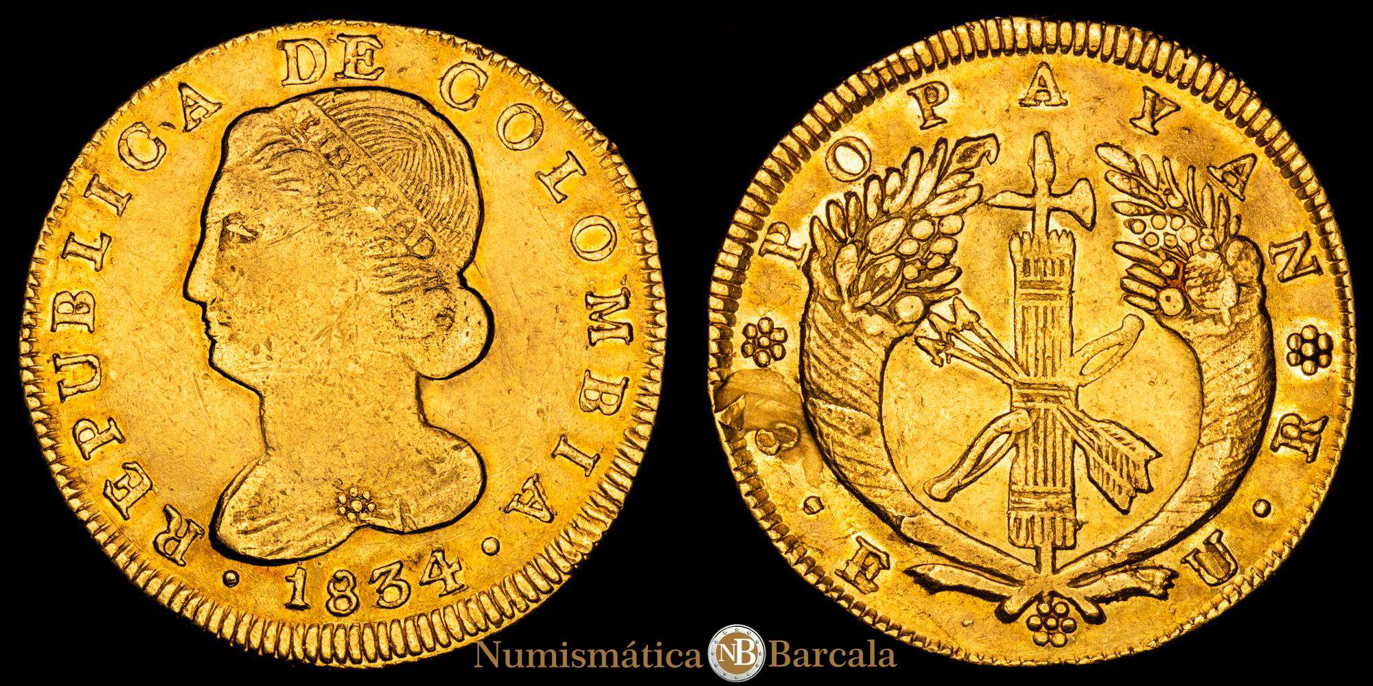 Colombia. 8 escudos. 1834. Popayán. UR. (Km-82.2). (Fr-68). Au. 26,91 gramos. 36 mm. Hoja en anv. y pequeñas marcas. R.B.O. VF+.