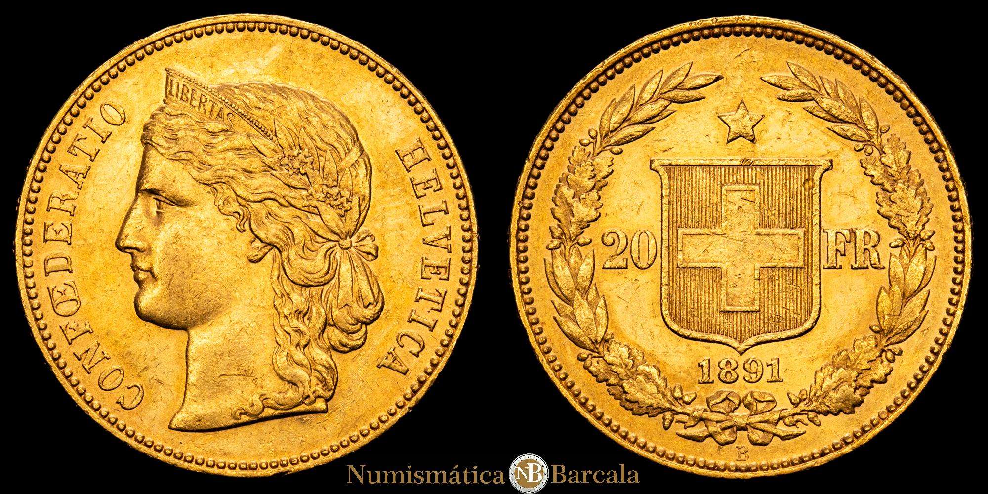 Confederación Suiza. Moneda de 20 francos (21 mm, 6,45 g, 6 h). Ceca de Berna. Fechada en 1891. Cabeza de Helvetia con diadema y corona a la izquierda / Escudo de armas; estrella arriba; todo dentro de la corona. HMZ 2-1194 g; KM 31,3; Friedberg 495. Ligeramente tonificada con brillo subyacente, marcas de contacto, AU.