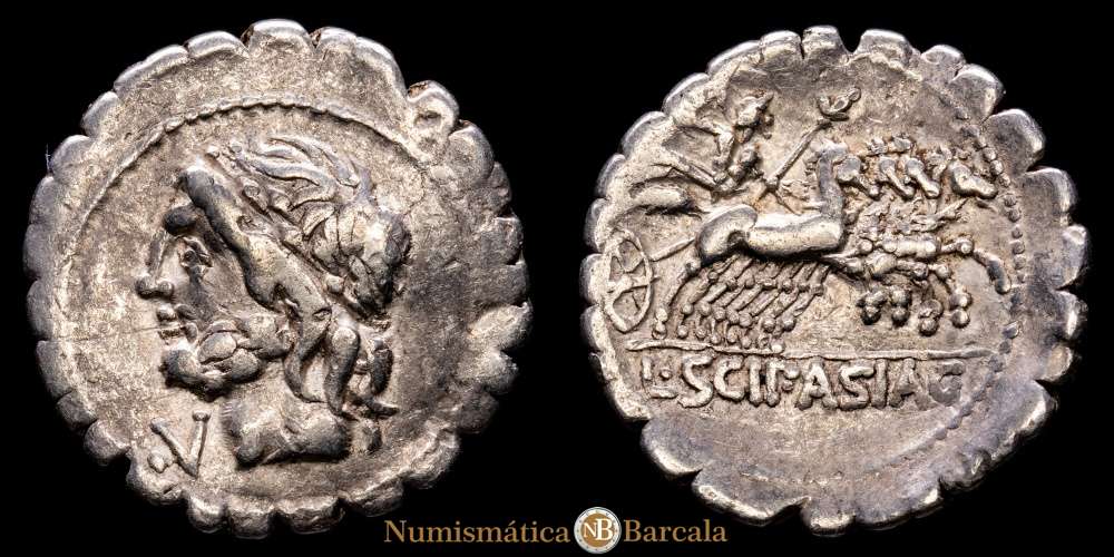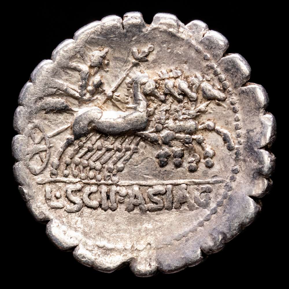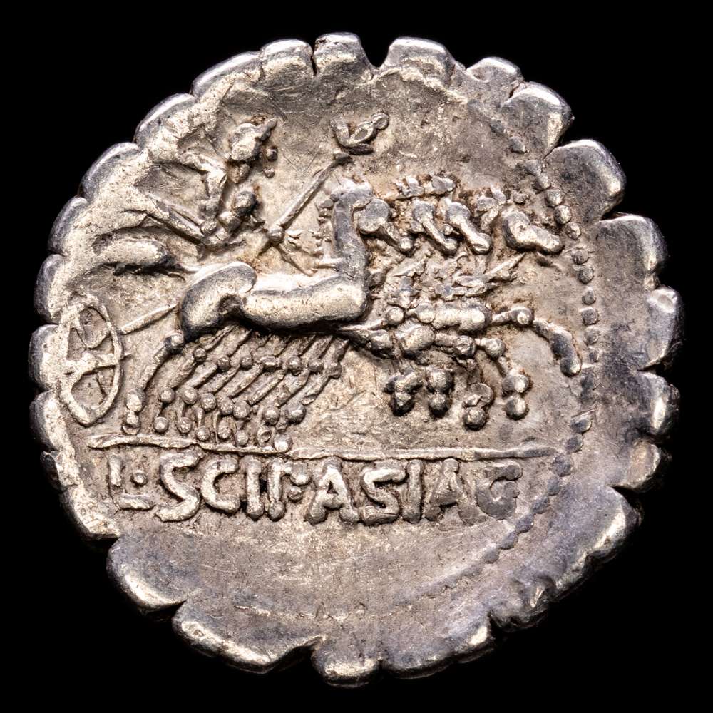 CORNELIA. L. Cornelius Scipio Asiagenus. Denario (3,95 g.). Roma, 106 a.C. Anv.: Cabeza laureada de Júpiter a izquierda. Rev.: Júpiter en cuadriga a derecha con cetro y rayo, encima letra F con punto debajo. En exergo: L. SCIP. ASIAG. Ligera pátina brillante. BMC-1381-98; Cal-473; Craw-311/1c; FFC-612; Se-24. EBC+/EBC.